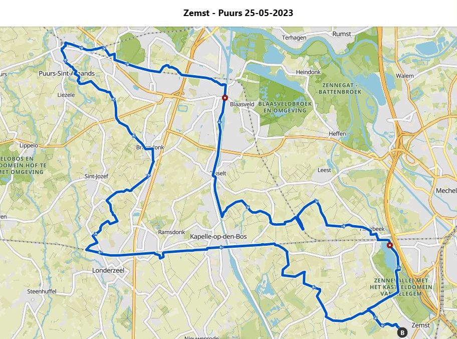 Afwisselend rijden we op rustige wegen en door enkele natuurgebieden via Kapelle-op-den-Bos, Londerzeel Sint-Jozef, Breendonk, Liezele, Puurs, Willebroek, Tisselt en Hombeek.