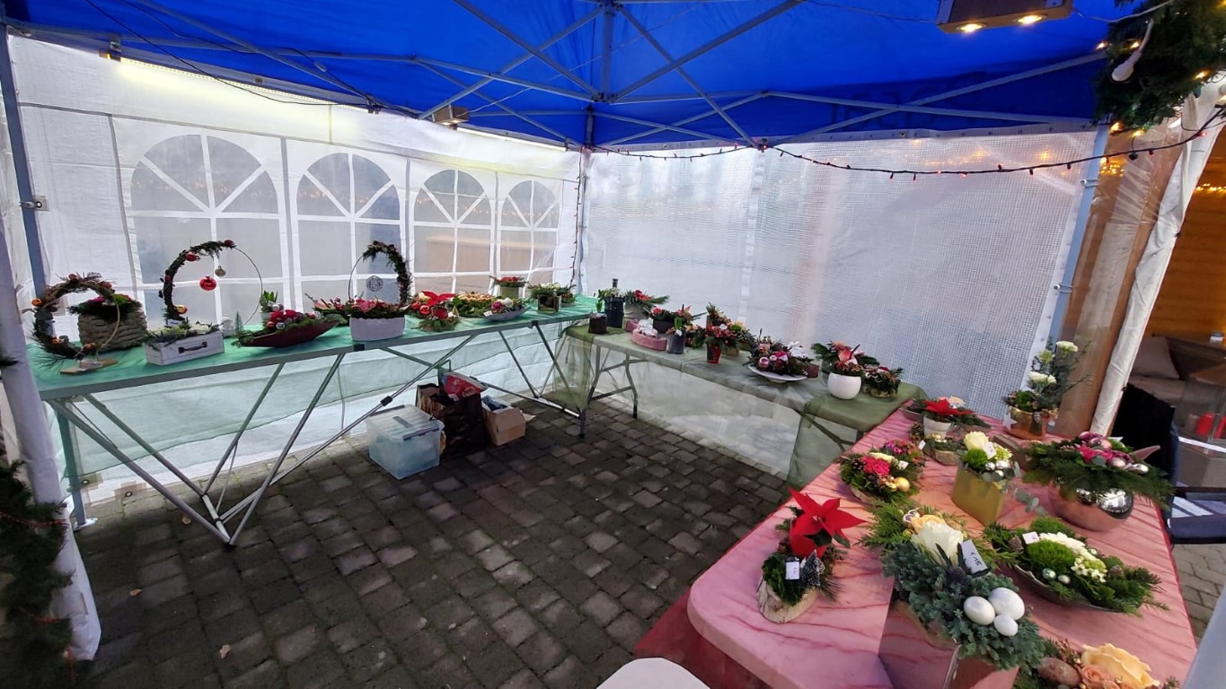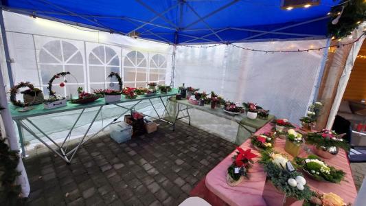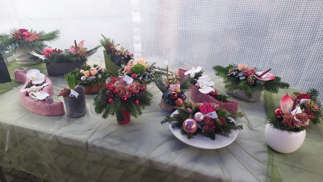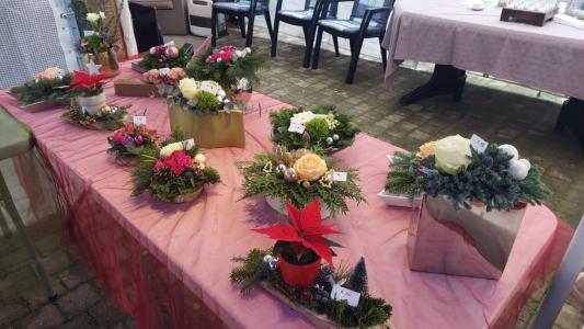 Kerst-bloemstukjes te koop (op bestelling of ter plaatse), kaarsen en advocaat.