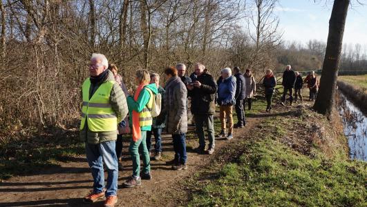 We wandelde eerst in stilte gebied naar de uitkijktoren, daarna langs de Stekense vaart en bossen naar Klein-Sinaai. Langs de Moervaart en Stekense vaart keerden we terug.