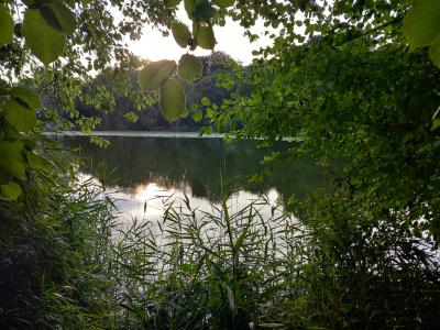We wandelen langs een mooie vijver en over mooie hellingen in een bosrijk gebied. Ondertussen genieten we van de zon die ondergaat.