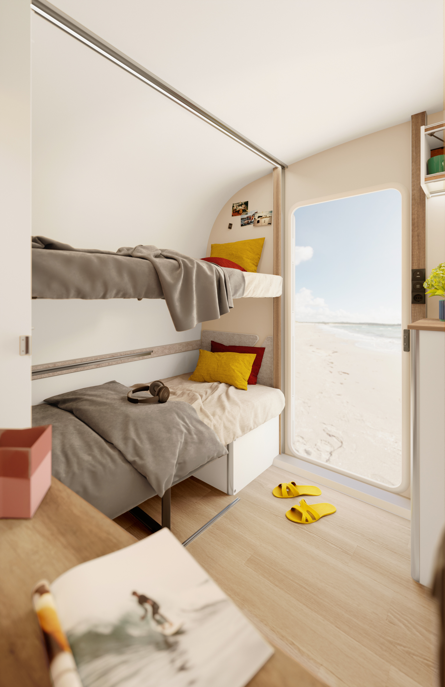 Het model combineert een fris, kleurrijk interieur met een stapelbed voorin, wat het tot een ideale gezinscaravan maakt. Bovendien kan je de ruimte ook omvormen tot een leuke zitbank of een garage. Voor de Beachy 360 tot en met de Beachy 450 blijven bovendien de speciale decal-opties beschikbaar, zodat je je caravan een persoonlijke en speelse uitstraling kan geven.