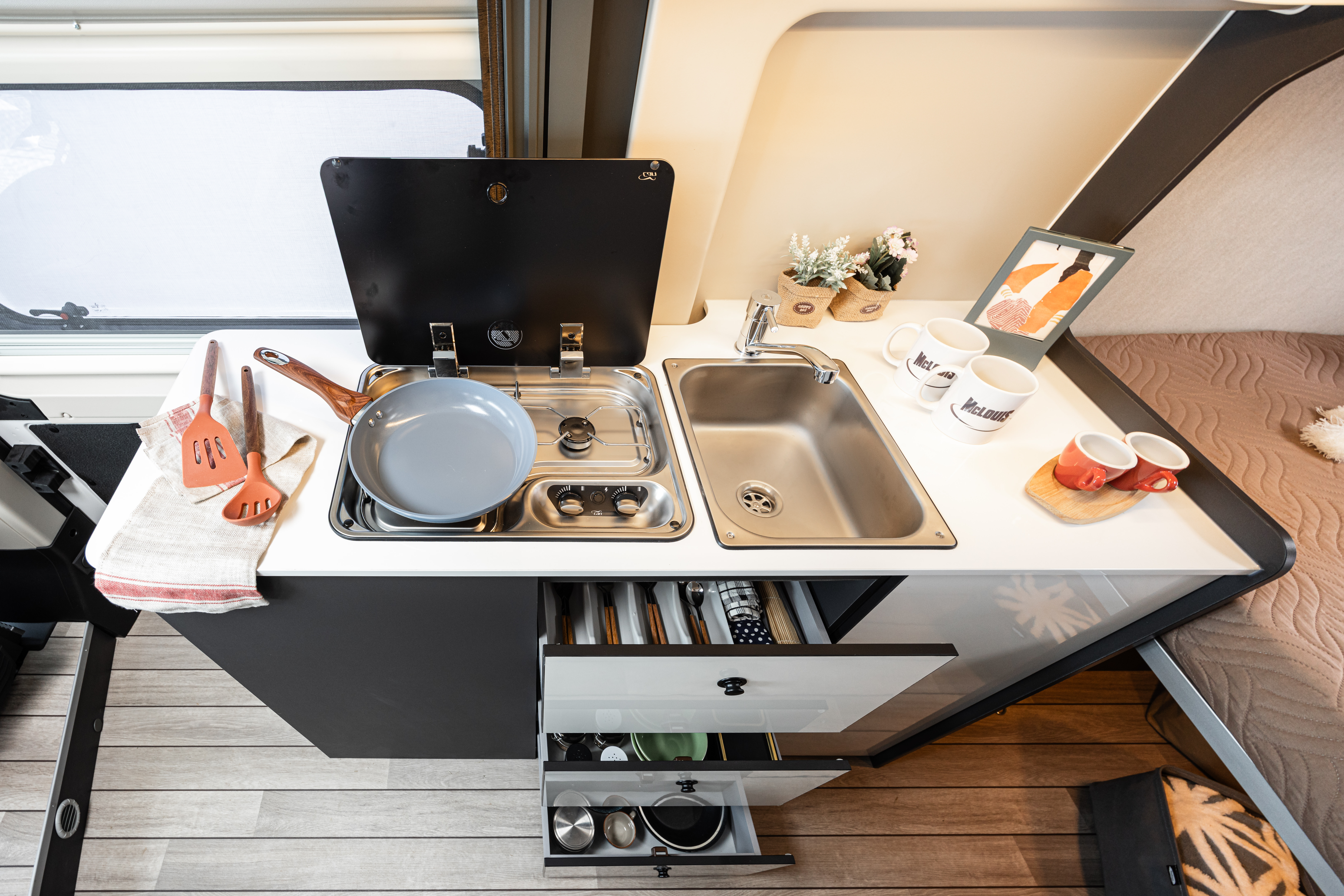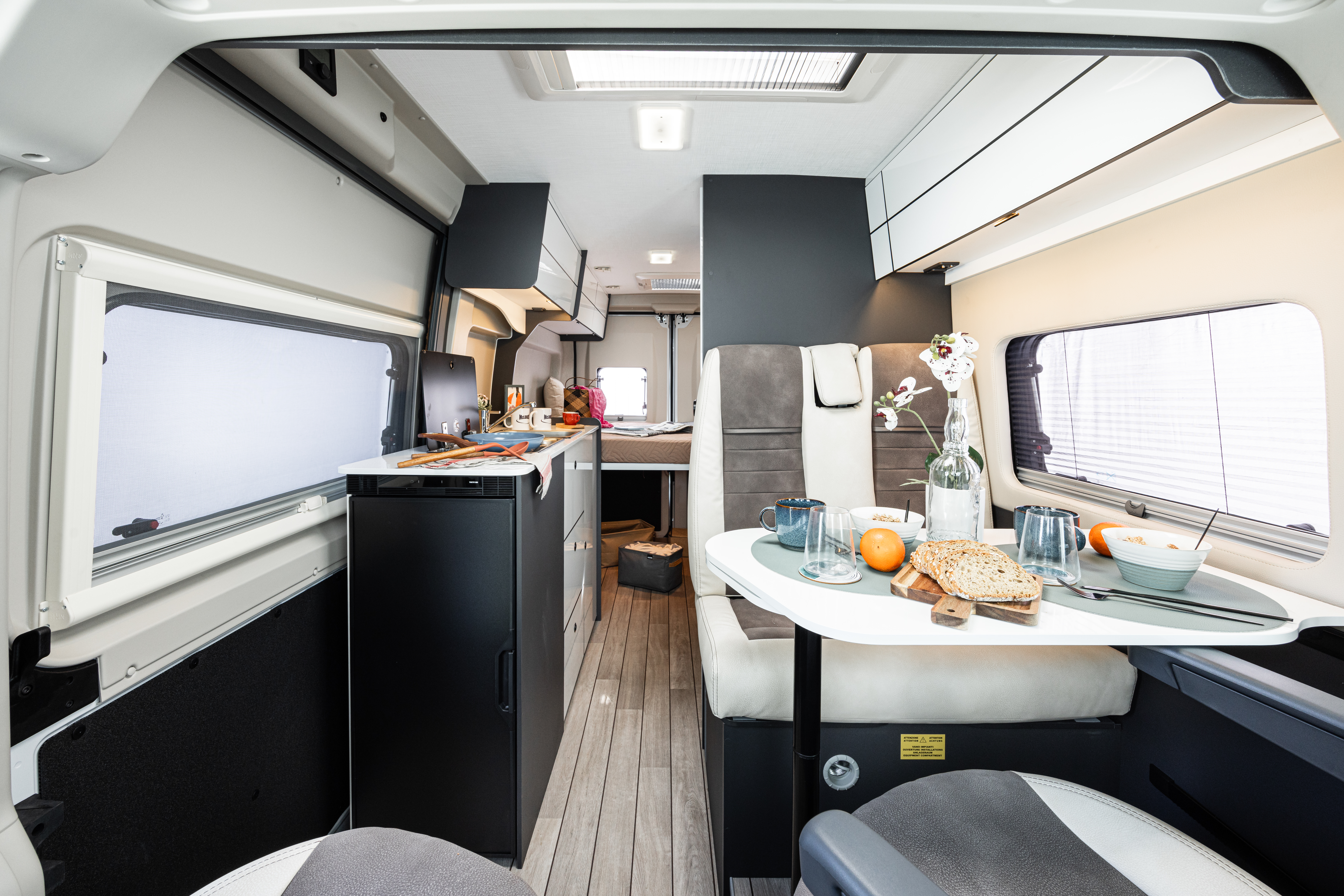Gebouwd op Citroën Jumper (vanaf 140 pk) en beschikbaar in lengtes van 5,41 tot 6,36 m, combineren ze een modern interieur met lichte kleuren, greeploze bovenkasten en geïntegreerde ledverlichting. De keuken is functioneler met een 84‑liter koelkast met een deur die 180° opent, toegankelijk van binnen én buiten. Door het verwijderen van de opbergbox onder de tafel is er meer beenruimte, terwijl de slimme uitlijning van werkbladen en kasten alles rustiger en overzichtelijker maakt. Ook kastdiepte, verlichting en afwerking werden geoptimaliseerd.