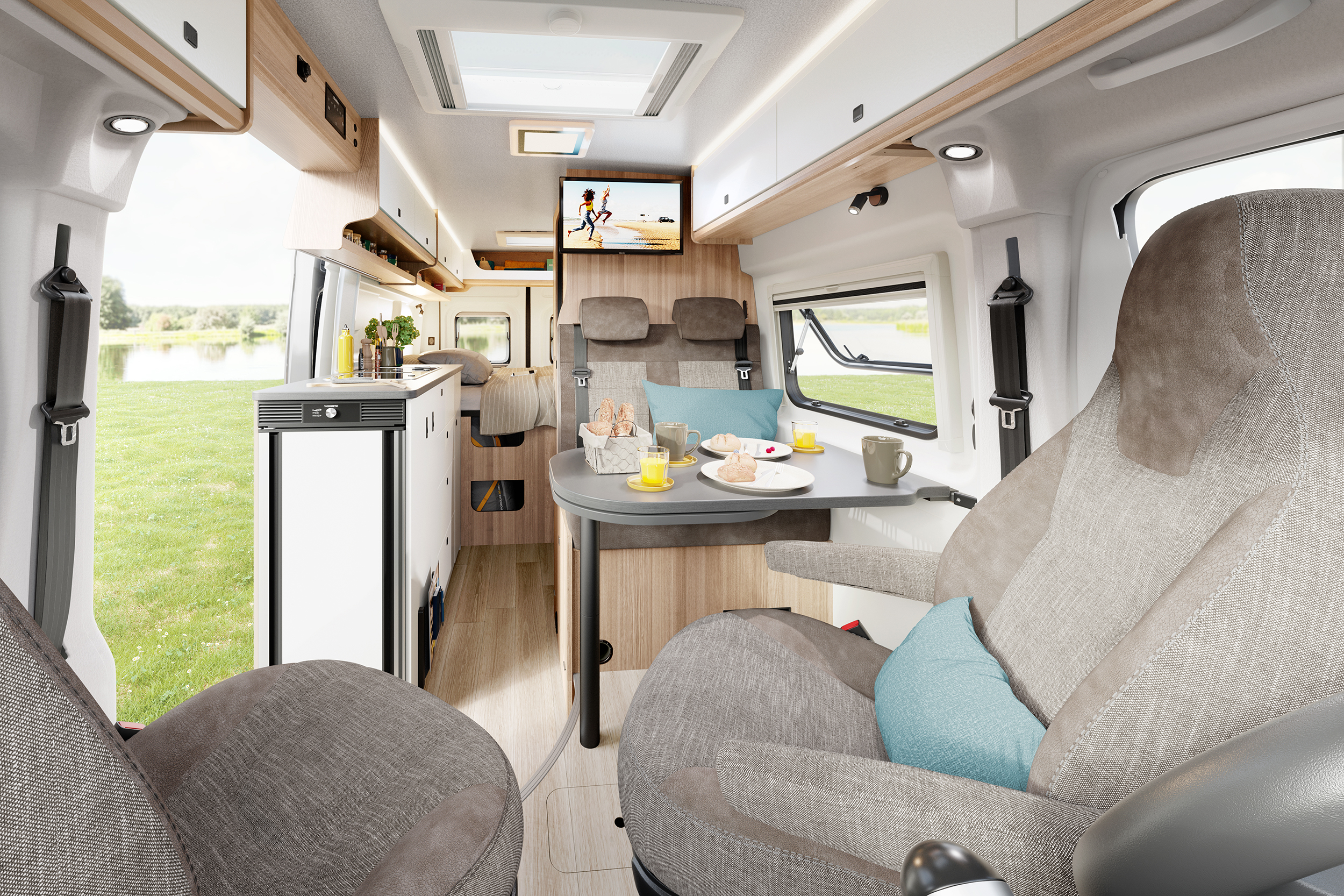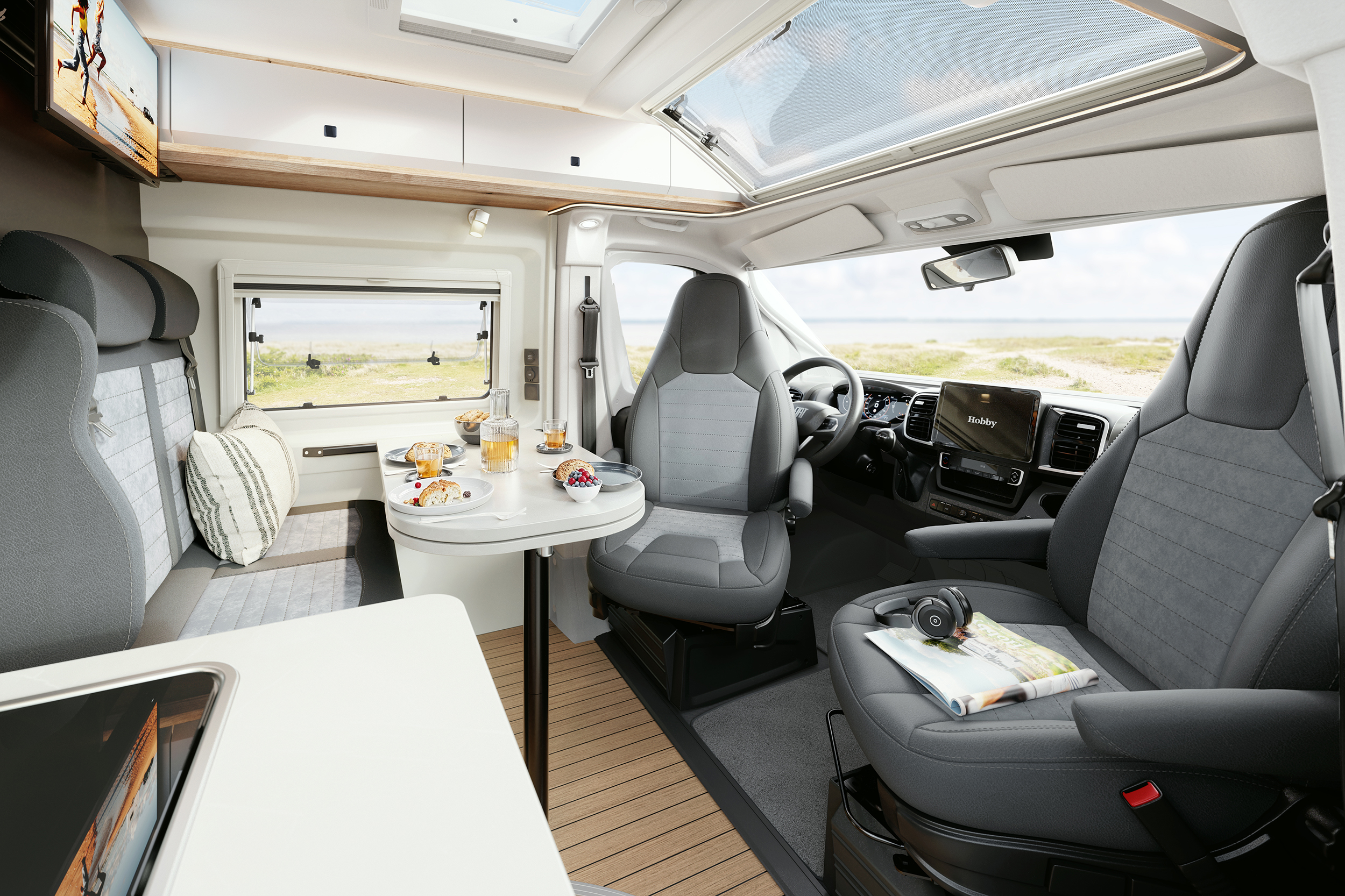 Dankzij de draaibare wastafel ontstaat er een volwaardige natte cel, met een waterdichte lamellendeur die de natte en droge zones van elkaar scheidt. Als extra comfortoptie is het populaire Hobby-Top panoramadakraam nu ook verkrijgbaar. Technische upgrades omvatten moderne veiligheids- en assistentiesystemen, de handige 2-in-1 Dometic-lader, en (afhankelijk van het model) het 7-inch touchpaneel. Deze functies zijn interessant als je graag off-grid reist: ook bij een lege voertuigaccu kan je weer snel op pad.