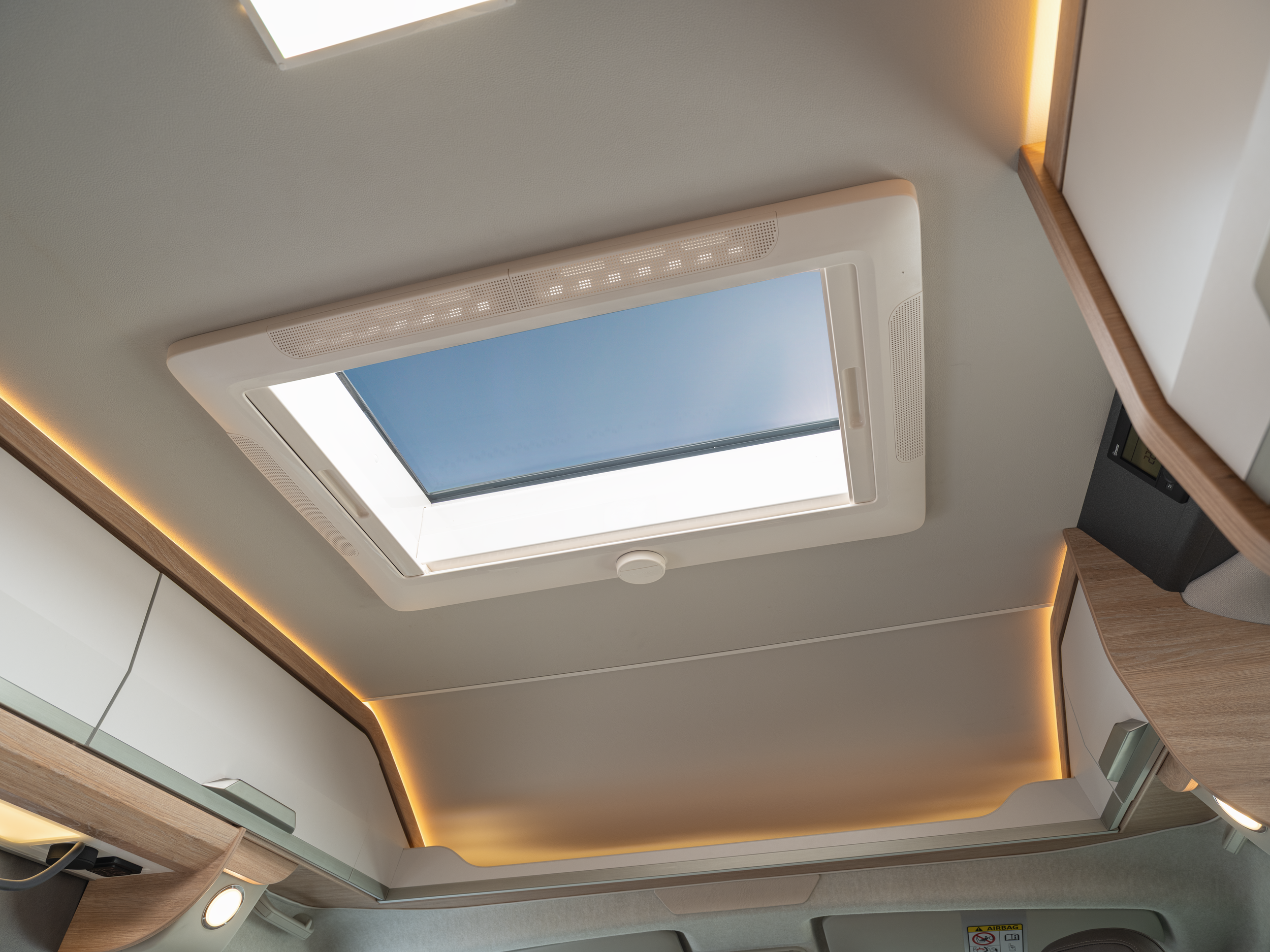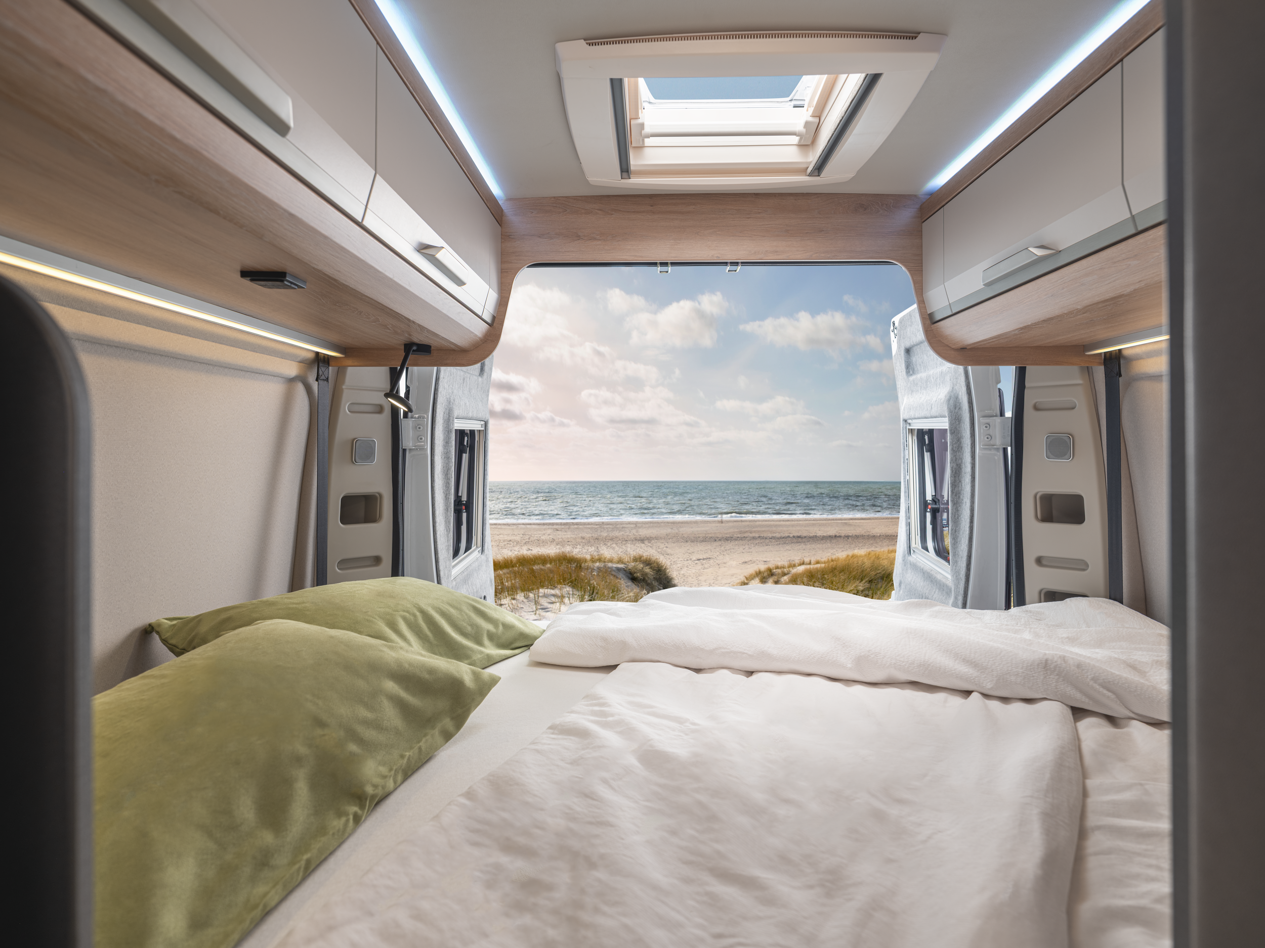 Deze innovatie verlaagt het gewicht met zo’n 60 kg zonder in te boeten op comfort of stevigheid, en vermindert het buitengeluid tot 3 dB(A). Slankere bovenkasten creëren extra bewegingsruimte, vooral tussen keuken en badkamer, terwijl het interieur dankzij het EasySpace-front en panoramaraam open, modern en goed verlicht oogt. De stijlvolle badkamer met draaibare wand heeft luxe sanitaire voorzieningen, het optionele of standaard elektrische hefbed achteraan met verstelbare hoogte heeft een comfortabel matras op schotelveren. De Boxtime is beschikbaar in vier indelingen.