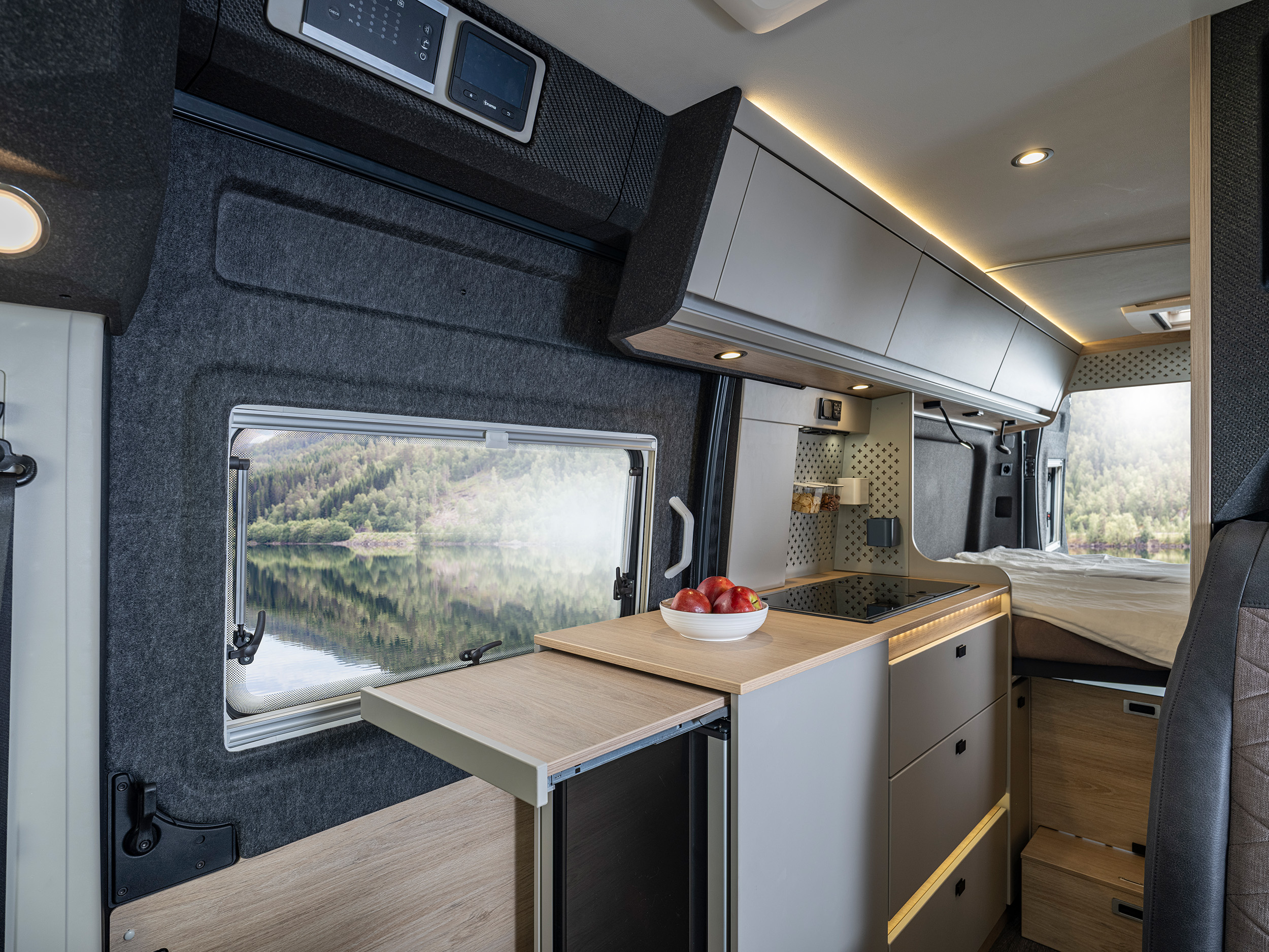 De Boxlife wordt in 2026 nog veelzijdiger. Verkrijgbaar in vijf indelingen, met standaard dieselverwarming en een slimme slide-out zitbank, heeft hij optioneel een hefbed achteraan voor extra bergruimte of een ruim bed. Het badkamerconcept met scharnierende wand zorgt voor een volwaardige douche-ervaring, de keuken heeft over een 2‑pits kookplaat en een optionele koelkast tot 138 liter.