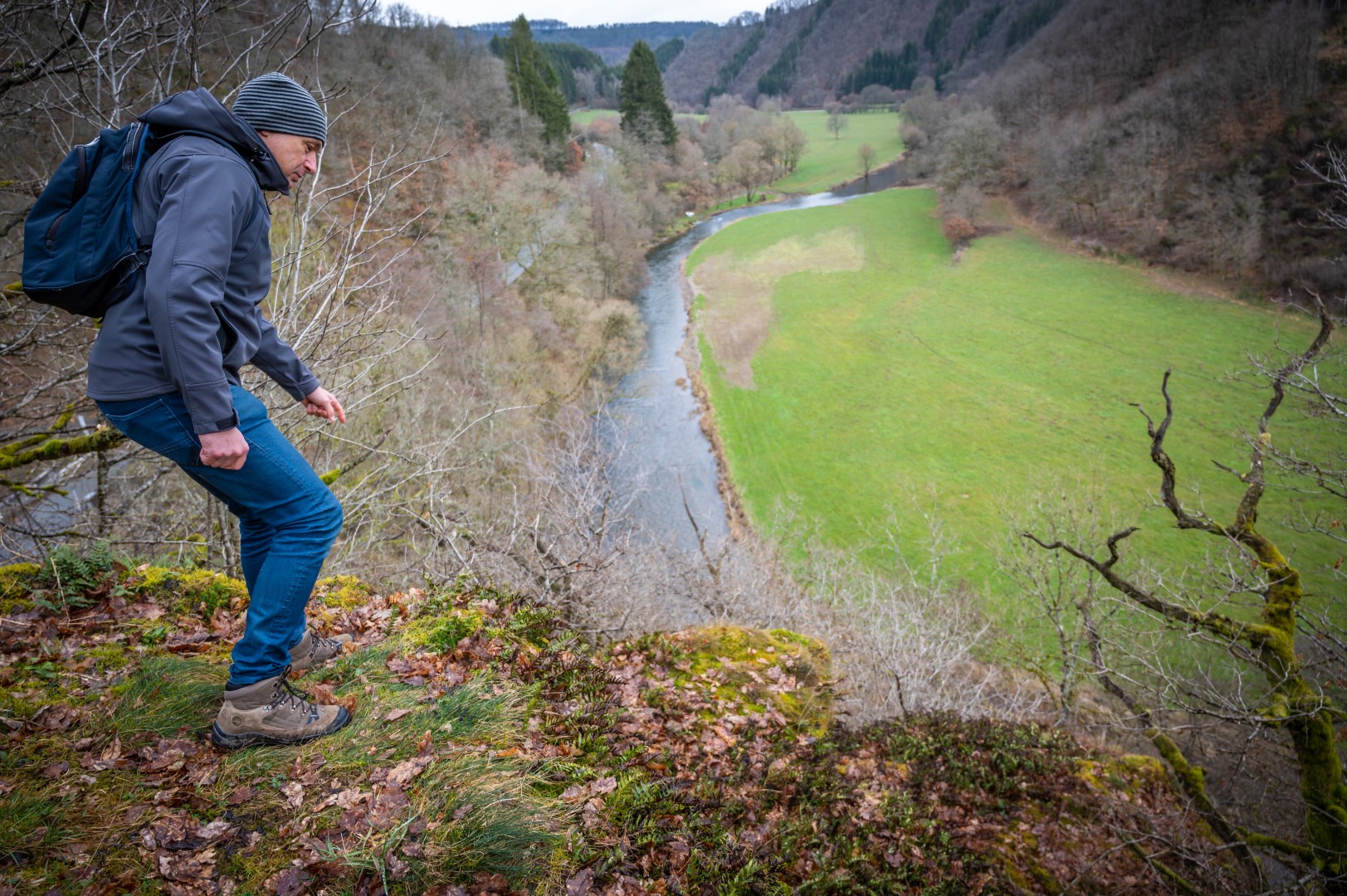 We volgen de knooppunten Luxemburg in. Niet over de weg, die er in het Groothertogdom duidelijk beter geasfalteerd bijligt, maar het bos in. Hier en daar zijn forse stukken gekapt en vervangen door nieuwe aanplant. En er zijn zitpalen voor roofvogels. We dalen ergens ongemerkt weer België in, om weer te klimmen naar een panoramische wandelweg met zicht op de Our en daarachter Duitsland. Het voordeel van een winterwandeling: door de kale bomen heb je meer uitzicht en is het bovendien lichter dan ooit in het dichte bos.