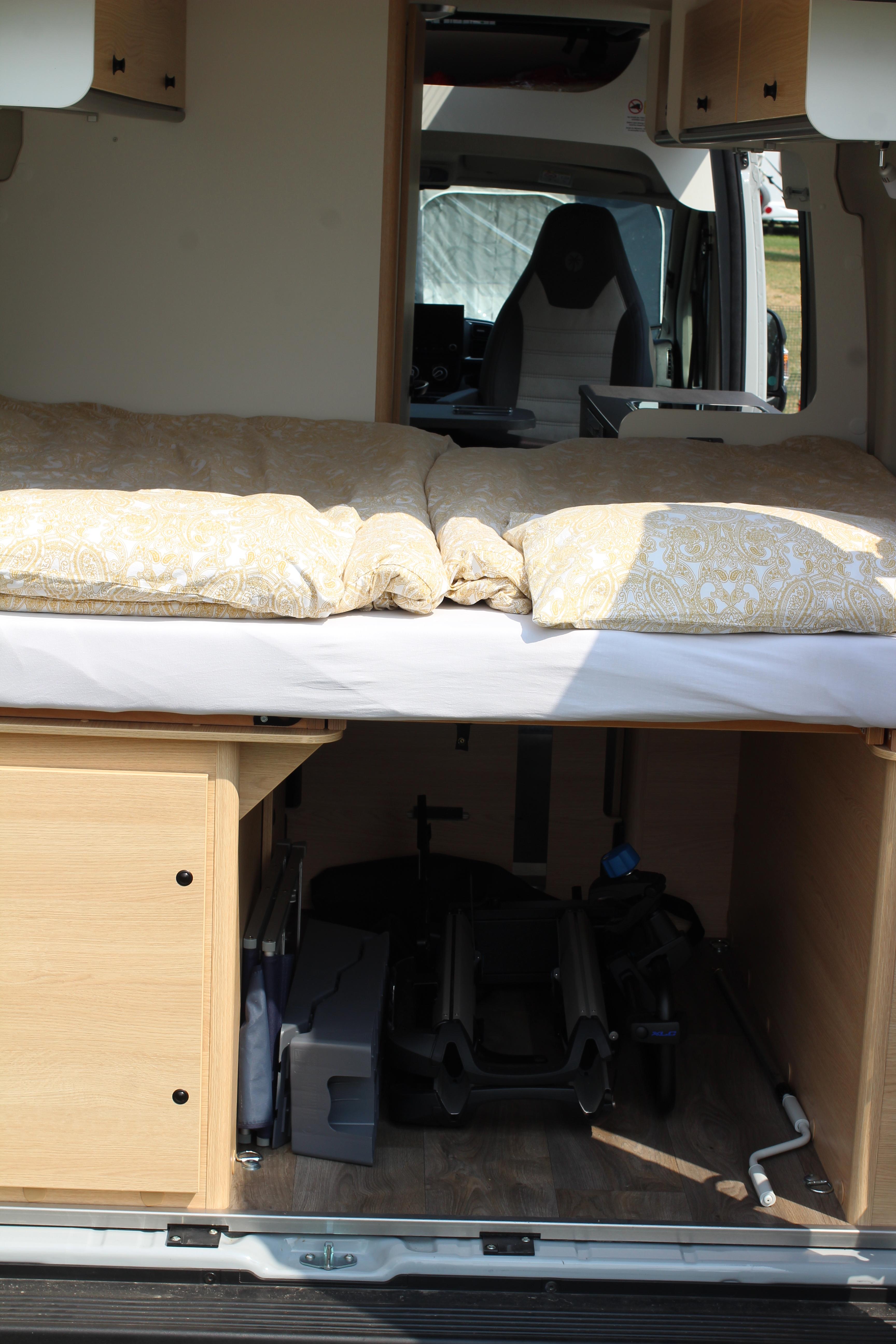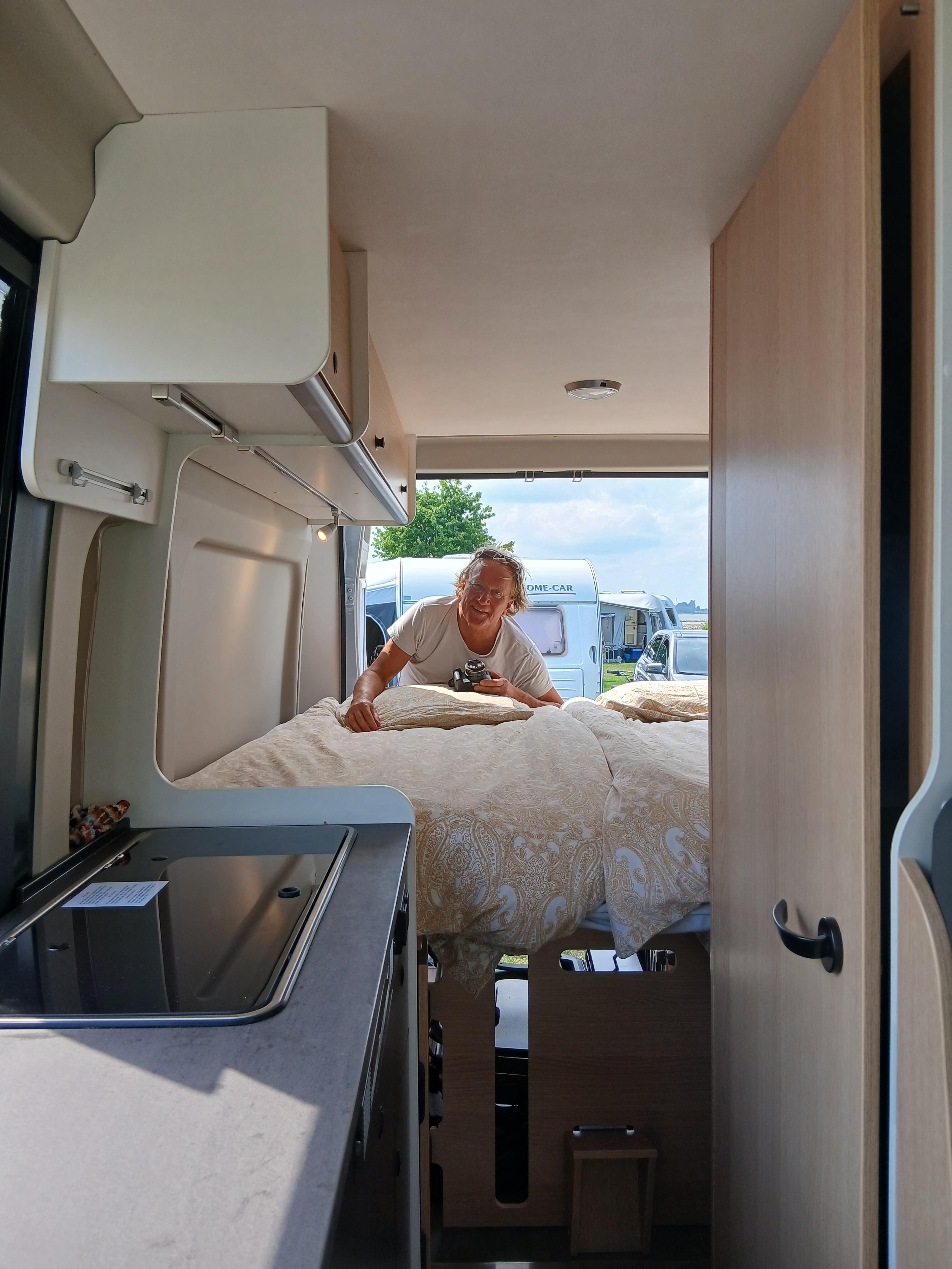 De hefdaktent verdubbelt de slaapcapaciteit van deze compacte camperbus van twee naar vier personen. Want achterin bevinden zich nog twee eenpersoonsbedden, in de lengterichting, respectievelijk 187 en 190 lang. Prima voor camperaars met een gemiddelde lengte. Met een matras tussenin heeft onze uitvoering één flink twee persoonsbed. En dat ligt ook heel comfortabel, door de lattenbodem in combinatie met een stevige matras. Je klimt er vrij makkelijk in via het handige en verstelbare opstapje aan het voeteneind. Eén groot zijraam en raampjes in de achterdeuren zorgen voor prettig veel daglicht. Omdat wij toch het liefst op het dak slapen, gebruiken wij het bed vooral om snel even wat spullen weg te leggen. Maar als dat nodig is, kan je deze plek nog veel efficiënter benutten door het bed met matras deels weg te klappen, zodat er in het midden één grote bergruimte ontstaat, waarin je bijvoorbeeld een fiets kwijt kunt. Is het bed uitgeklapt, dan heb je eronder een flinke garage, toegankelijk via de openslaande achterdeuren. Hier heb je ook ruimte voor de twee gasflessen. Reis je solo met de Sunlight, dan heb je de keuze om alleen het eenpersoonsbed aan de badkamerkant te gebruiken.