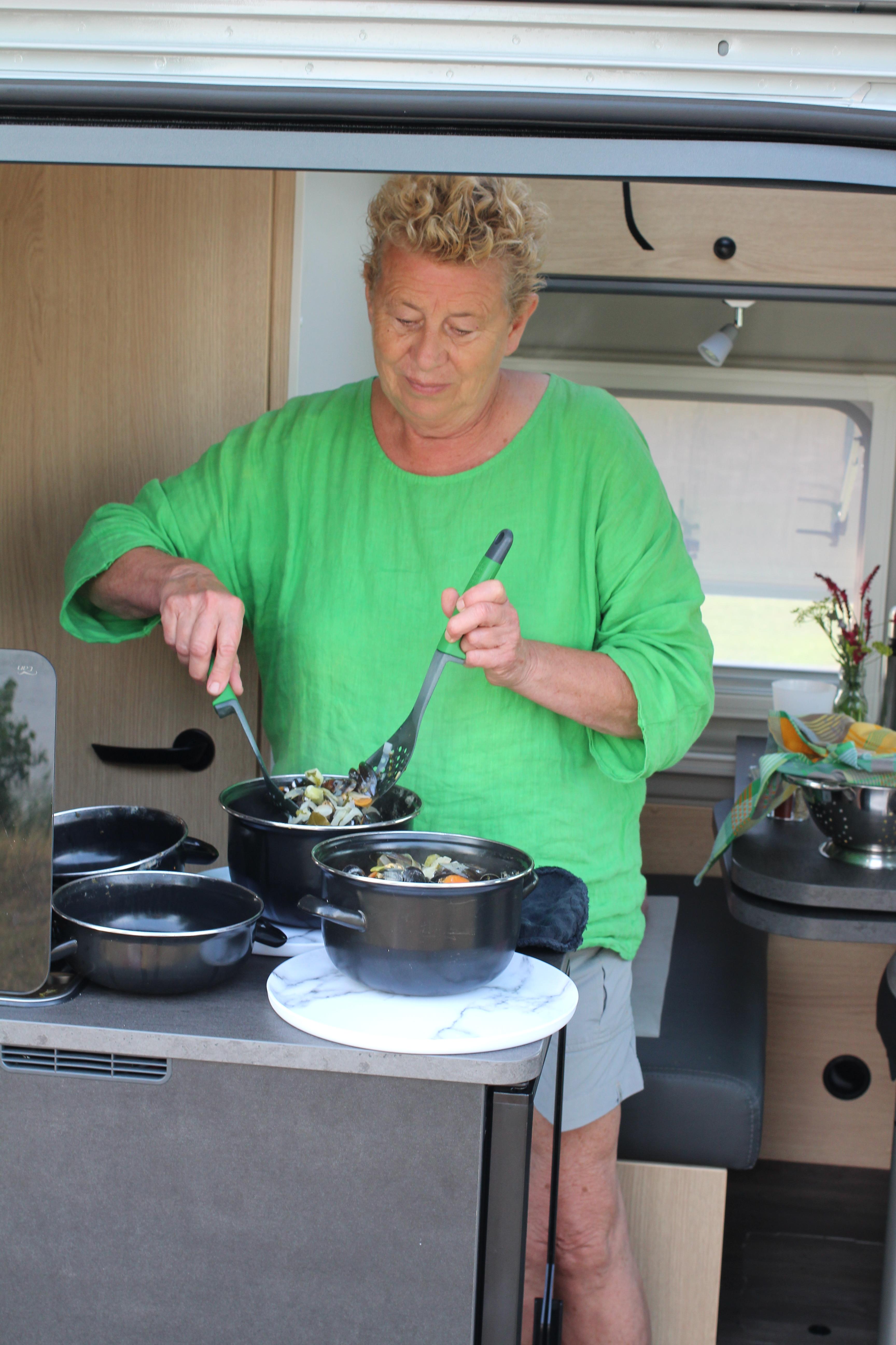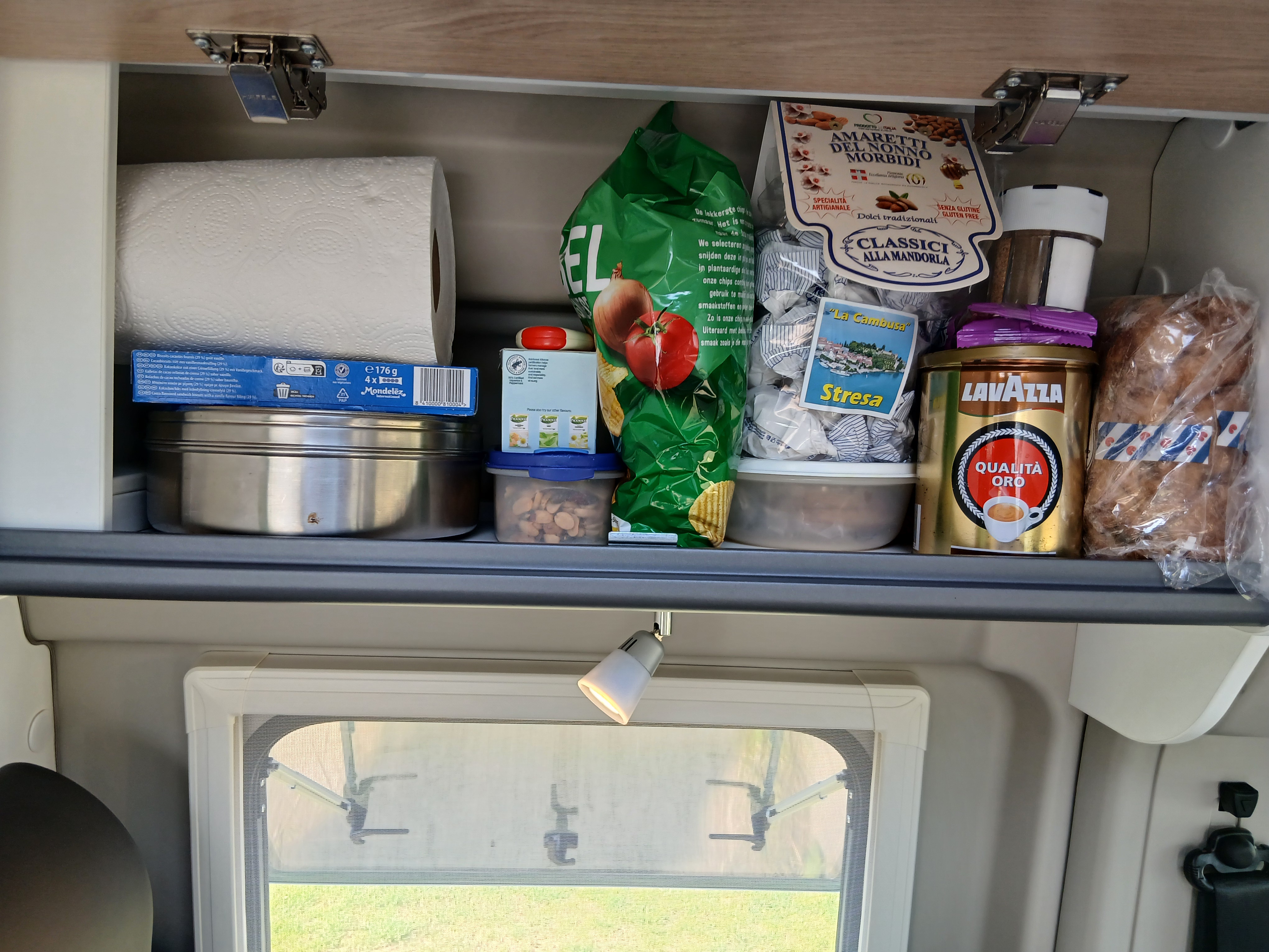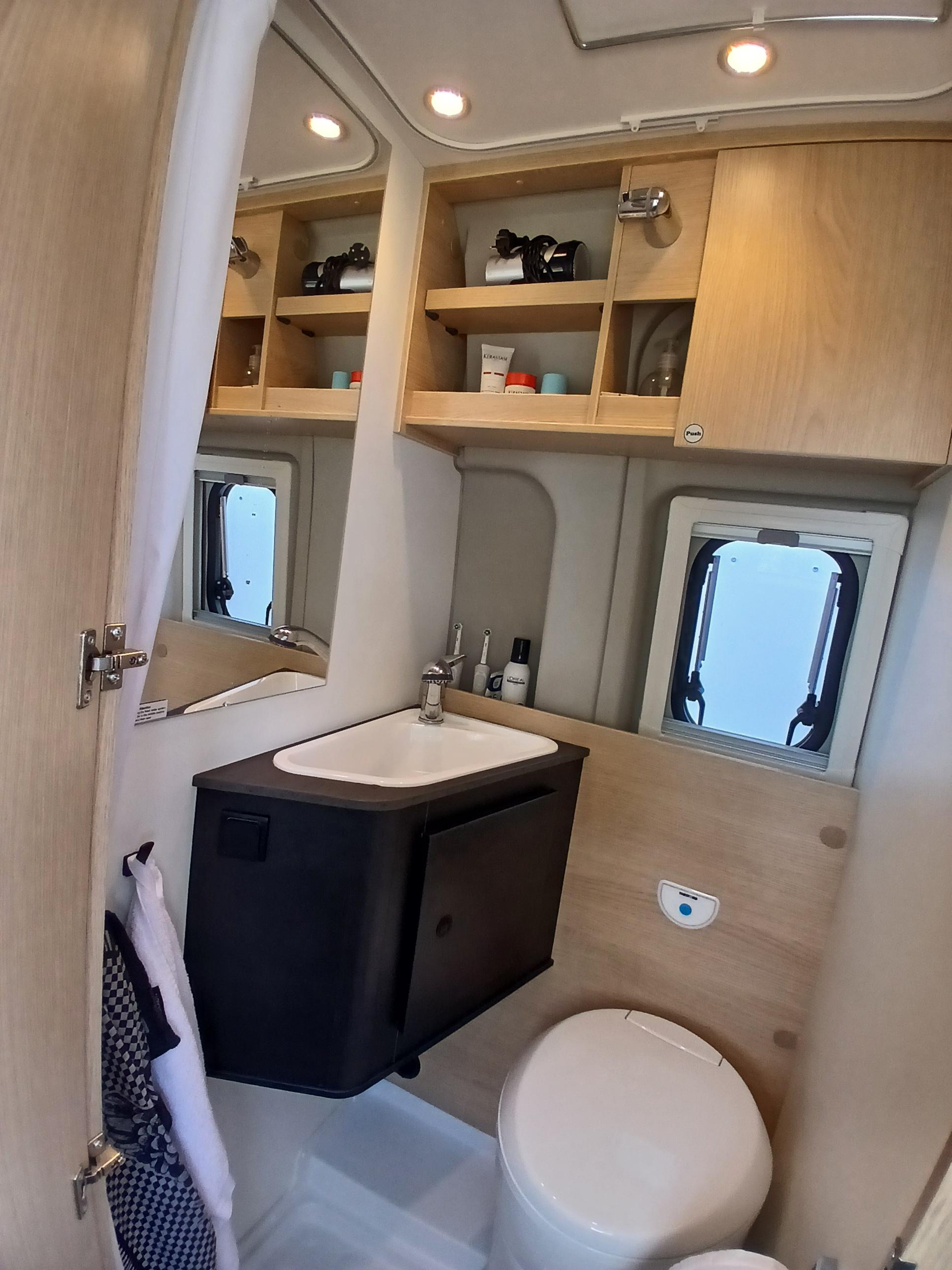 Zo zijn er meer slimmigheden. De koelkast bijvoorbeeld, zit aan de kop van het keukenblok, bij de ingang. Niet alleen een volwassen jongen met zijn 84 liter en een flink vriesvak, maar door zijn 180 graden draaibare deur ook nog eens handig van buitenaf bereikbaar. De keuken zelf heeft een klein werkblad, een spoelbak en een gastoestel met een grote pit, en een kleine met wat weinig vermogen. Alle potten, pannen en eetgerei kun je makkelijk kwijt in de verrassend ruime kastjes. Die zijn trouwens overal in de camper in ruime mate aanwezig. Zelfs in de vloer zitten twee kleine opbergvakken. Vooral met de grote zijdeur open en de schuifhor dicht kun je prima kokkerellen of afwassen. Warm water, evenals de verwarming van de camper, wordt geleverd door de degelijke Truma combi 4 gasverwarming, met boiler. De sanitairruimte is compact, maar knap van alle gemakken voorzien, met veel kastjes. Het (cassette)toilet kan je opzij draaien voor wat extra staruimte tijdens het douchen. Fijn dat ook het raampje in de zijwand open kan, ook handig om de douche buiten te kunnen gebruiken, bijvoorbeeld om wat af te spoelen.