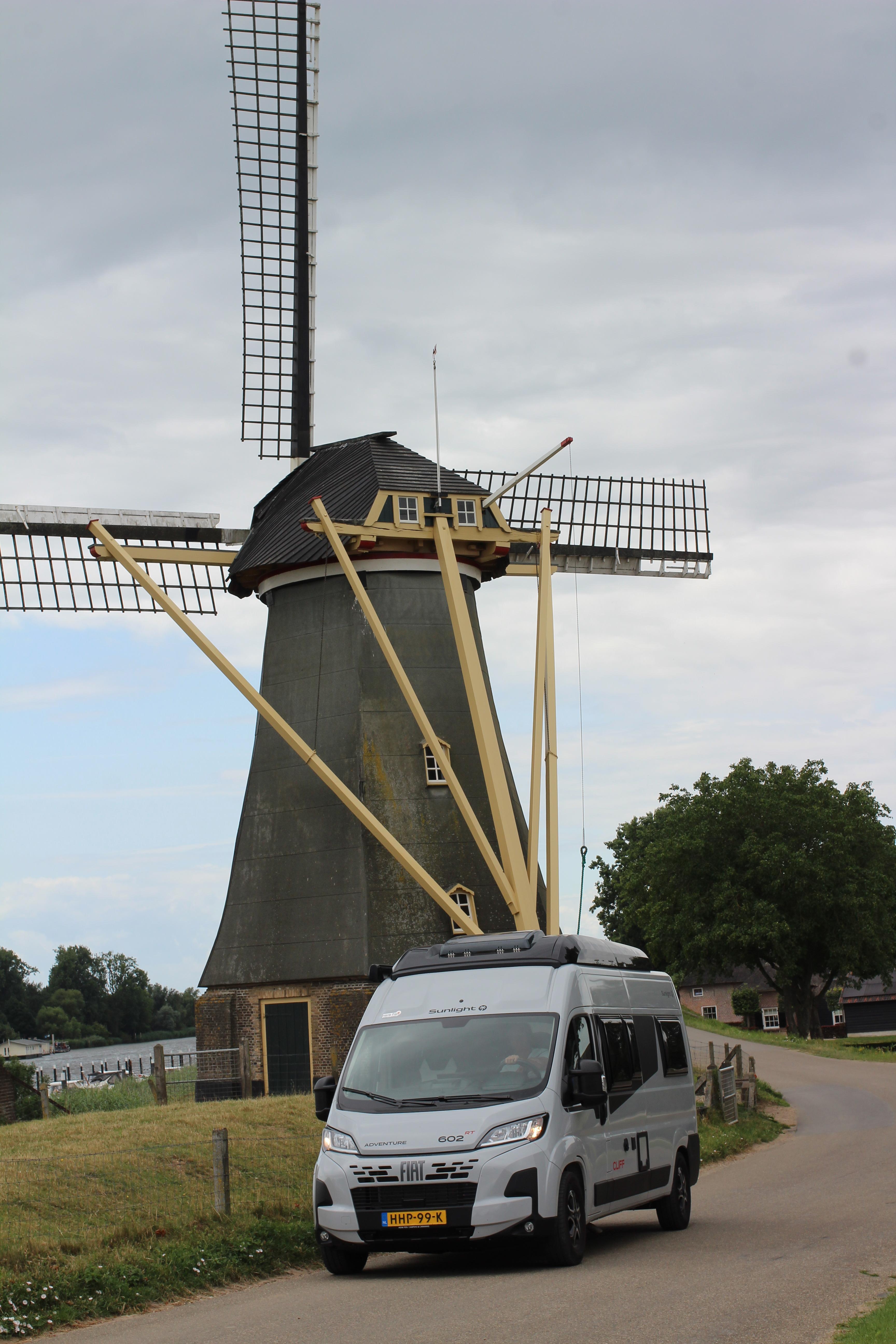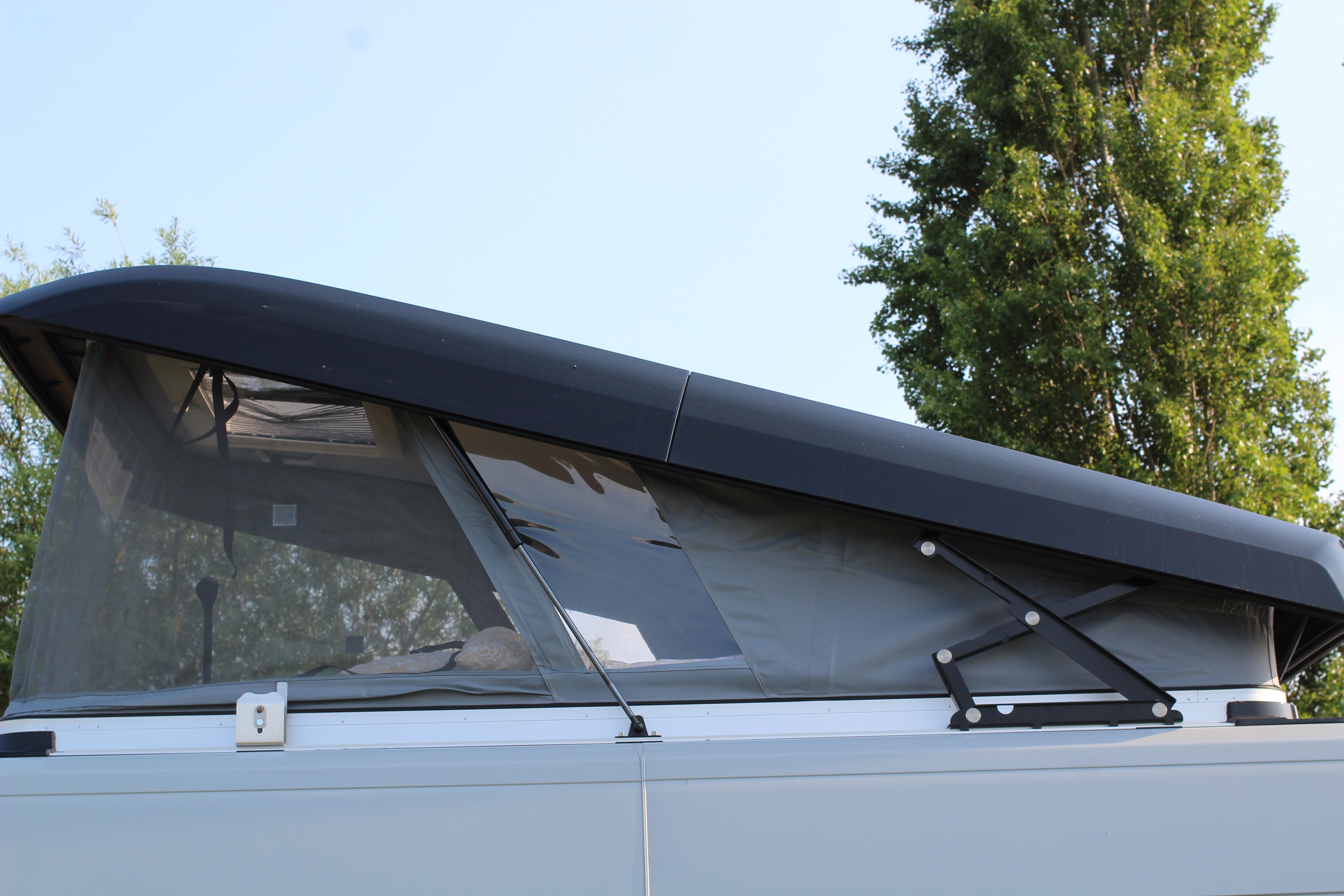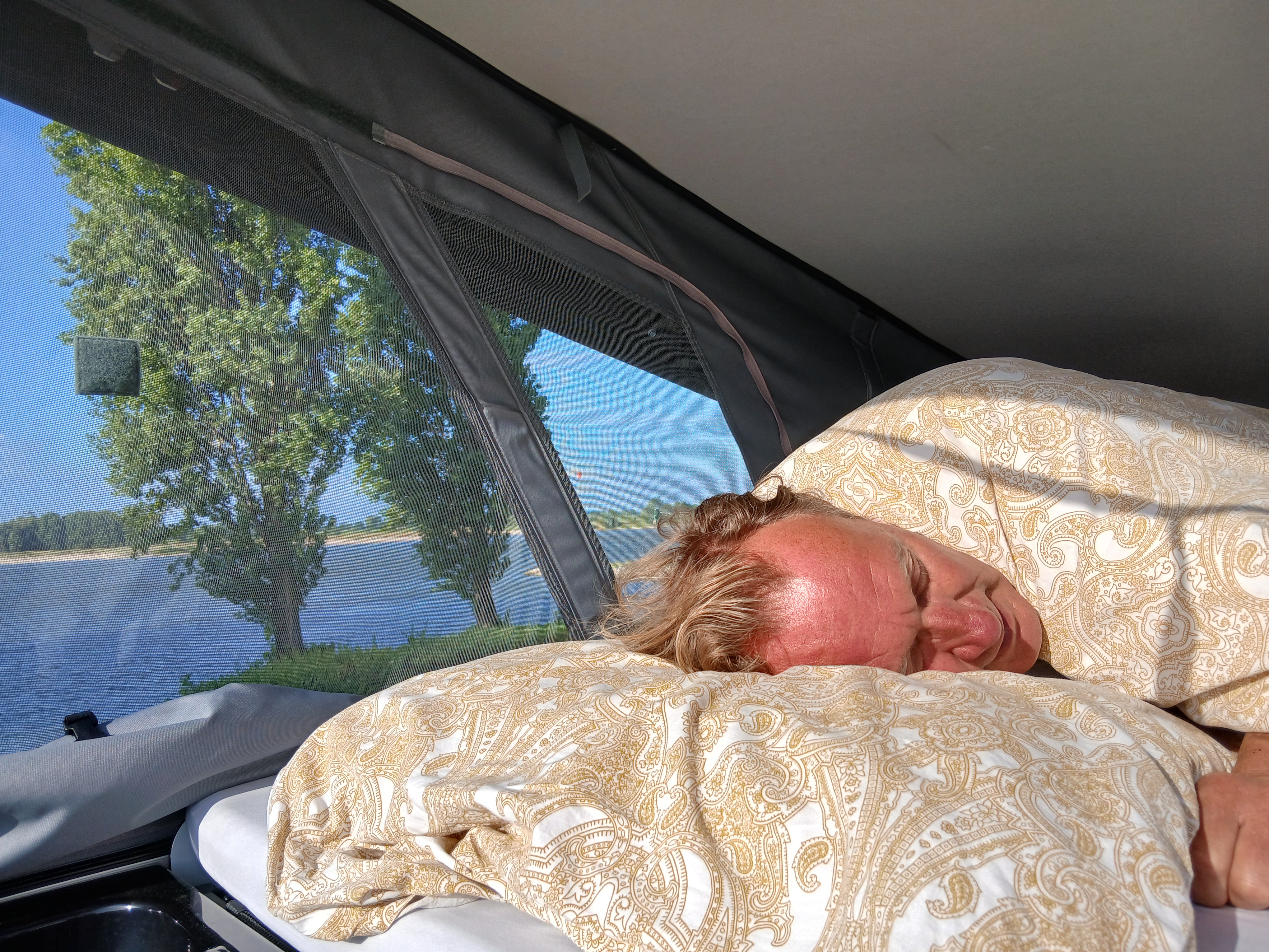 Het is dan ook letterlijk en figuurlijk een van de hoogtepunten van deze sportieve campervan, waarmee ik met Annemarieke een weekje door het Rivierenland, in zuiden van Nederland, toer. Wat is het eindeloos slapen in deze hefdaktent boven op de camper. De basis is een enorm tweepersoonsbed, 206 x 143 meter, met een stevige, comfortabele matras. En je heb echt een tentgevoel, met zoveel buitenlucht om je heen als je zelf wilt. De wanden van stevig doek kan je in delen wegklappen en oprollen. Daarachter zit, uitgezonderd aan het voeteneinde, rondom horrengaasdoek. Met alleen gaas om je heen lig je wel heel open en bloot. En tuurlijk, je moet even wat moeite doen om op deze bijzondere slaapplek te komen, maar daarvoor is een stevige telescoopladder meegeleverd, die je goed vast kan zetten in de dakopening. En het handige lampje in het trapgat voorkomt gevaarlijke capriolen in het donker. De tent uitklappen is een fluitje van een cent. Even de vergrendelingsknop indrukken en de tent aan de handels stevig omhoogduwen. De gasveren nemen dan het werk over en zijn de basis voor een stevige bovenwoning waar je verder geen omkijken naar hebt, ook niet als het hard waait. Omgekeerd gaat inklappen, na even flink aan de handels te trekken, net zo eenvoudig.