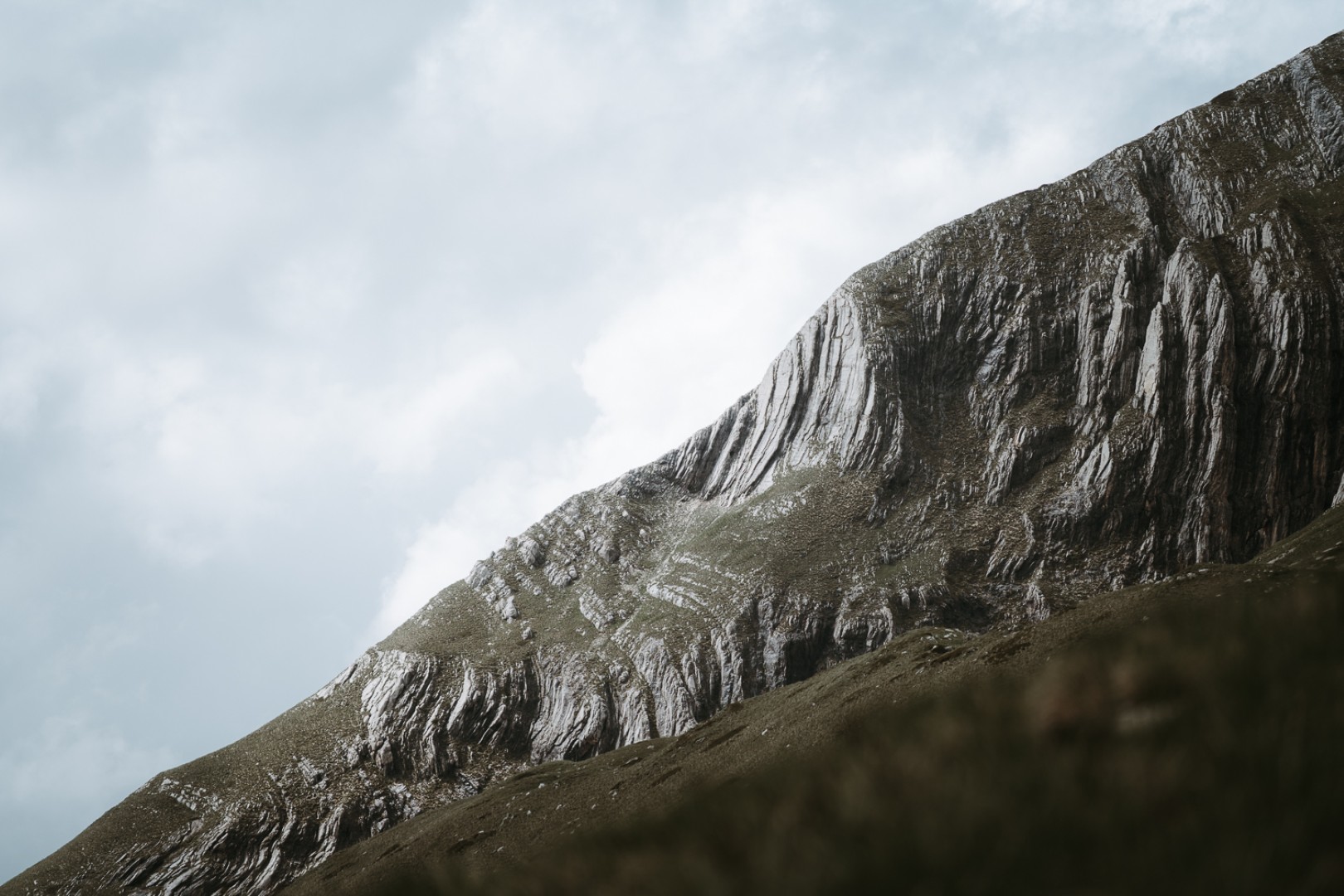 De wand van Prutaš is best indrukwekkend te noemen: steil, grillig en opgebouwd uit lagen kalksteen die als verticale stroken langs de bergwand lopen. Het lijkt bijna alsof de berg ooit is opengevouwen. Die specifieke vorm is wat Prutaš zo herkenbaar maakt. De lijnen geven het geheel iets krachtigs en gelaagds, bijna architecturaal.