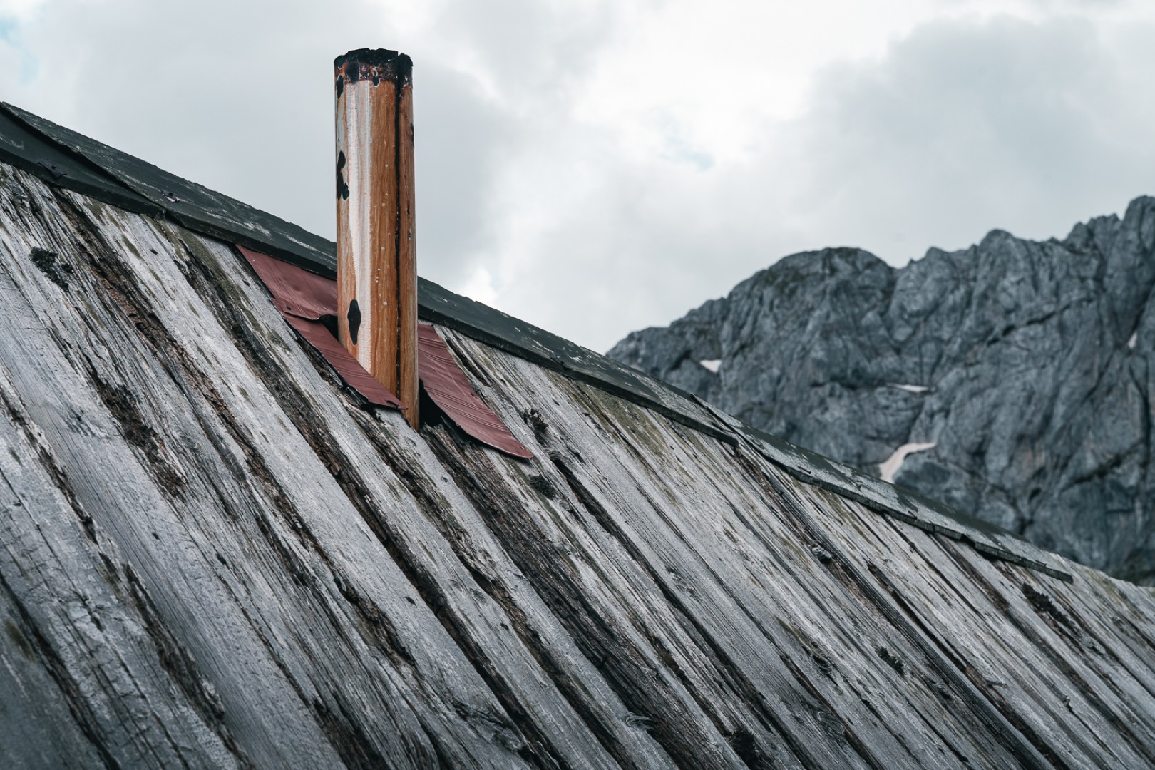 Inmiddels is het middag en staat de zon hoog aan de hemel. Plots slaat het weer om. Een kille wind steekt op en haastig trek ik mijn regenjas aan. Nog geen minuut later breekt de hemel open. Net als de stortbui losbarst, verschijnt er als bij wonder een vervallen berghut op mijn pad. Ik zoek er beschutting terwijl de regen over de rotsen klettert. Vandaag lijken alle seizoenen zich tegelijk af te spelen.