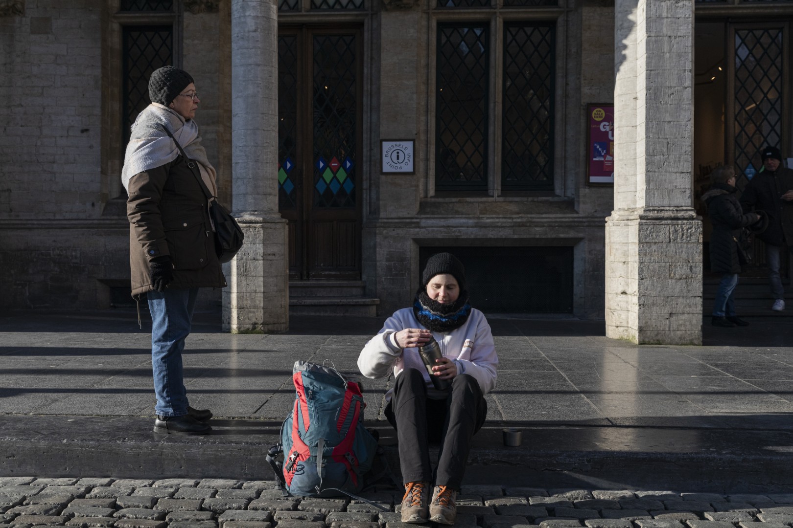 We dalen af richting Brussel-Centraal. De route neemt ons mee langs de kathedraal van Sint-Michiel en Sint-Goedele, waar de bomen op het plein geduldig wachten tot de Brusselaars weer komen lummelen in hun schaduw. In de Bergstraat, één van de oudste straten van Brussel, laten we onze blik glijden over honderden flesopeners, sleutelhangers en sierborden met Manneke Pis achter de etalages. Rommel voor ons, misschien, maar voor de miljoenen toeristen die jaarlijks onze hoofdstad bezoeken, zijn het souvenirs. Met de stem van Johan Verminnen in ons hoofd - je kan niet níet aan de man denken - slaan we de Rue des Bouchers in. De stank van vis, vuilnis en alcohol doet ons snel doorstappen. Van een bruisend Brussel is niet veel te merken in het middeleeuwse steegje, toch zeker niet op een maandagochtend. We bereiken de Grote Markt, waar toeristen braafjes achter gidsen met opgestoken paraplu’s lopen. We drinken een kop thermosthee op de stoeprand voor het stadhuis en genieten van de zon op ons gezicht. De route leidt ons niet langs Manneke Pis - al kan je gerust even afwijken - maar dwars door de Agoragalerij. Ooit een prestigieus paleis met de grootste bioscoop van Brussel, vandaag een overdekte winkelstraat vol schreeuwerige verlichting, flitsende nagelstudio’s en rekken vol namaakkleding. Buiten, aan de voet van de Kunstberg, schuifelt een oude man, wankel op kapotte schoenen. Hier en daar liggen mensen te slapen op de koude straatstenen, verstopt in een slaapzak of onder een stuk karton, maar je hoeft je best niet te doen om ze te vinden. Ook dat is Brussel.
