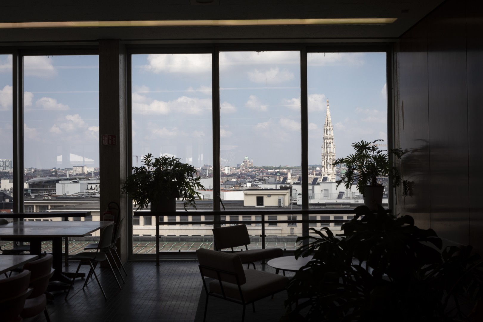 We stappen de glazen schuifdeuren van de Koninklijke Bibliotheek aan de Kunstberg binnen, draaien rechtsaf tot aan de liften en drukken op de knop naar de vijfde verdieping. Niet zomaar: we weten perfect wat we daar zullen aantreffen. Albert is een absolute must visit als je door het hart van Brussel dwaalt. Het restaurant werd enkele jaren geleden vernieuwd en heeft niet alleen de mooiste toiletten van Brussel, maar ook een verbluffend zicht op de stad - tot in de toiletten toe. Geloof ons: ga naar binnen, ga omhoog en drink een koffie bij het raam. We krijgen maar niet genoeg van het beeld dat we zien en blijven langer dan nodig hangen in het monumentale bibliotheekgebouw. We staren naar beneden en denken aan de man met de kapotte schoenen, nu een stipje onder ons. Bruxelles, een verhaal van contrasten.