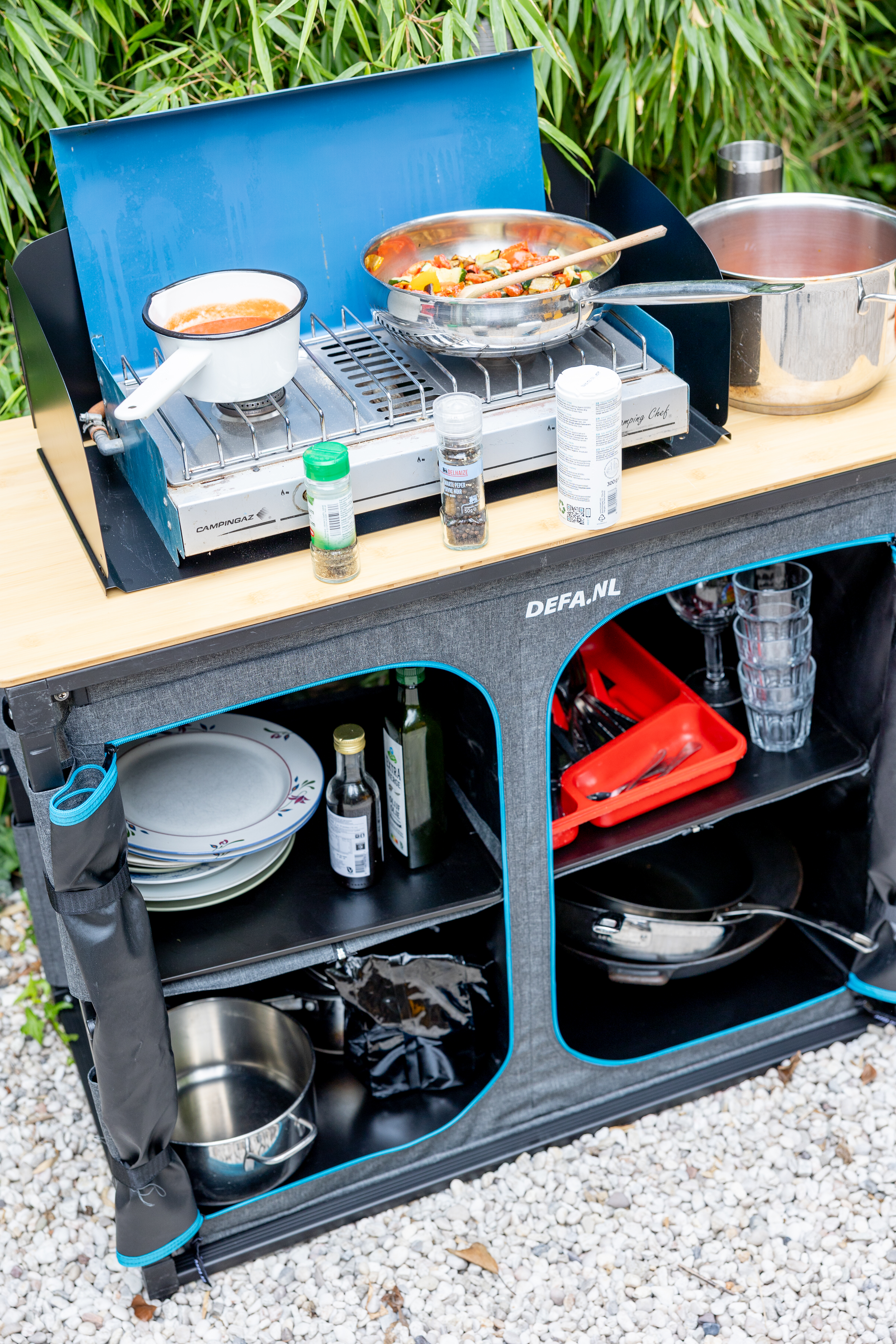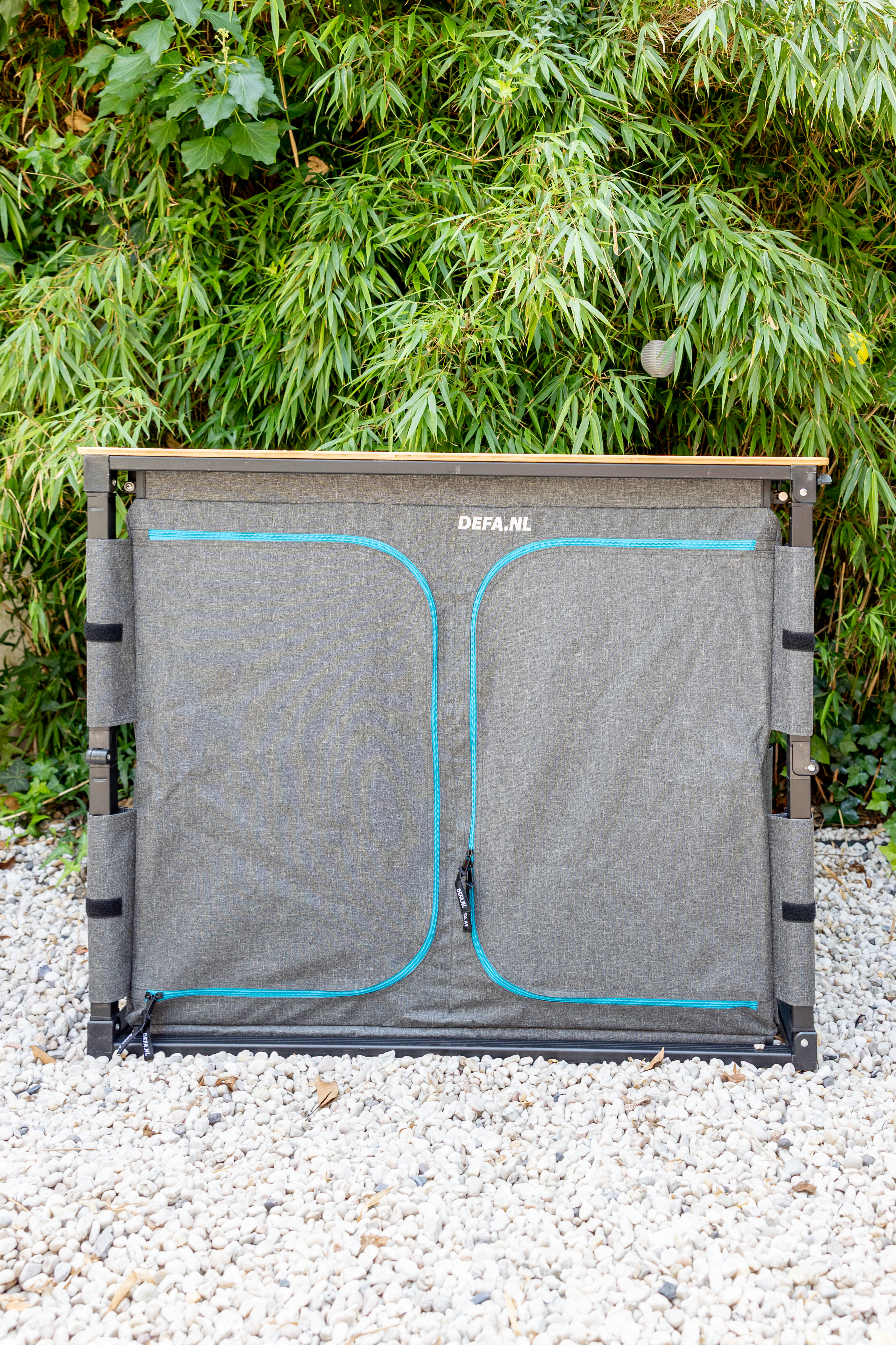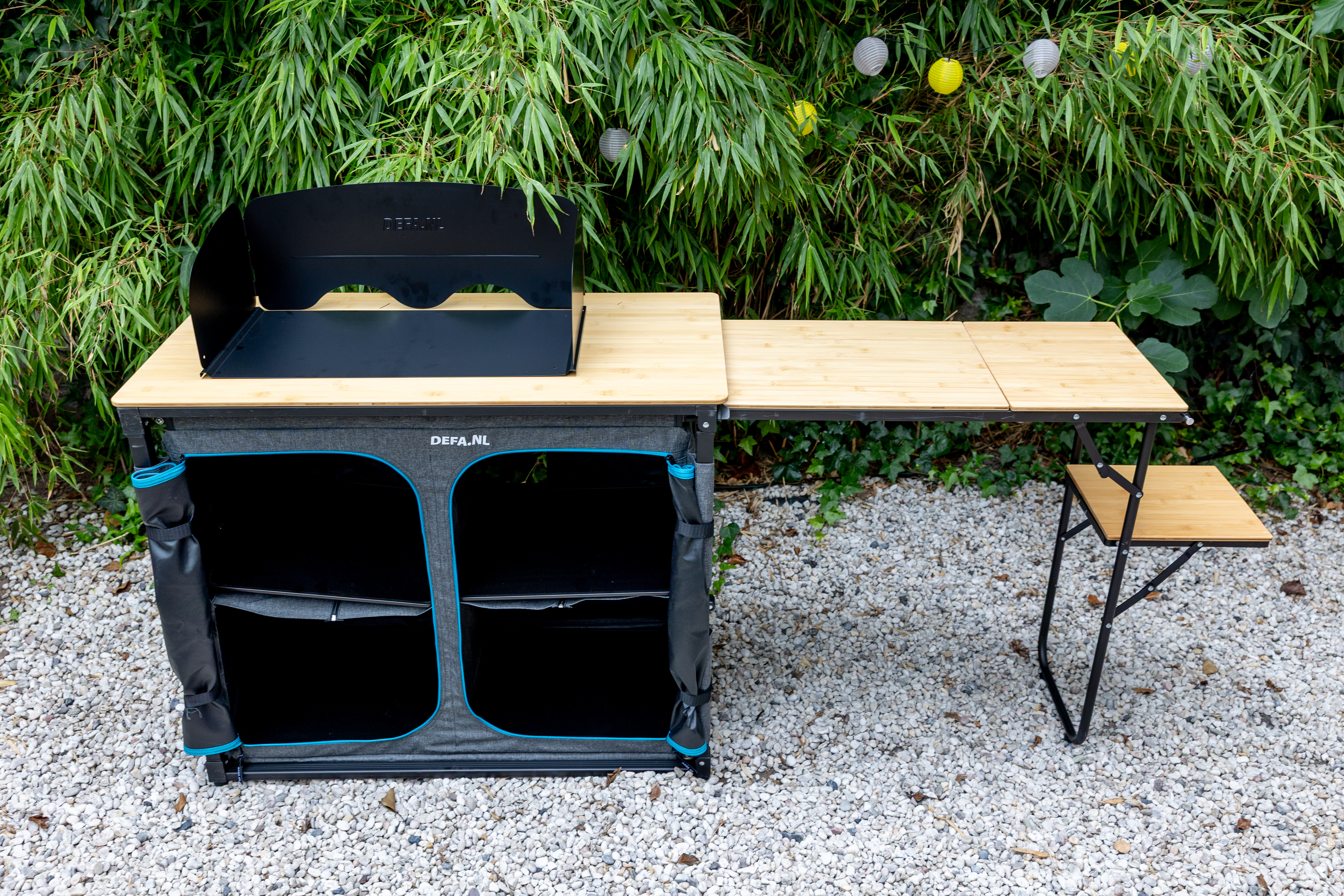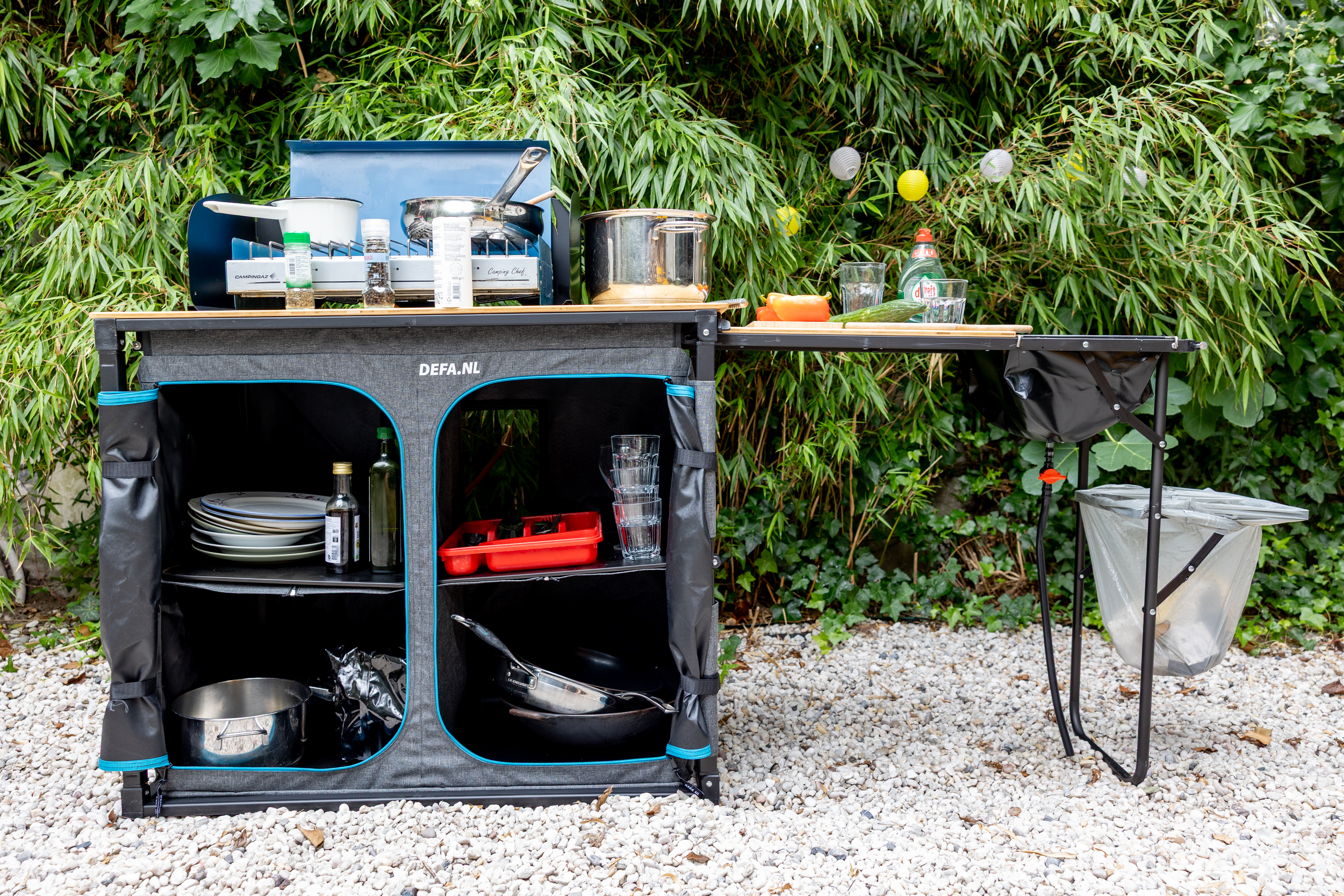De DEFA Easy Slide Bamboe is geen lichtgewicht. Met zijn achttien kilo sleep je hem niet zomaar even onder je arm mee naar het strand, maar eenmaal opgesteld voel je je wel degelijk de masterchef van de camping. Het grote bamboe werkblad straalt warmte en kwaliteit uit en blijft ook bij intensief gebruik stabiel. Alles voelt degelijk en doordacht aan, van de stevige ritssluitingen van de kastjes tot de geïntegreerde spoelbak en het houdertje voor je vuilniszak. Het meegeleverde windscherm past netjes in de tas, zodat je het altijd bij de hand hebt. En ook die tas zelf verdient een pluim: een stevige opbergtas die het gewicht kan hebben, waarin je de keuken netjes inklapt en ook het windscherm moeiteloos meeneemt. Bij het openklikken begrijp je meteen waar de naam vandaan komt, want dit ding is écht easy. Eén vlotte beweging en de keuken staat er. De zijplank schuif je er zo uit, waardoor je in een oogwenk extra werkruimte hebt. Naast dat uitschuifplankje is er zelfs een handige plek voorzien voor de vuilnisbak. Het resultaat is een keuken met een groot werkveld, een ruime opbergkast én een vaste plek voor je afval.