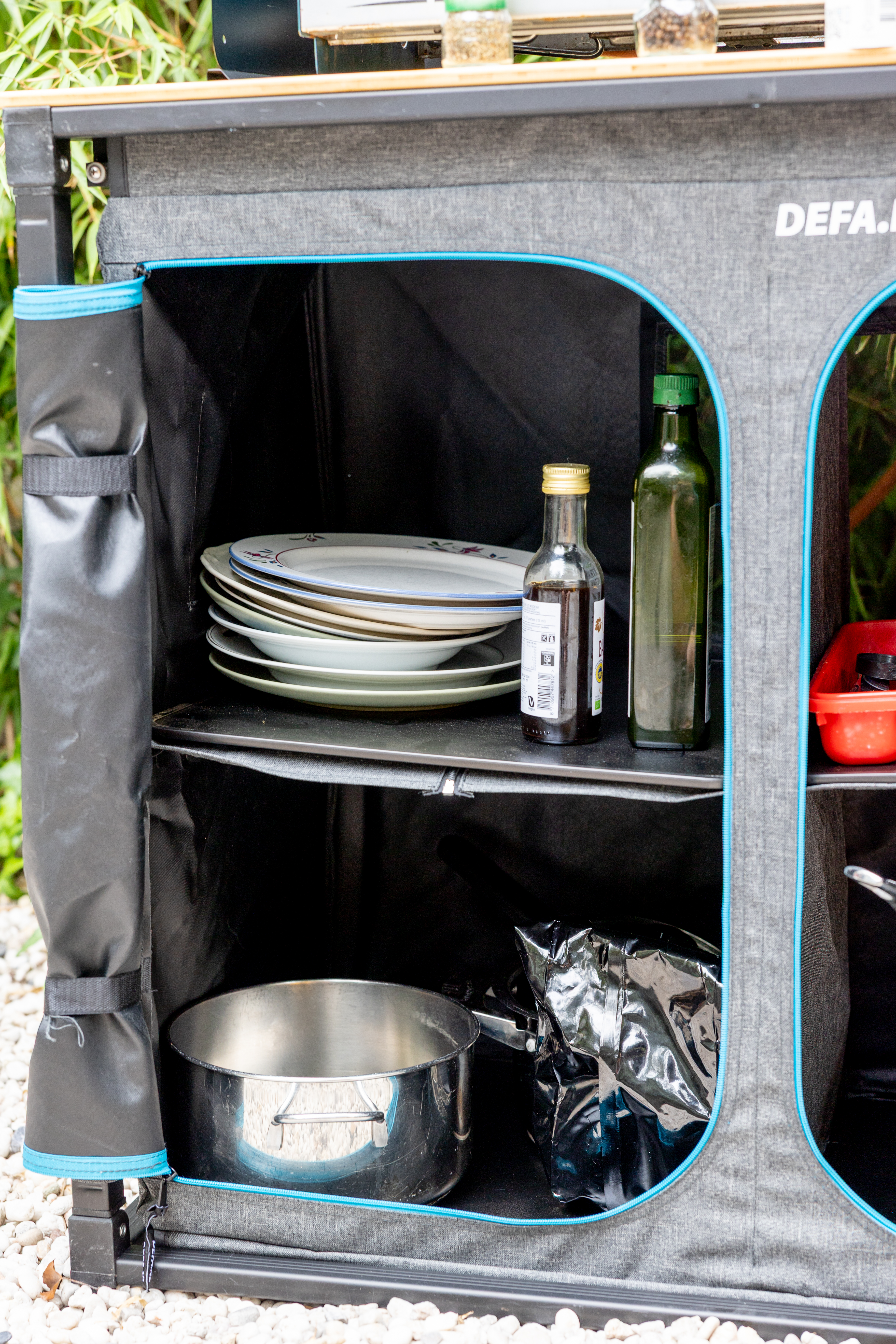 Wat de DEFA Easy Slide zo onweerstaanbaar maakt, is dat hij meteen als een huis staat. Vanaf het moment dat je de stevige poten openklapt voel je dat dit geen gammel tafeltje is maar een volwaardig meubel. De vuilnisbak kan vervangen worden door een extra legplankje, opnieuw in bamboe. Je krijgt er ook een degelijk afwasbakje bij dat eenvoudig te legen is via het slangetje dat eronder hangt, een detail dat je na een eerste afwasbeurt waardeert. Binnenin zijn er verstevigende bankjes, zodat de kast netjes zijn vorm houdt, zelfs wanneer je hem volpropt. Het royale werkblad maakt het verschil. Het voelt alsof je effectief een volwaardige keuken tot je beschikking hebt. Dit is geen haastig in elkaar geschroefd kampeermeubel, dit is keukenstudiewerk. Nederlands vakmanschap op zijn best, met oog voor detail, gebruiksgemak en duurzaamheid. Slim, ruimtebesparend design, een bamboe werkblad dat aanvoelt als een echte kookstudio, geïntegreerde gootsteen, talloze opbergmogelijkheden en ondanks zijn gewicht en formaat toch handig te vervoeren. De DEFA Easy Slide is de eerste campingkeuken die niet aanvoelt als een compromis, maar als een volwaardige werkplek.
