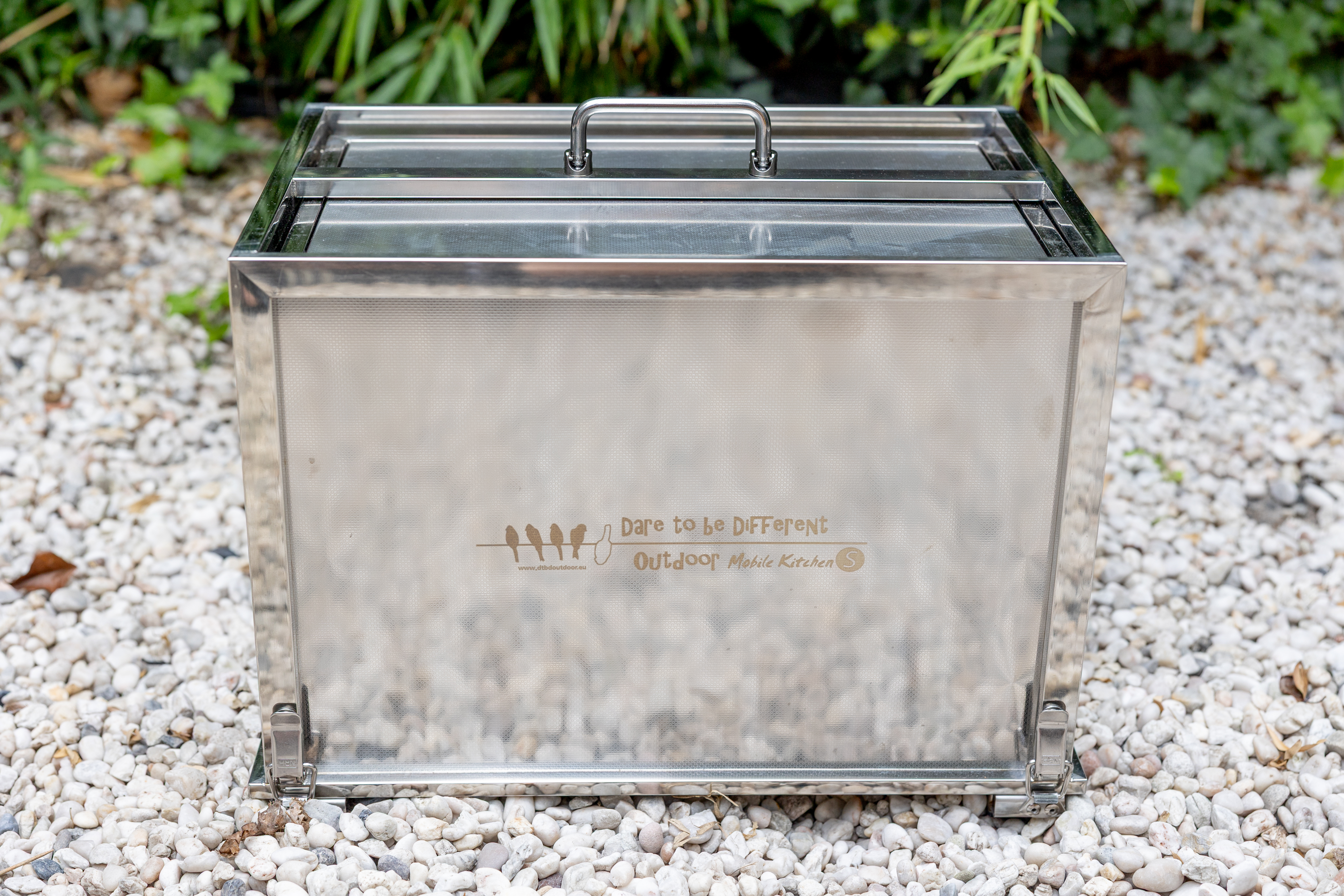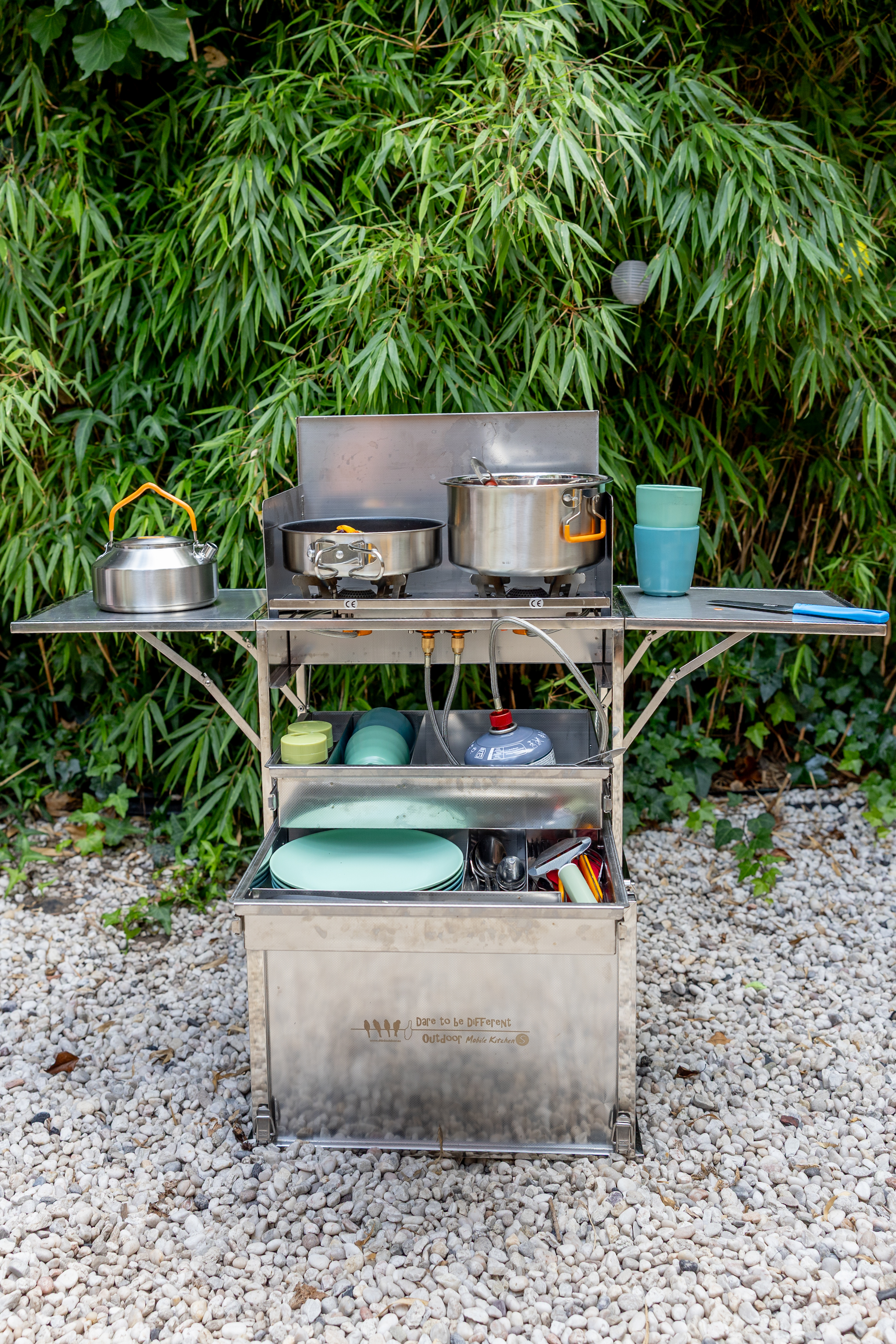 Ik had nooit gedacht dat een aluminium doos van twaalf kilo me zou doen glimlachen, maar de Dare to be Different Kookkist S deed dat wel. In gesloten vorm lijkt het een strak koffertje, maar zodra ik de slotjes openklap en het deksel op het frame zet, begint de magie. Het ene stuk past op het andere en in een paar tellen groeit die compacte bak uit tot een stabiel kader met een werkblad waar je meteen zin krijgt om iets op klaar te maken. Dertig seconden later staat er een complete buitenkeuken die doordacht in elkaar zit. Met een opvouwbare spoelbak, twee gasbranders met windscherm, twee kookpotten, een braadpan, messen, een groenteschiller, een snijplank, vleestang, spatel, schaar, peper- en zoutstel, vier borden, vier bekers, vier besteksets en een extra opbergdoos. En het allerschattigste detail: dat kleine waterketeltje van 750 milliliter. Je zou bijna denken dat het een speeltje is, maar nee, het werkt echt. En dan de bekers, die zijn zo mooi afgewerkt dat ik even getwijfeld heb of het nu echte gebakken potjes waren of kunststof.