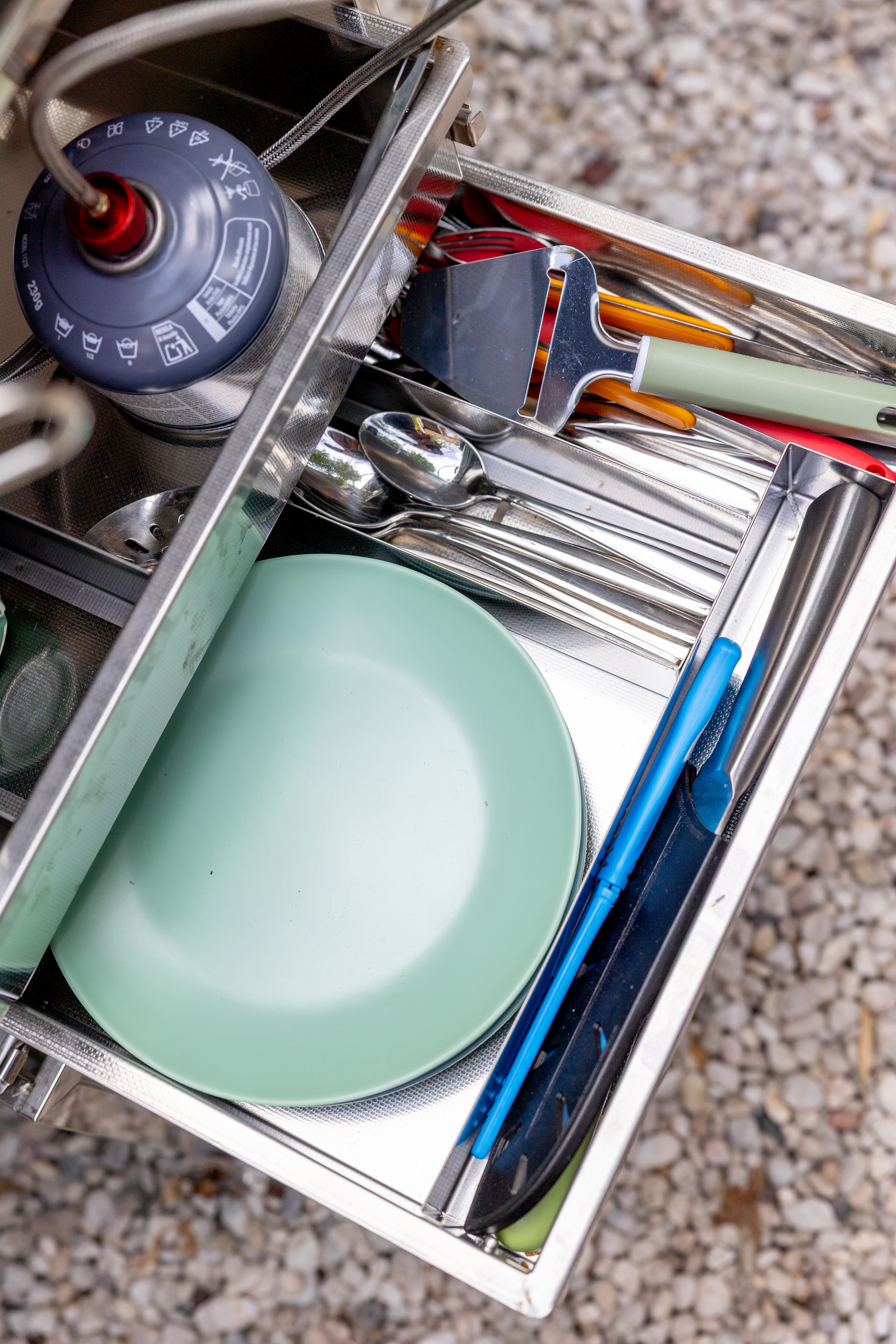 Tijdens het koken valt vooral op hoe degelijk alles is. De messen snijden echt, de pannen trekken niet krom, het bestek ligt stevig in de hand. En die gasbranders… die vlammen alsof je met de brander van een heteluchtballon bezig bent. Je zet er zonder probleem een volle pot op en hebt nooit het gevoel dat ze ermee ophouden bij de eerste windvlaag. Zelfs de kleine dingen, zoals de snijplank of de schaar, zijn gewoon degelijk. En de spoelbak, hoe eenvoudig ook, maakt het verschil: een nette bak die mee in de box hoort.