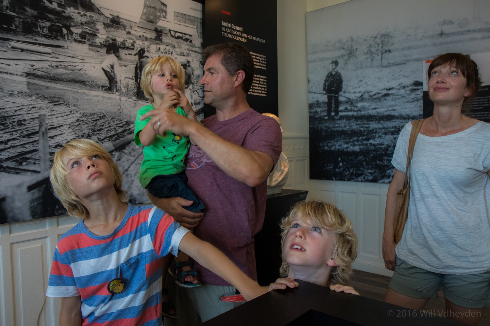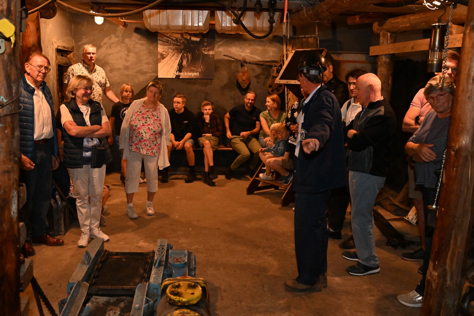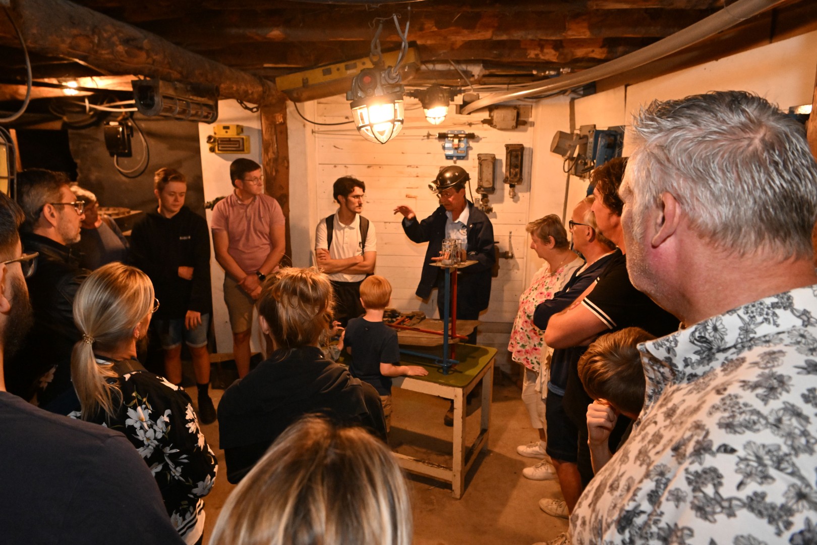 Om 11, 13 en 15 uur nemen gidsen individuele bezoekers mee in de ondergrondse simulatie. Groepen kunnen altijd een rondleiding aanvragen. Met schietmeester Rudy dalen we de trappen af onder het fietscafé, zogezegd 800 meter diep. ‘Hoewel de afdaling in de bijna 800 meter diepe schacht minder dan een minuut duurde, waren mijnwerkers toch een uur onderweg voor ze hun werkplaats bereikten.’ De simulatie is fantastisch gedaan. Het voelt bij momenten echt benauwd om je een weg te banen door de met dennenhout gestutte gangen propvol materiaal.