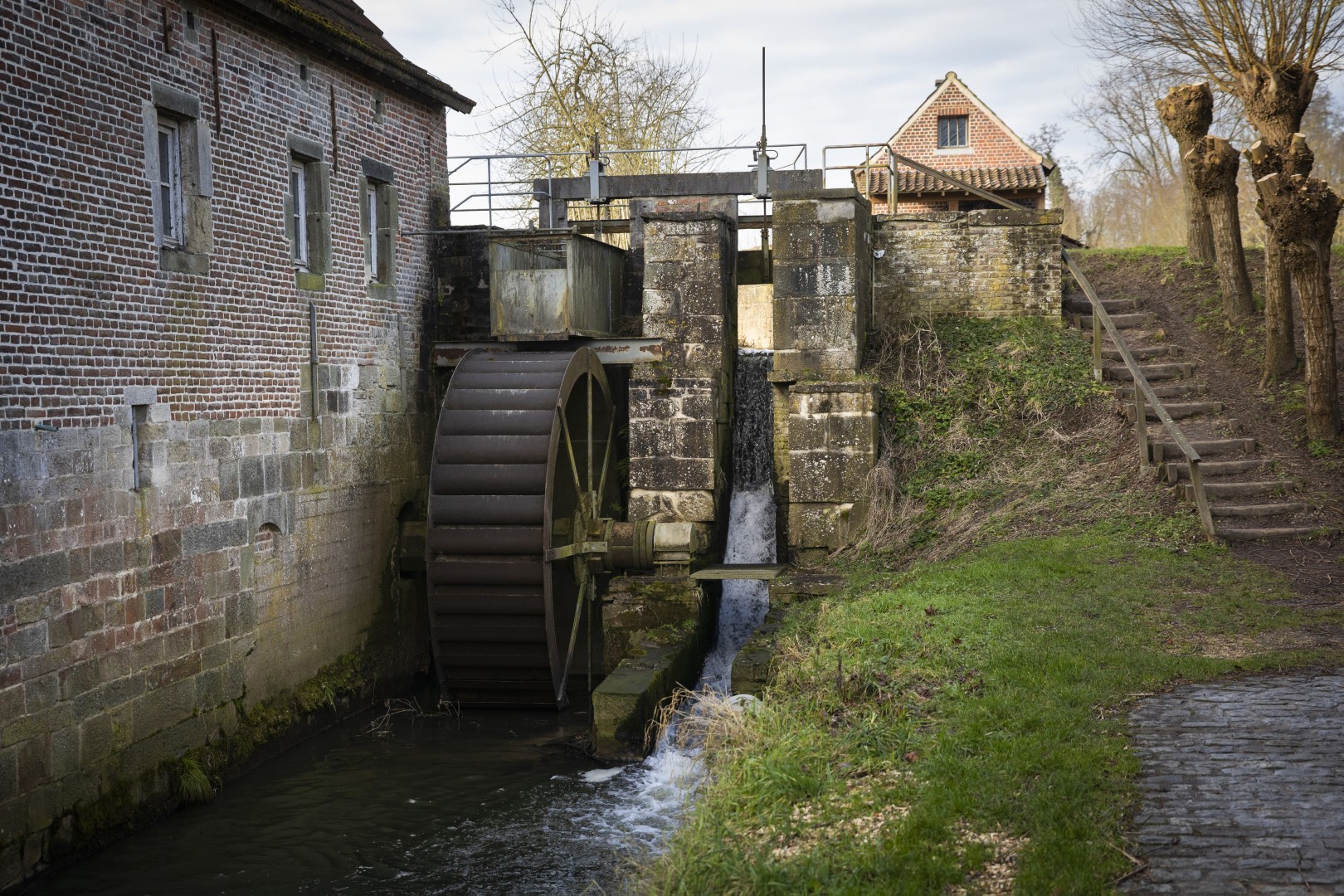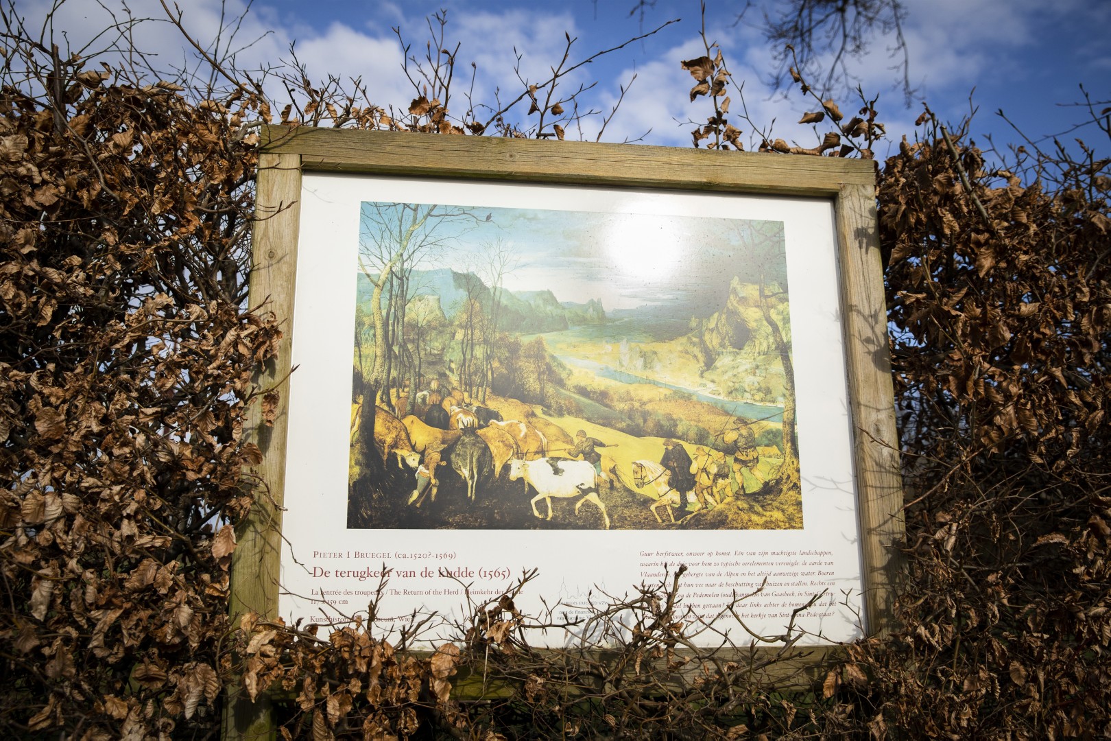 Van Vlezenbeek fietsen we terug richting Dilbeek. En ook daar staan ons nog enkele bijzondere bezienswaardigheden te wachten. We houden halt aan het schilderachtige kerkje van Sint-Anna-Pede. ‘Toen Pieter Bruegel de Oude zich in 1563 in Brussel vestigde, werd hij diep gefascineerd door het Pajotse landschap. Met zijn schildersezel bij zich trok hij door de dorpjes van Dilbeek, zoals Sint-Anna-Pede. Dit kerkje staat afgebeeld op De Parabel der Blinden, gemaakt in 1568’, legt Dirk uit. We vleien ons even neer op een gebogen bank voor de kerk. Daarop prijken gietijzeren kunstwerken die verwijzen naar Bruegel. Rond het kerkje staan reproducties van Bruegel opgesteld. ‘Ze maken deel uit van het openluchtmuseum Bruegel dat 19 schilderijen bevat. Ze zijn opgesteld op plekken waar Bruegel de Oude zijn inspiratie vond. Je kunt ze verkennen aan de hand van een wandel- of fietstocht’, geeft Dirk nog mee. Wanneer we weer de fiets opstappen, richten we onze aandacht op een indrukwekkende spoorwegbrug boven de Pedevallei. ‘De zeventien bruggen’ dateert uit het interbellum’, vertelt onze gids. ‘Tel maar eens de bogen’, lacht hij. We komen uit op … 16. ‘Klopt! De zeventiende is een extra bruggetje onder één van de bogen’, geeft hij mee. We trappen verder door dit prachtige bruegeliaanse landschap naar onze laatste stop: de Pedemolen in Sint-Gertrudis-Pede. Het is één van de weinige nog werkende watermolens van het Pajottenland. Maandelijks zie je hier nog een molenaar aan het werk. Achter de molen ligt een prachtig stukje natuur met vijver en hoogstamboomgaard. Wat een oase van rust! Op de binnenkoer werpen we een blik op een hondenmolen. ‘De honden liepen in het rad en door de draaibeweging kon men vroeger boter karnen’, aldus nog Dirk. Afsluiten doen we terug in Schepdaal. Met een pintje in de hand luisteren we in In de Rustberg nog naar verhalen van supporters van Remco.
