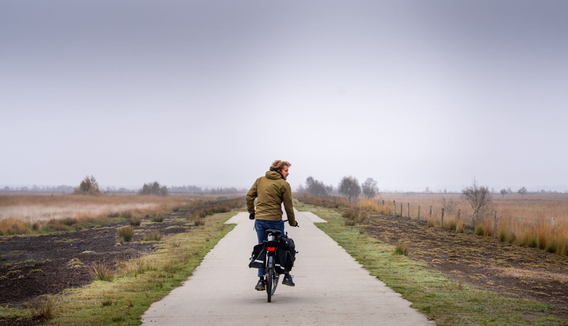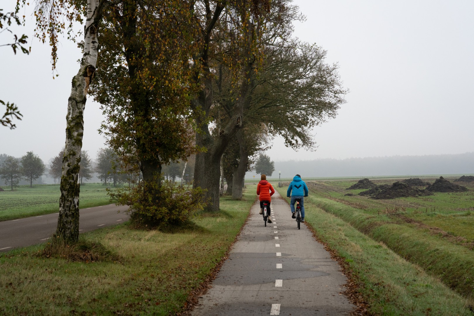 En snel zullen we begrijpen waarom. We draaien een fietspad op – ‘Dus niet brommen’, gebiedt een bord. Alsof humeurige fietsers hier moeten omdraaien. Wij zien niet in waarvan we slecht gezind kunnen worden: het veen is prachtig. De nevelen hangen zwaar boven het land, de horizon verzwolgen door vijftig tinten mist. Een betonnen fietspad snijdt diagonalen door het decor, langs samenscholingen van blèrende schapen. Het zacht zoemen van banden over beton verzorgt de enige soundtrack, een verstilde wereld in monochroom.