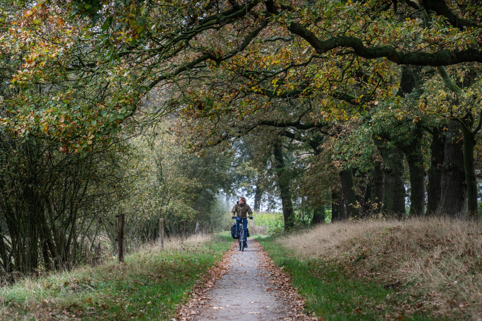 Ook nu doen we stevig aan wieltjes zuigen bij Van Gogh. In 1883 legt hij deze route af in de kar van zijn huisbaas, die hem op weg naar de markt belooft af te zetten in Zweeloo. Van Gogh ziet ‘enorme mosdaken van huizen, stallen, schaapskooien, schuren’, maar ook ‘eikenboomen van een superbe brons.’ En wij… zien net hetzelfde. We maken vaart, doorheen de velden en voorbij de torenspits van Sleen. Nu is dat de hoogste van Drenthe, maar destijds is ie net afgebrand - een stompje, een kerktoren met een handicap.