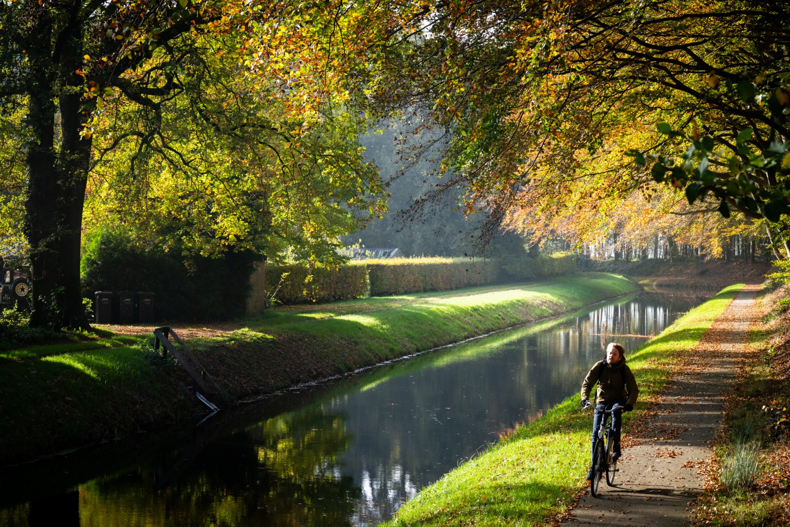 De hele dag springen we van het ene sloot naar het andere kanaal - via smalle streepjes en dikke lijnen blauw. We rijden langs eeuwenoude dorpskroegen alwaar een schipper van een trekschuit - een snikke in het lokale volkstaaltje - tijdens het wachten voor een sluis terecht kon voor een frisse pint of een snelle kruidenbitter. Bij een kruispunt van vaarten bollen we over een beeldschoon bladerdek van herfstkleuren, wat Van Gogh een ‘gouden regen van warrelende, wemelende herfstbladeren’ noemt. Reigers in alle categorieën vliegen op zodra ze onze rijwielen in zicht krijgen. Nu is het rustig fietsen langs de vaarten. Niet zo in de tijd van Van Gogh, die te voet op pad trekt en er “altijd een bedrijvigheid van turfschuiten” aantreft.