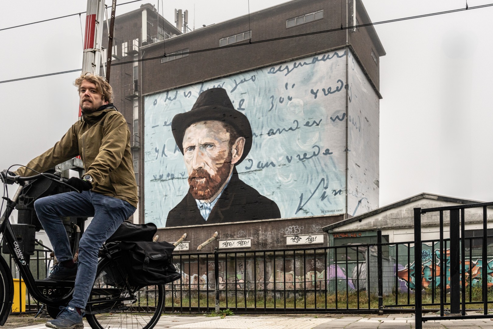 Bij het Van Gogh Huis vertrekken twee van de drie fietslussen. Over de ophaalbrug - niet meer dezelfde van weleer - trappen we eerst richting station. Op drie kanten van een reusachtige silo prijken daar gigantische muurschilderingen. Aan de stationskant pronkt de kunstenaar zelve, aan de overzijde de aquarel die hij maakte van de ophaalbrug. De twee murals zijn verbonden met een fragment uit een brief aan Theo: ‘o het is hier zoo eigenaardig - en zóó stil, zóó vredig.’