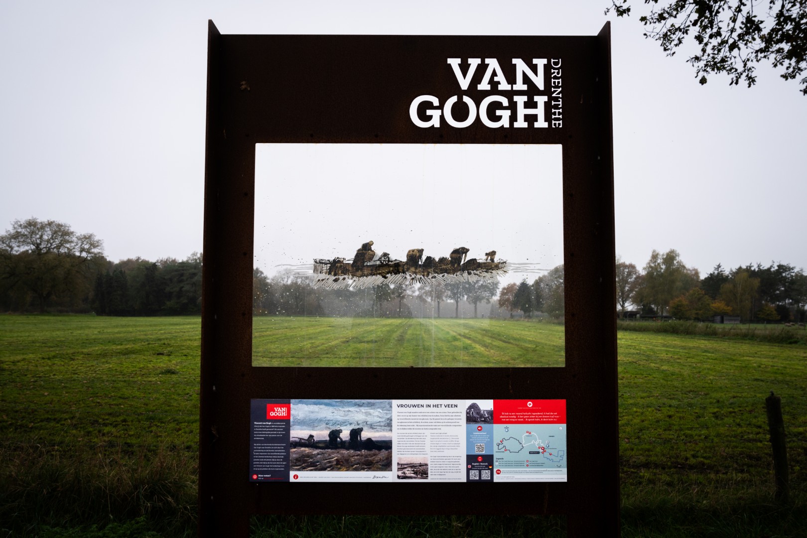 Anno 2025 zorgen doorkijkpanelen en bijhorende luisterverhalen op verschillende plekken voor een extra laag. Letterlijk: ze laten ons toe om het landschap door het oog van de meester te bekijken. Zo legt zo’n paneel een koppel plaggenhutten boven op een kale stoppelakker. In 1883 ziet Van Gogh hoe een geit op het mosdak van een hut graast en hoe een arbeidersvrouw het dier met een bezemsteel wegjaagt. Hij voelt zich verwant met het knoestige werkvolk, dat naarstig turf steekt, en hij tekent en schildert hun dagelijks leven meermaals, hun noeste arbeid en hun armzalige leefomstandigheden. Op zijn eigen manier is ook Van Gogh een gelukszoeker in Drenthe - speurend naar brandstof, turf om op het vuur zijner inspiratie te gooien. Hij wil dieper het land in en scheept op 2 oktober in op de trekschuit richting Nieuw-Amsterdam. Onderweg schetst hij zijn medepassagiers.