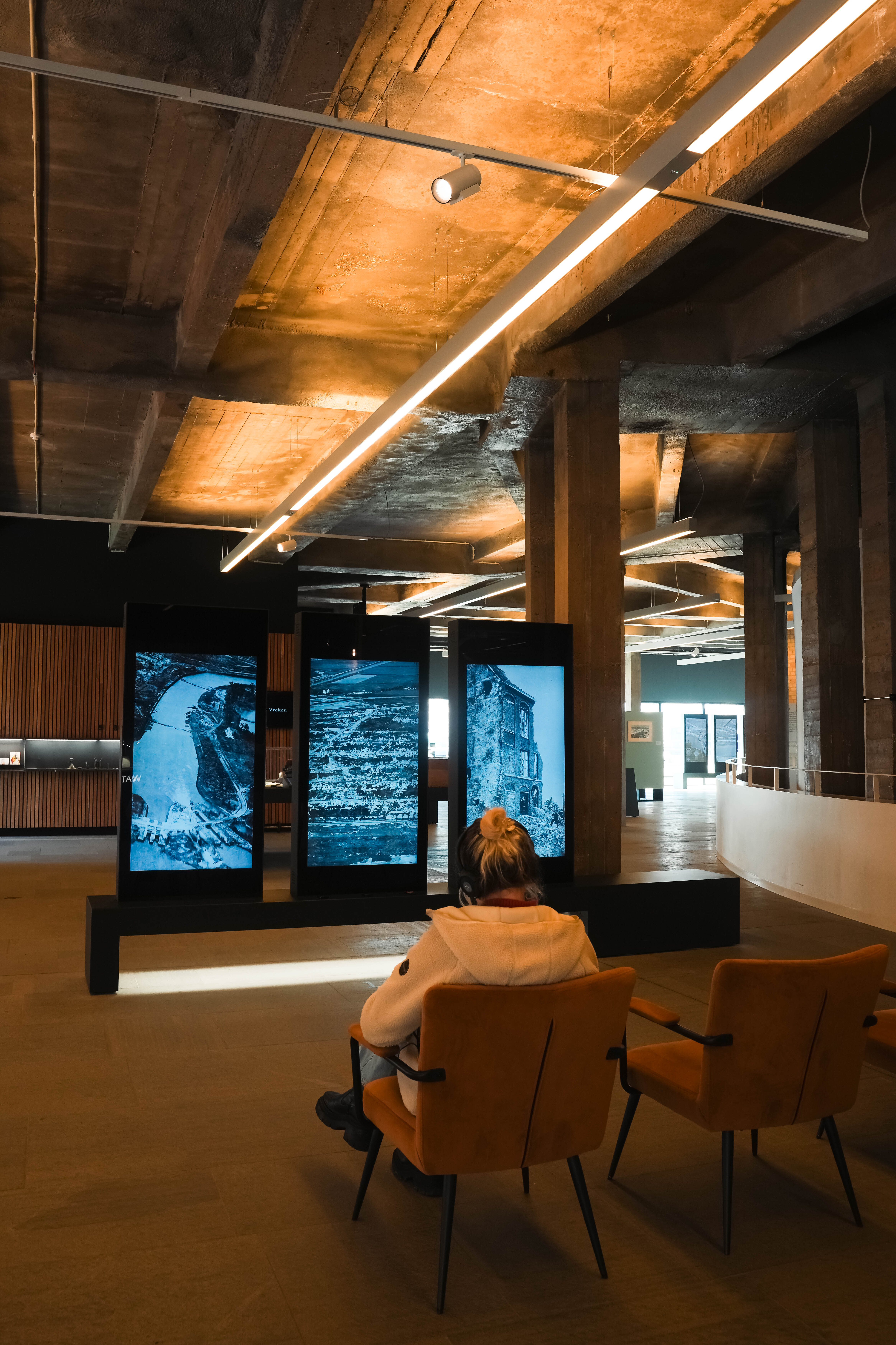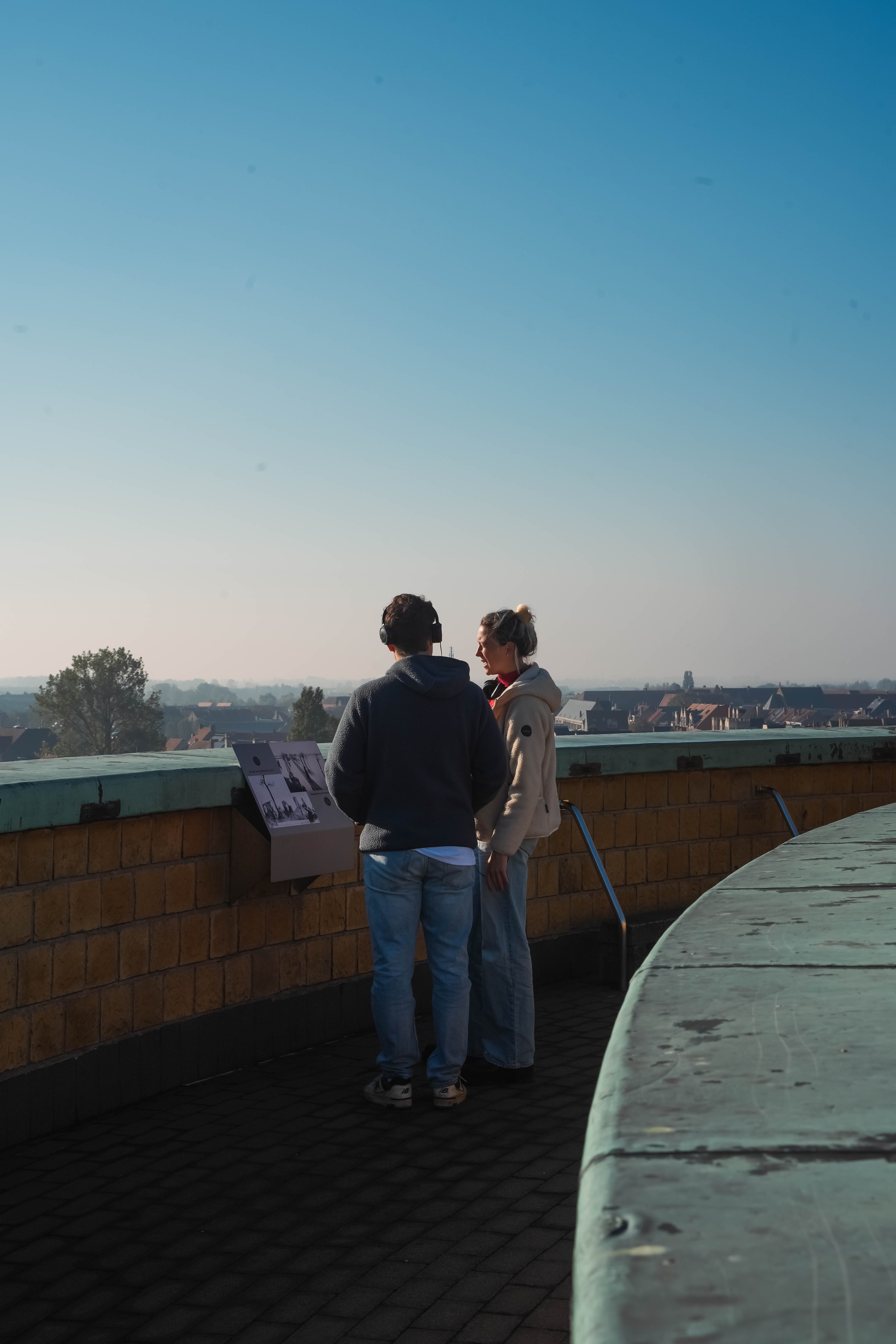 Ondanks de oktoberzon dalen de nachtelijke temperaturen onder nul. Wat we later op de dag leren over de ontberingen van de frontsoldaten op deze plek, helpt om de beroerde nacht te relativeren. Op nog geen tien minuten wandelen van Kompas Camping treffen we de Ganzepoot aan, het sluizencomplex waarmee de onderwaterzetting van de IJzervlakte werd aangestuurd. Het indrukwekkende Westfront, een oorlogsmonument ter ere van Koning Albert I dat tijdens de jaren dertig werd opgetrokken, schittert goud in de ochtendzon. Tijdens de honderdjarige herdenking van de Groote Oorlog werd er onder dit monument een bezoekerscentrum opgericht. Dat werd in 2024 volledig vernieuwd. Met behulp van een podcastwaardige audiogids herbeleven we de oorlogservaring van drie fictieve historische personages. Een korte zelftest helpt ons om een keuze te maken tussen het verhaal van Ellie, een verpleegster uit Brussel, Juul, een kunstenaar-frontsoldaat, en Rosa, een kind uit Nieuwpoort dat de tentoonstelling op kindermaat brengt. Hoewel de personages in enigszins genderstereotiepe rollen worden gepresenteerd, biedt de verscheidenheid aan perspectieven wel een verrijkende blik op de impact van de oorlog.