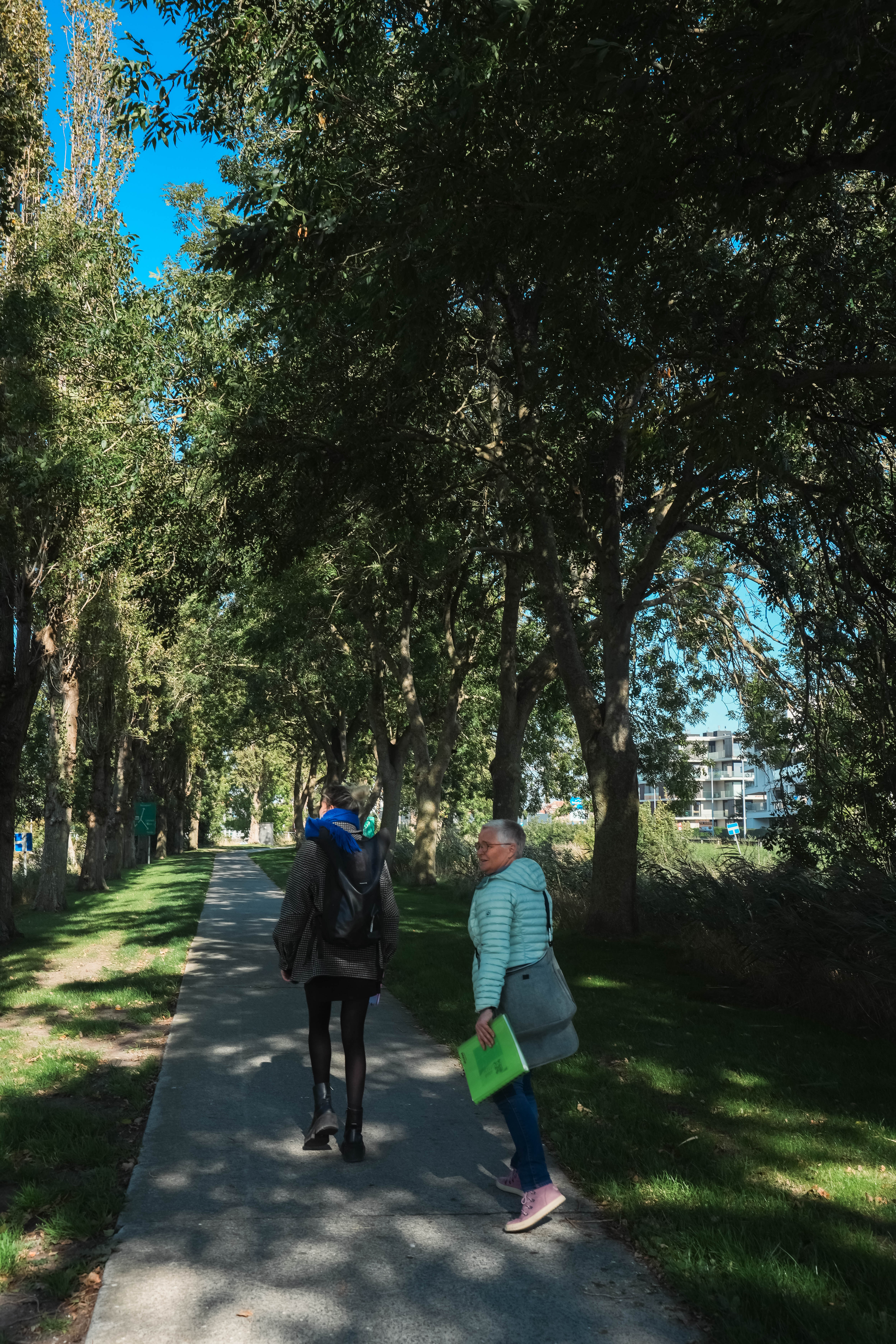 Na een snelle lunch in Nieuwpoort-stad trekken we richting Koksijde om de benen te strekken in het natuurgebied Doornpanne, goed voor een wandeling van tien kilometer door duinen, bos en strand – ideaal om de indrukken van de ochtend te laten bezinken. Het gebied maakt deel uit van een beschermd duinmassief en wordt beheerd door Aquaduin, dat hier ook drinkwater wint. We wandelen door een afwisselend landschap van open stuifduinen, kalkgraslanden en dichtbegroeide duinpannen, waar grazende shetlandpony’s en ezels het terrein openhouden (die zich voor ons helaas goed verstopt hebben). Onderweg beklimmen we de Hoge Blekker, met zijn 33 meter de hoogste duin van de Belgische kust. Via de Schipgatduinen bereiken we het strand, waar we heerlijk kunnen uitwaaien met blote voeten in de zee. We keren terug naar het beginpunt van de route via de rustige villawijken van Witte Burg en Sint-André.