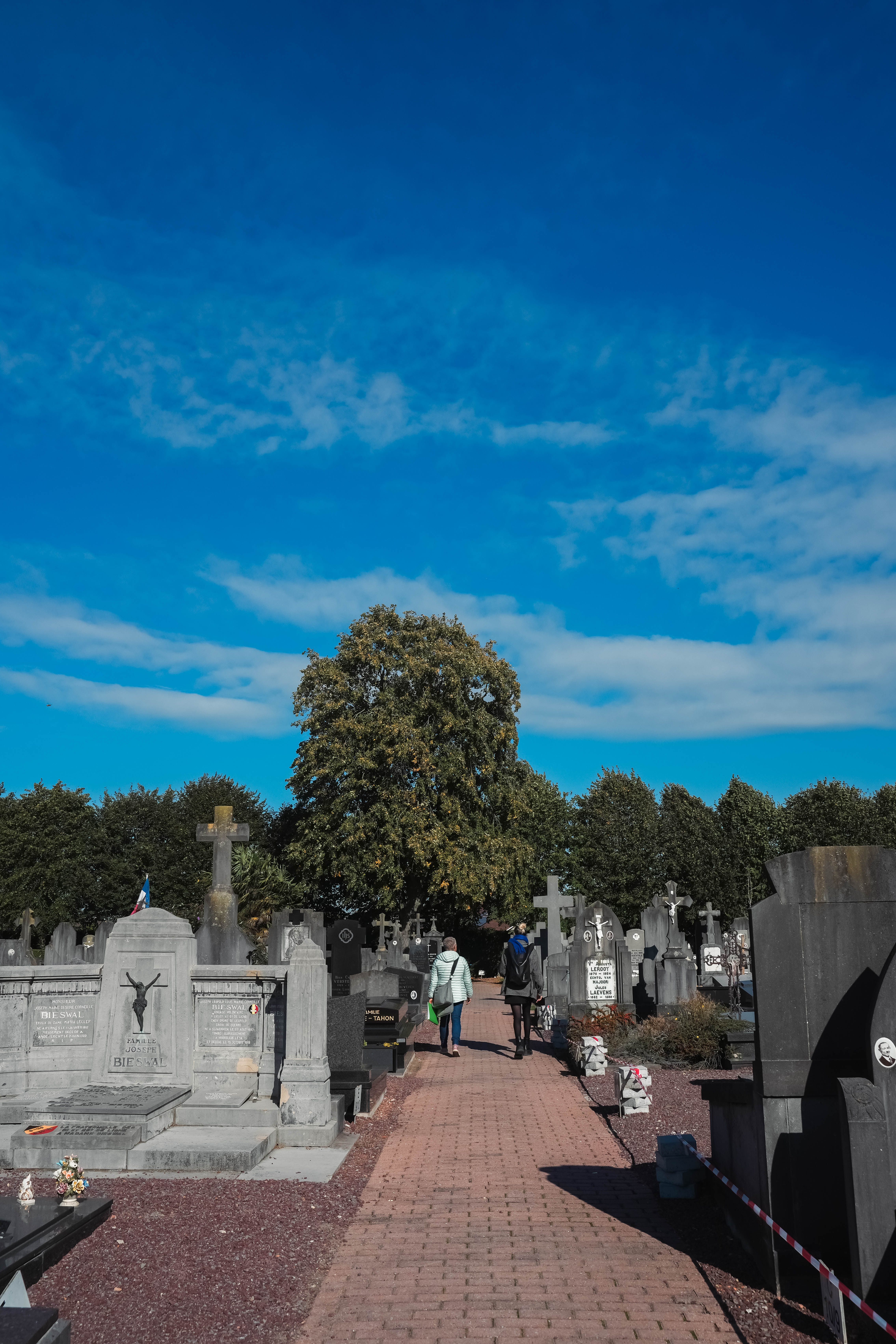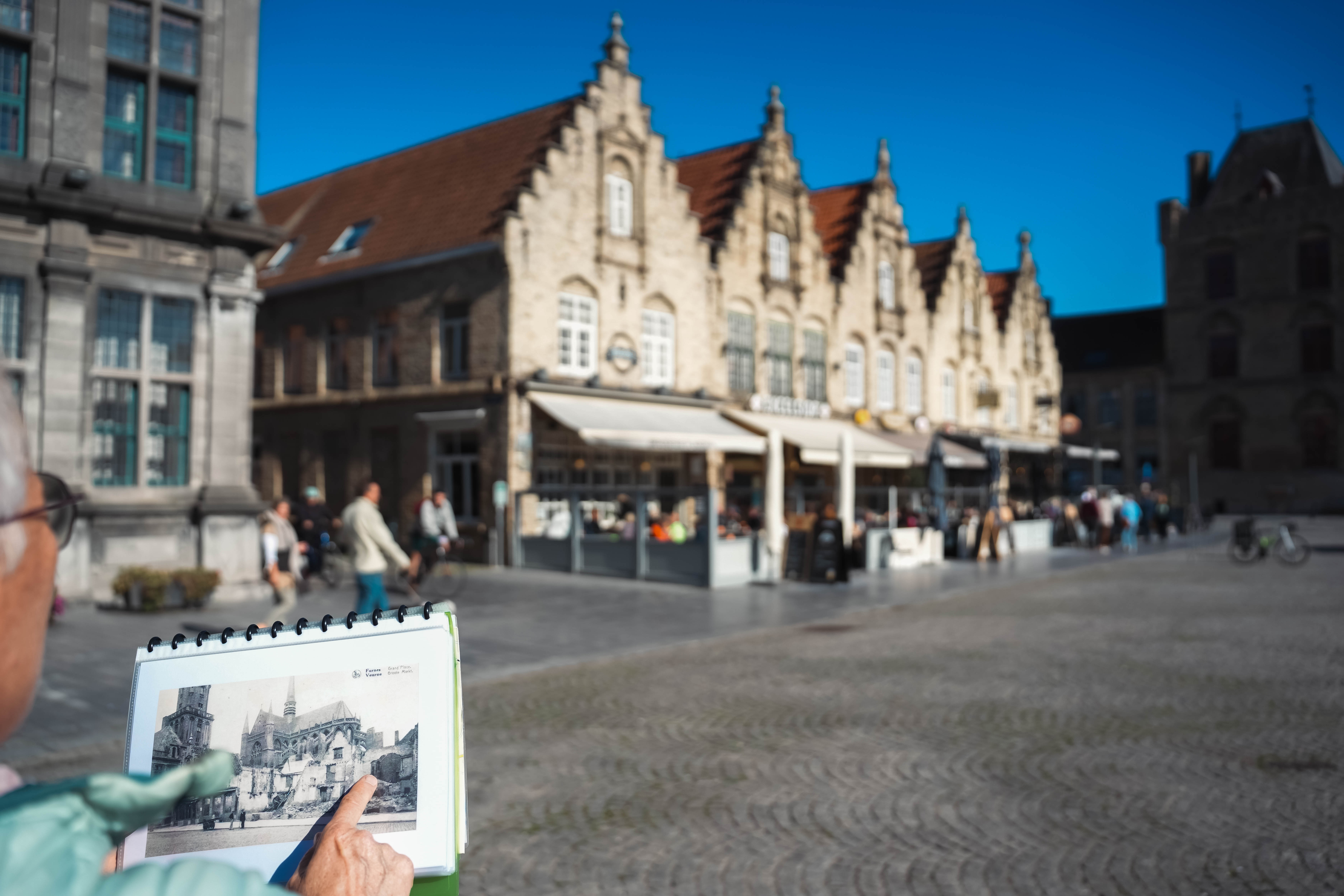 Omdat Veurne niet mag ontbreken in een toer door het oorlogsverleden van de Westhoek, sluiten we ons weekend af met een gegidste stadswandeling. Gewapend met een map vol oude foto’s en schilderijen laat onze gids Greet onderweg het verleden tot leven komen. We startten op de Grote Markt, die in de zeventiende eeuw uit economische noodzaak werd aangelegd onder Albrecht en Isabella – en vandaag nog steeds wordt omzoomd door gebouwen in renaissancestijl. Eén daarvan is het Stad- en Landshuis, dat tijdens WOI dienstdeed als hoofdkwartier van Albert I. Ondanks de nabijheid van het front bleef Veurne grotendeels gespaard van bombardementen, waardoor we langs veel materiële ijkpunten van haar geschiedenis kunnen wandelen. In het Stadspark stuiten we op een restant van een negende-eeuwse mote, waar de eerste bewoners zich vestigden. We passeren onder meer langs de dertiende-eeuwse Sint-Walburgakerk, het Muzekot, het oudste woonhuis van Veurne uit 1570, en achttiende-eeuwse burgerhuizen in de Zwarte Nonnenstraat die gebouwd werden ten tijde van het Oostenrijkse bewind. Onderweg komen we kleine beeldjes van ‘Veurnse slapers’ tegen – een bijnaam die de Veurnaars kregen toen de lakenhandel tussen Engeland en Veurne stil kwam te liggen in 1270.