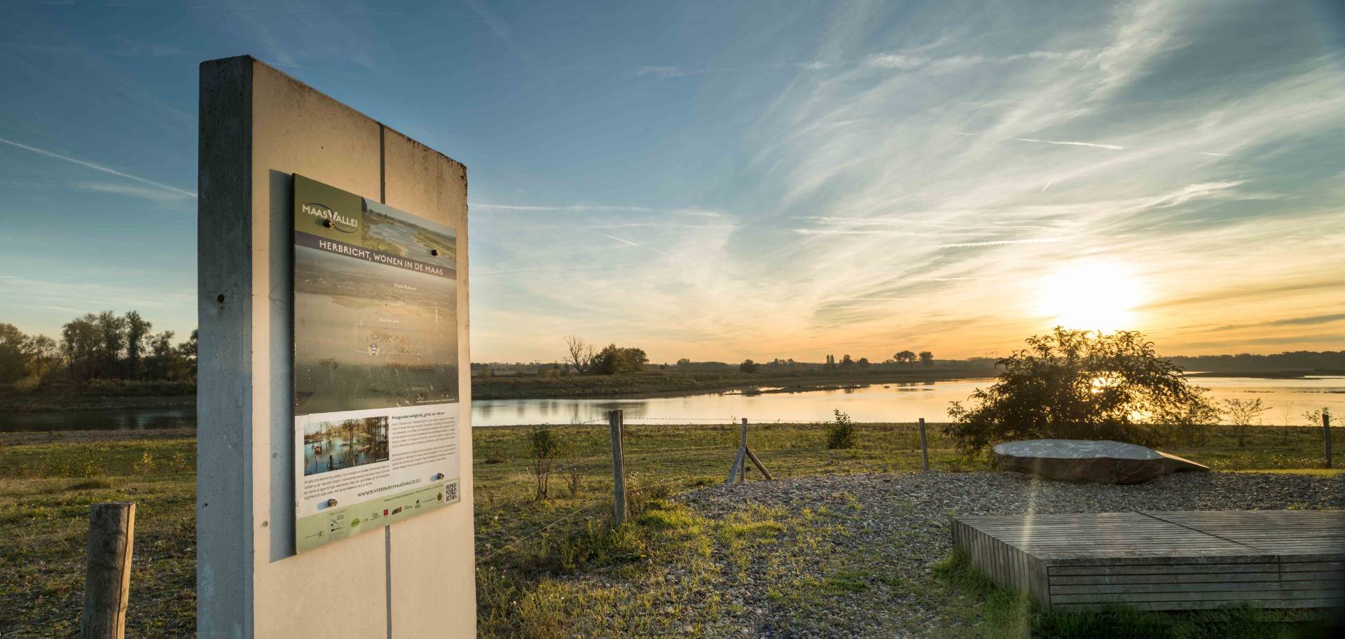 Ook verderop herinnert de Maas ons aan haar onstuimigheid. Aan een bocht in de rivier ligt Herbricht. Bij een bankje prijkt een grote luchtfoto die toont hoe het hele dorp en de wijde omtrek blank staat. Enkel de daken van de huizen en de kruinen van de bomen piepen boven het water uit, een enclave in de rivier. ‘Herbricht, wonen in de Maas’, staat er. Droogjes. Of ja, net niet. De Maas is een regenrivier: het niveau stijgt en daalt naargelang de neerslag in het stroomgebied. Regent het ’s winters pijpenstelen in de Ardennen en gutst het water er over de rotsen, dan zwelt de rivier stroomafwaarts aan. In droge zomers kan je op vele plekken dan weer naar de overkant wandelen. Door die dynamiek verlegde de Maas al tig keer haar traject. Zo lag Herbricht in de 12e eeuw nog op de andere oever, totdat een kloeke overstroming de bedding enkele kilometers verplaatste. Grillig beestje, die Maas.