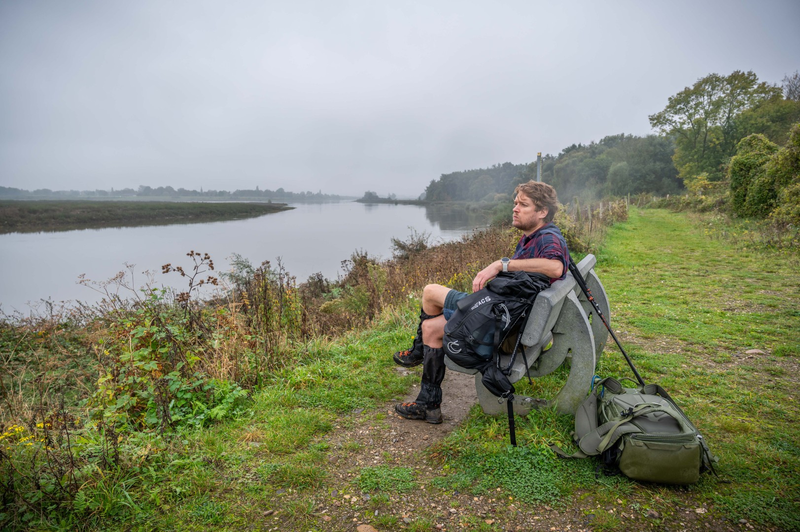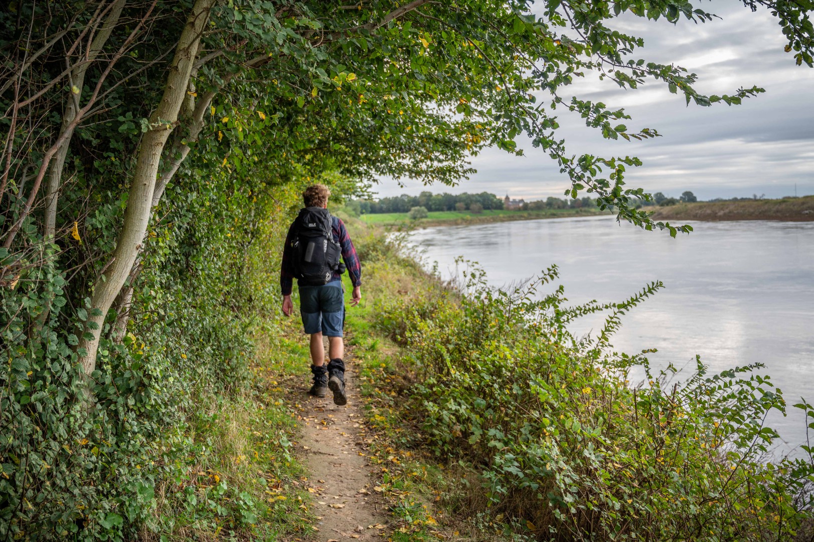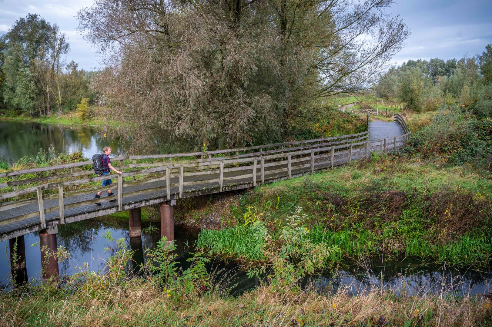 De avond ervoor zijn we laat aangekomen in Elsloo, net op het moment dat de straatlampen aanknipten en de dagjesmensen de middeleeuwse grandeur van het dorp de rug toekeerden. Daardoor komen we traag op gang. Gelukkig zorgt het park van het kasteel - onze slaapplaats - voor een zachte aanloop. Statige bomenrijen gaan eerst over in oude beukenbossen, daarna in een moeras waardoor vlonderpaden kronkelen. We beklimmen een talud vol beversporen en wandelen naast het water van een kanaal. Ter hoogte van het kasteel van Geulle aan de Maas vervoegen we de route weer.