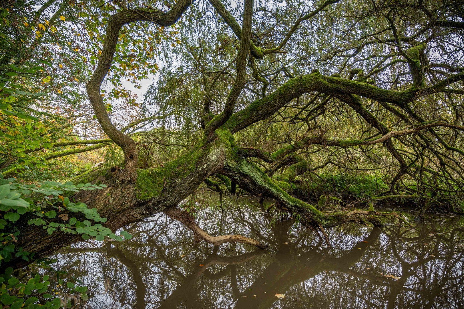 Wat verderop belanden we op een doodlopend pad. De Maas heeft er een bres geslagen; wilgen staan met de voeten in het water, het lijken wel mangroves. Deze rivier mag dan stokoud zijn - meer dan 320 miljoen jaar, volgens sommige bronnen de oudste permanente rivier ter wereld - maar ze is verre van statisch. De Maas leeft en beweegt. Bij elk vrij wandelgebied wacht een waarschuwing: het water kan snel stijgen, betreden op eigen risico. Aan de kant van het water staan reigers stokstijf, als monniken. Terwijl Rudi een panorama schiet, valt op hoe stil het is. Als de zwarte kraaien zich even gedeisd houden, hoor ik een paard in de wei gras uitrukken.