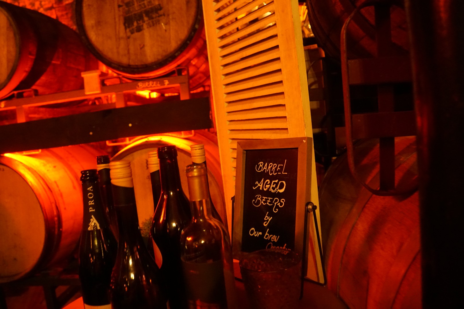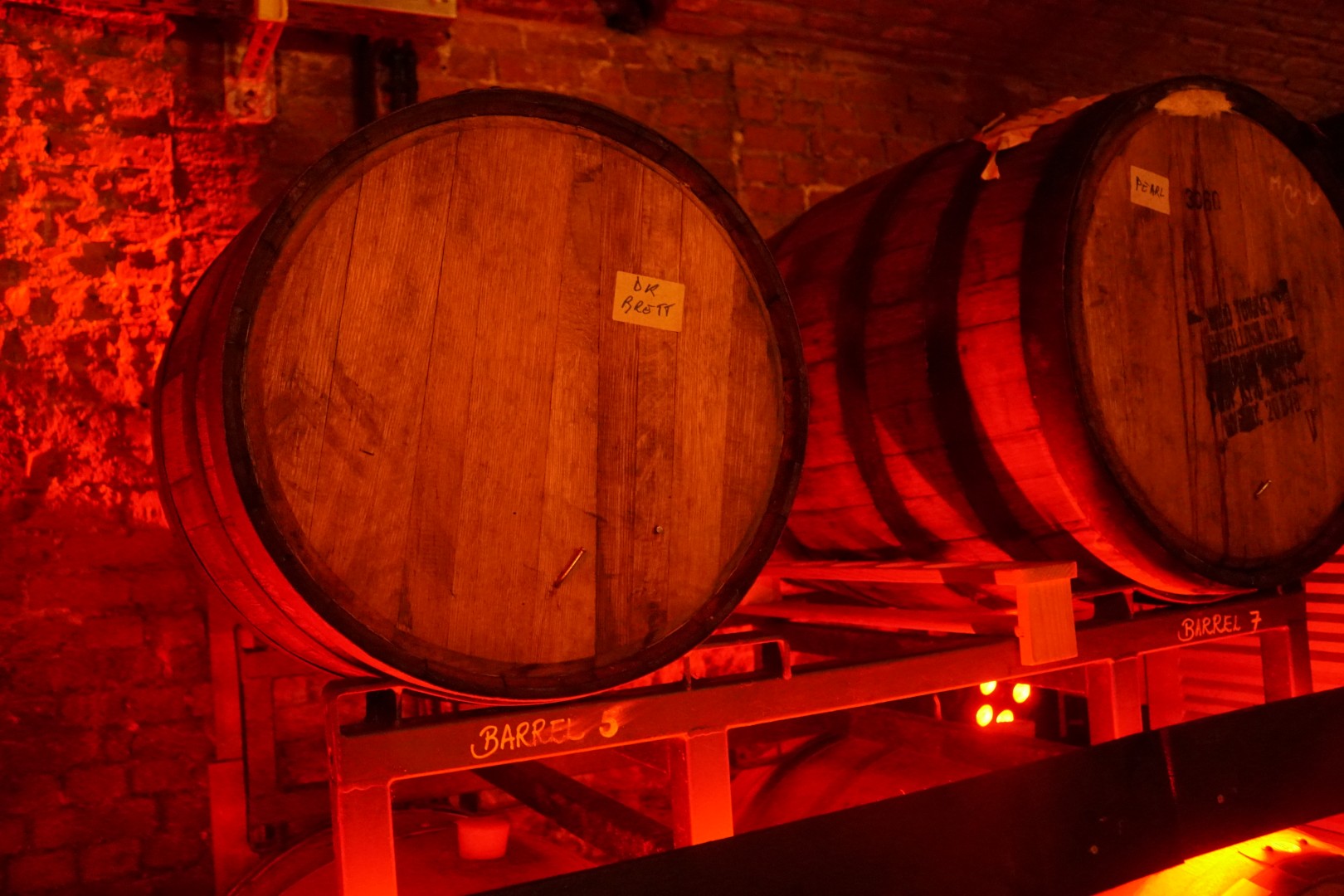 Sven mag dan wel sitemanager zijn, het brouwen bruist nog steeds door zijn aderen. Als toemaatje neemt hij me mee naar de kelder. Het lijkt of we in een teletijdmachine naar de jaren 1920 zijn gestapt. Het enige anachronisme is de muziek van Barry White die zachtjes op de achtergrond speelt. Achter de toog staan negen vaten. ‘Het zijn mijn experimenten. In dit portovat bijvoorbeeld rijpt een Imperial Stout. We pakken er graag mee uit op bierfestivals.’
