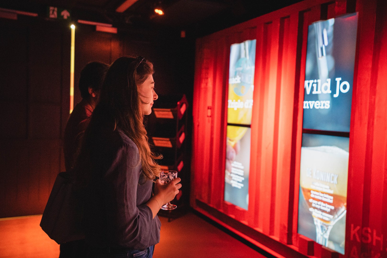 Elke bezoeker krijgt een vol proefglas mee. Er komt geen gids aan te pas. Sven en ik scannen een QR-code waarna een poort openschuift en we in een container stappen. ‘Doorheen het hele bezoek ligt de nadruk op de ‘experience’, de beleving. Je stapt op eigen tempo door elk van de twaalf themaruimtes.’