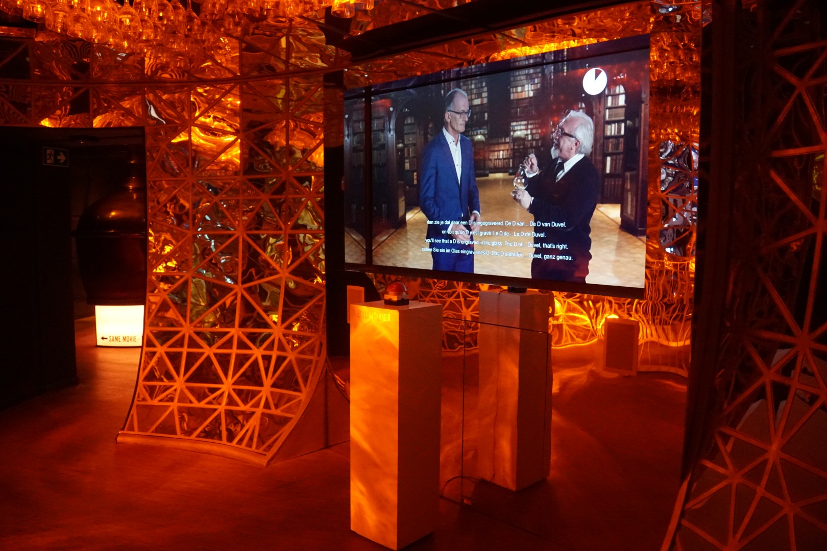 We stappen via een passerelle door de nu verlaten brouwzaal. Aan het plafond hangen Bollekeglazen met een luidspreker in. Ik hou een glas tegen mijn oor en hoor zo Sven over het brouwproces vertellen. De tour eindigt met een interactieve kwis, geleid door Modeste Van den Bogaert.
