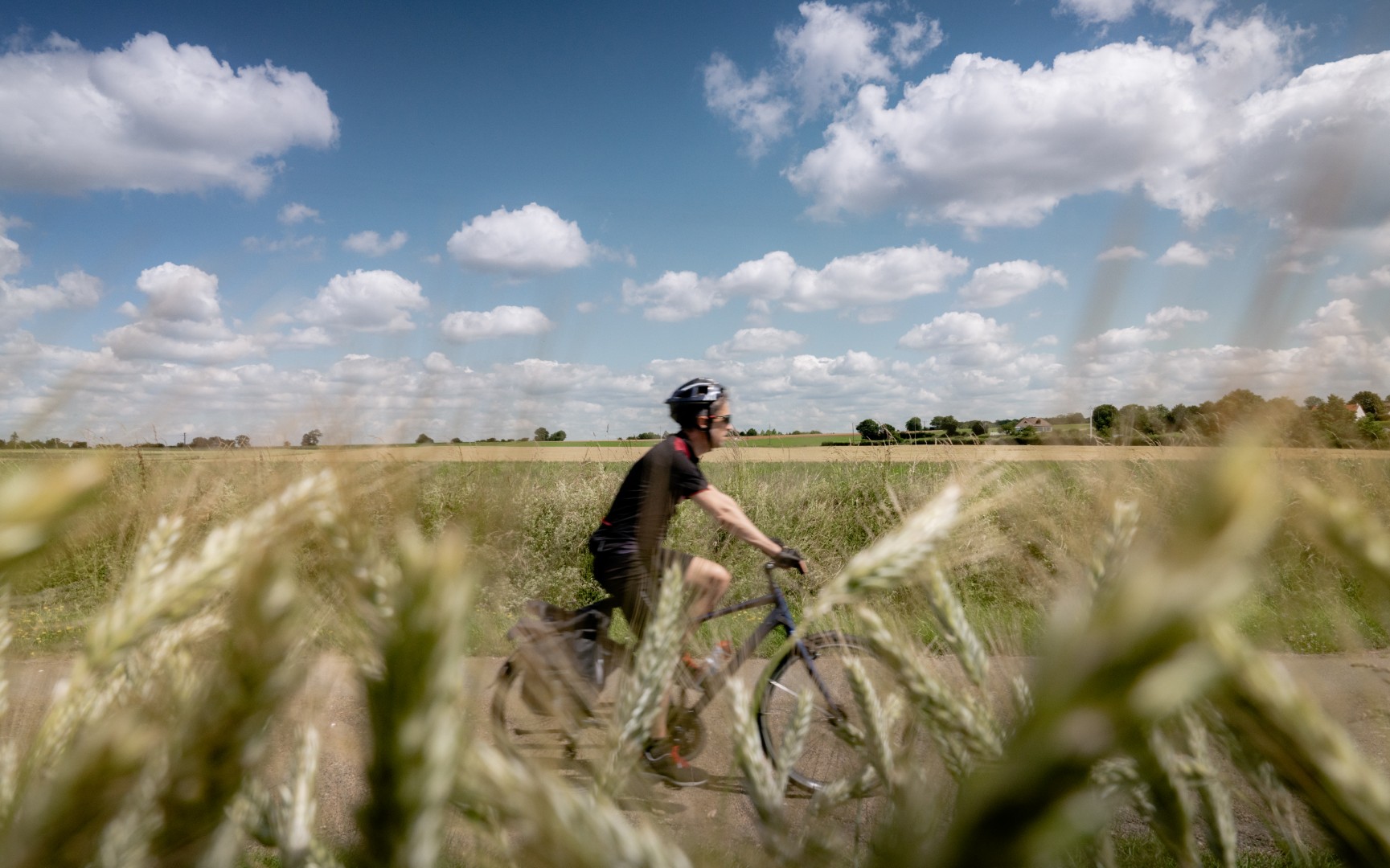 Na de lunch wacht een klim van twee kilometer. Wie geduldig fietst, kan zo’n colletje wel aan. In de vallei van de Sarthe wisselen bossen, boomgaarden en weilanden elkaar af; op de heuvelruggen ontvouwen zich weidse graanvelden. Hagen en grachten zomen de smalle landwegen af. Het landschap doet me aan de Voerstreek denken, maar hier is meer ruimte. Zo veel ruimte dat je de wind ziet waaien. Dorpjes heten meestal ‘sur-Sarthe’. Ze ontlenen hun identiteit aan de kronkelende rivier, die we twee dagen zullen volgen.