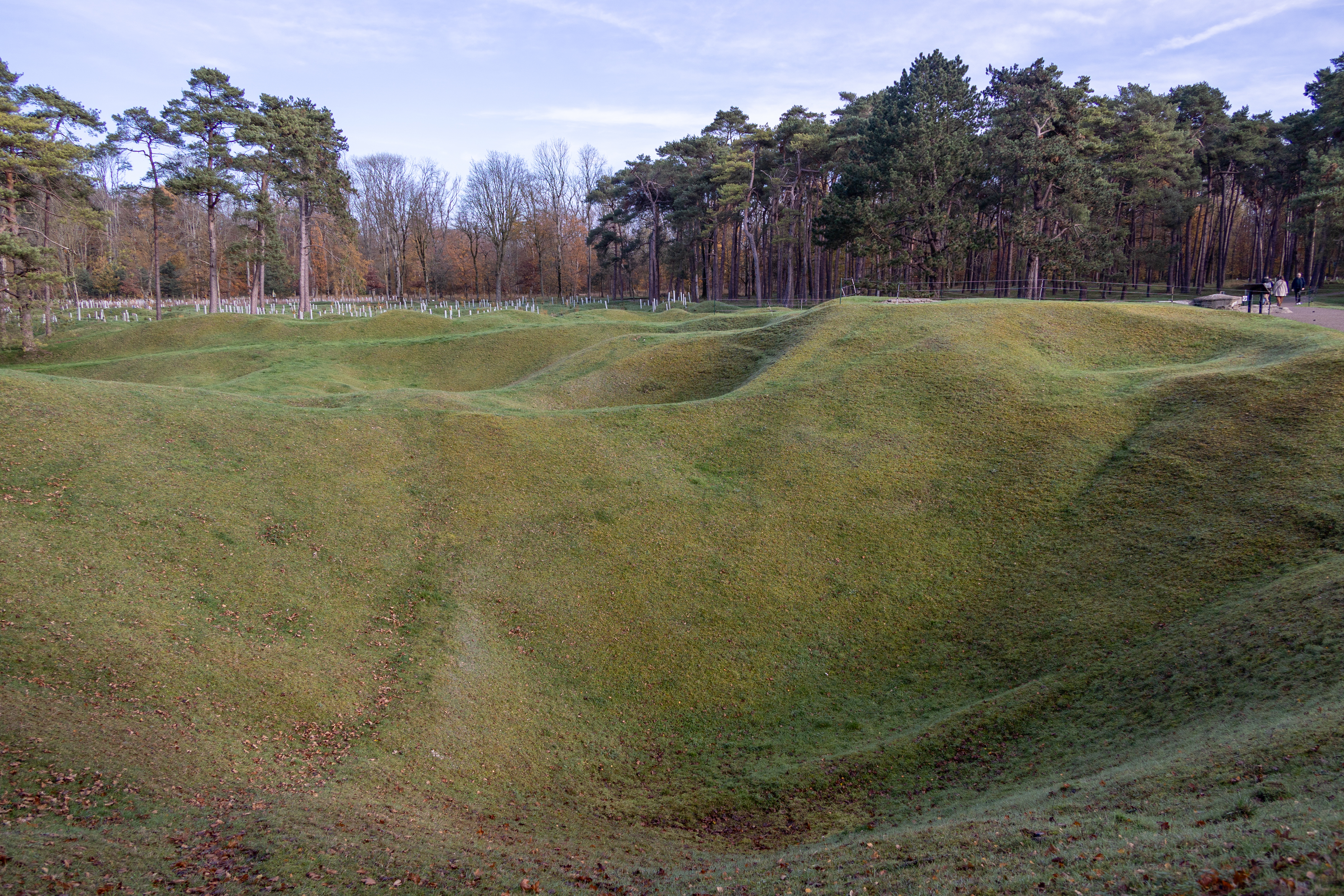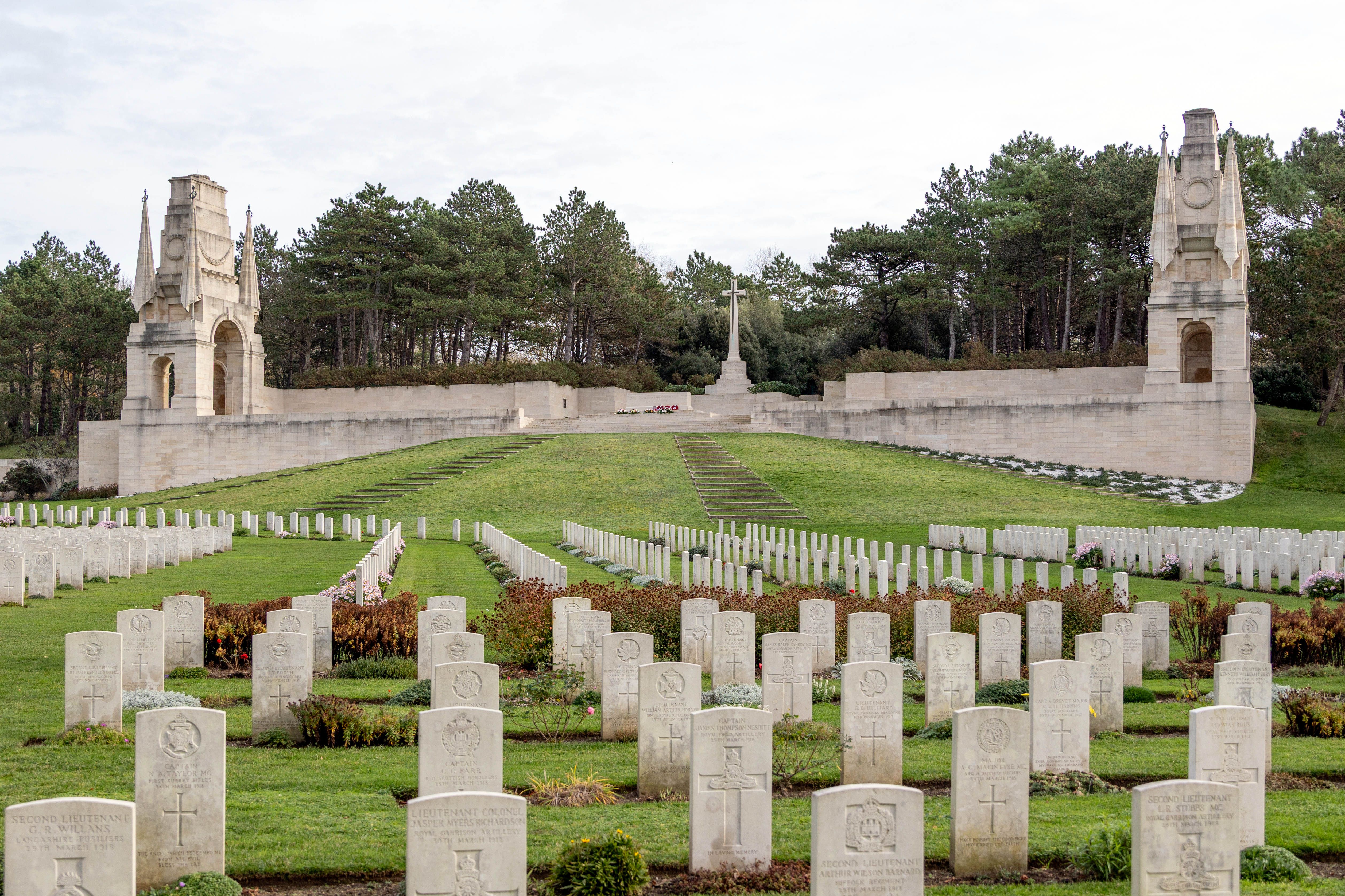 Étaples lag tijdens de Eerste Wereldoorlog net achter het front en groeide uit tot een van de grootste medische zones van het hele Westelijk Front. In de vallei stond een aaneenschakeling van veldhospitalen waar dag en nacht gewonden werden opgevangen: mannen die door gas, granaatscherven, infecties of van pure uitputting geen stap verder konden. Het lawaai van de oorlog hoorde je hier niet meer, maar de gevolgen ervan lagen er in rijen te wachten. Hier liggen niet alleen slachtoffers van de grote offensieven, maar ook soldaten die pas weken of maanden na de wapenstilstand stierven. Jongens die het einde hadden gehaald, maar niet het herstel. Longen die door gas waren dichtgeschroeid, lichamen die te veel hadden gezien en te weinig konden dragen. In de rijen witte stenen zie je dezelfde data, dezelfde regimenten, dezelfde leeftijden die te jong zijn om te bevatten. De orde van de graven staat in contrast met de chaos waarin deze mannen hun laatste uren doorbrachten.