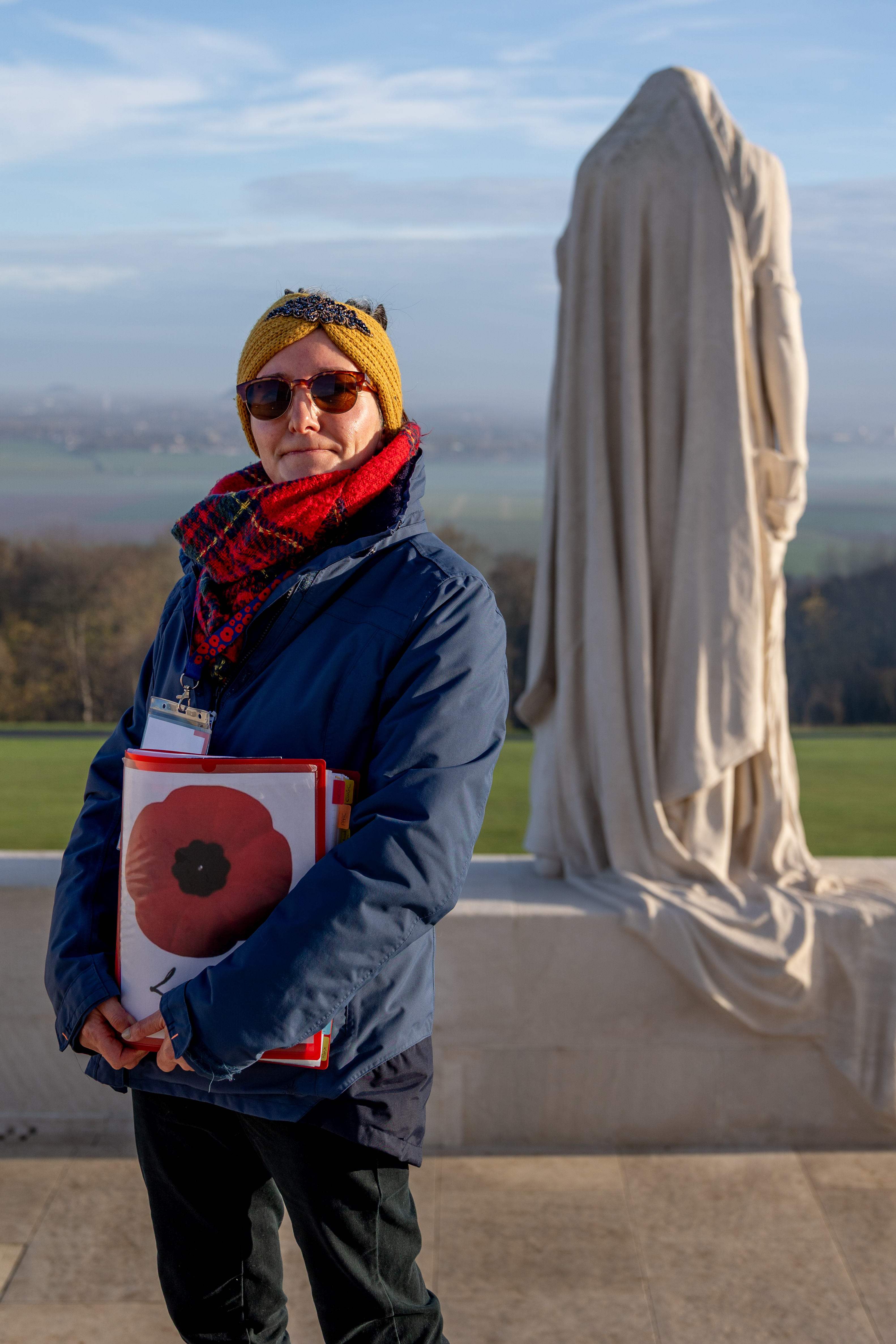 De heuvelrug van Vimy verschijnt in nevel. Het Canadian National Vimy Memorial staat boven op de rug alsof het uit de kalksteen zelf is gegroeid. Twee hoge zuilen rijzen op uit een brede sokkel, elk hoger dan je verwacht wanneer je ernaartoe wandelt. Ze vertegenwoordigen Frankrijk en Canada, verbonden in stilte. Aan de voet staan gebeeldhouwde figuren die geen heldendom verkondigen. De bekendste, Canada Bereft, kijkt gebogen uit over het terrein, een vrouw die rouwt om zonen die nooit terugkeerden. Het toont wat oorlog kost. Op de muren rond de sokkel staan meer dan 11.000 namen van Canadese soldaten zonder gekend graf. De namen golven verder, een generatie die alleen door steen kon worden tegengehouden van opnieuw uit het geheugen te worden gewist. Rond het monument liggen loopgraven en kraters die als littekens in het gras liggen. De honderd jaar ertussen hebben niets gladgestreken.