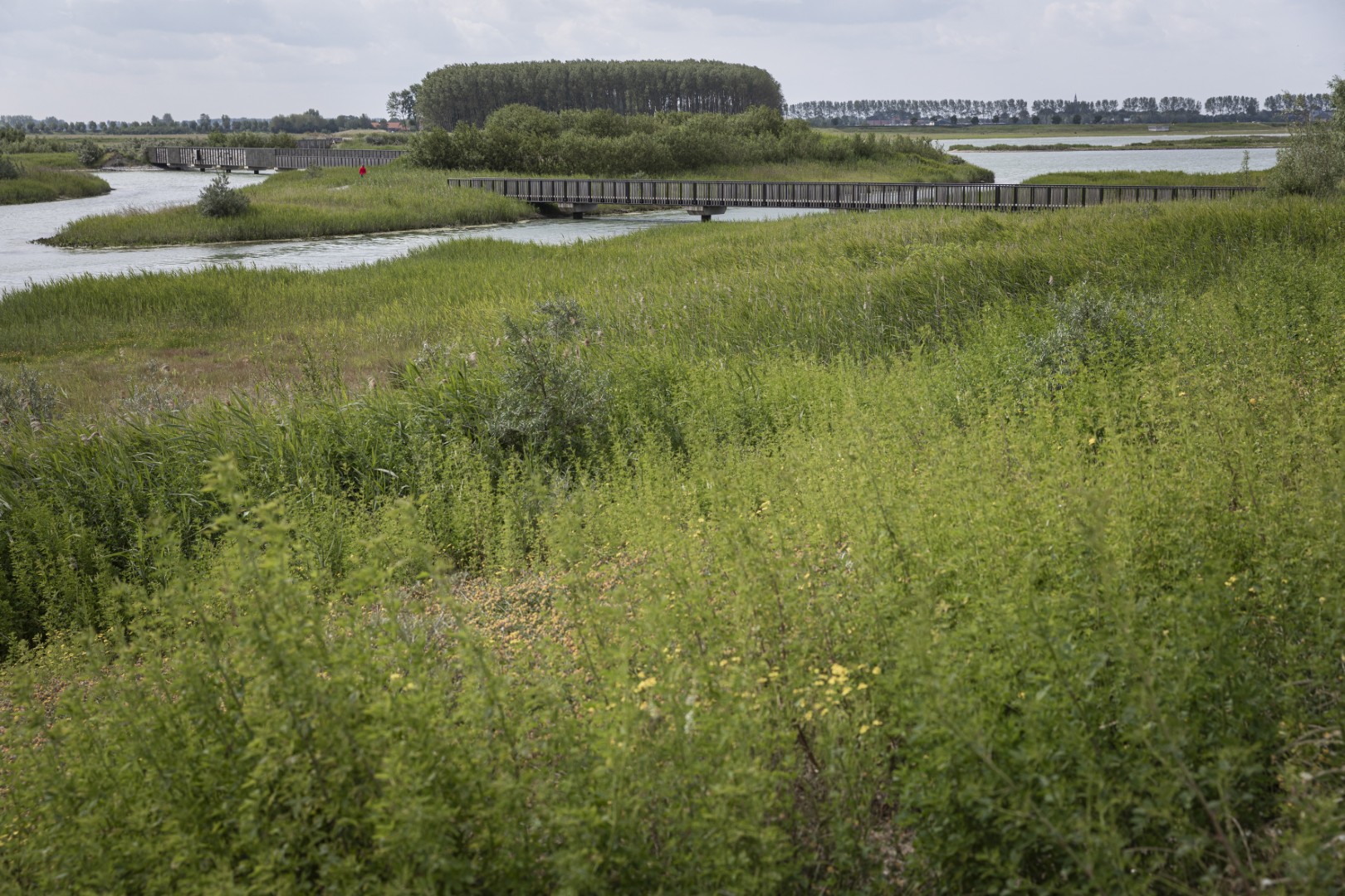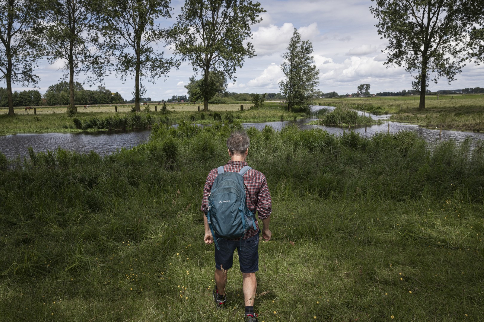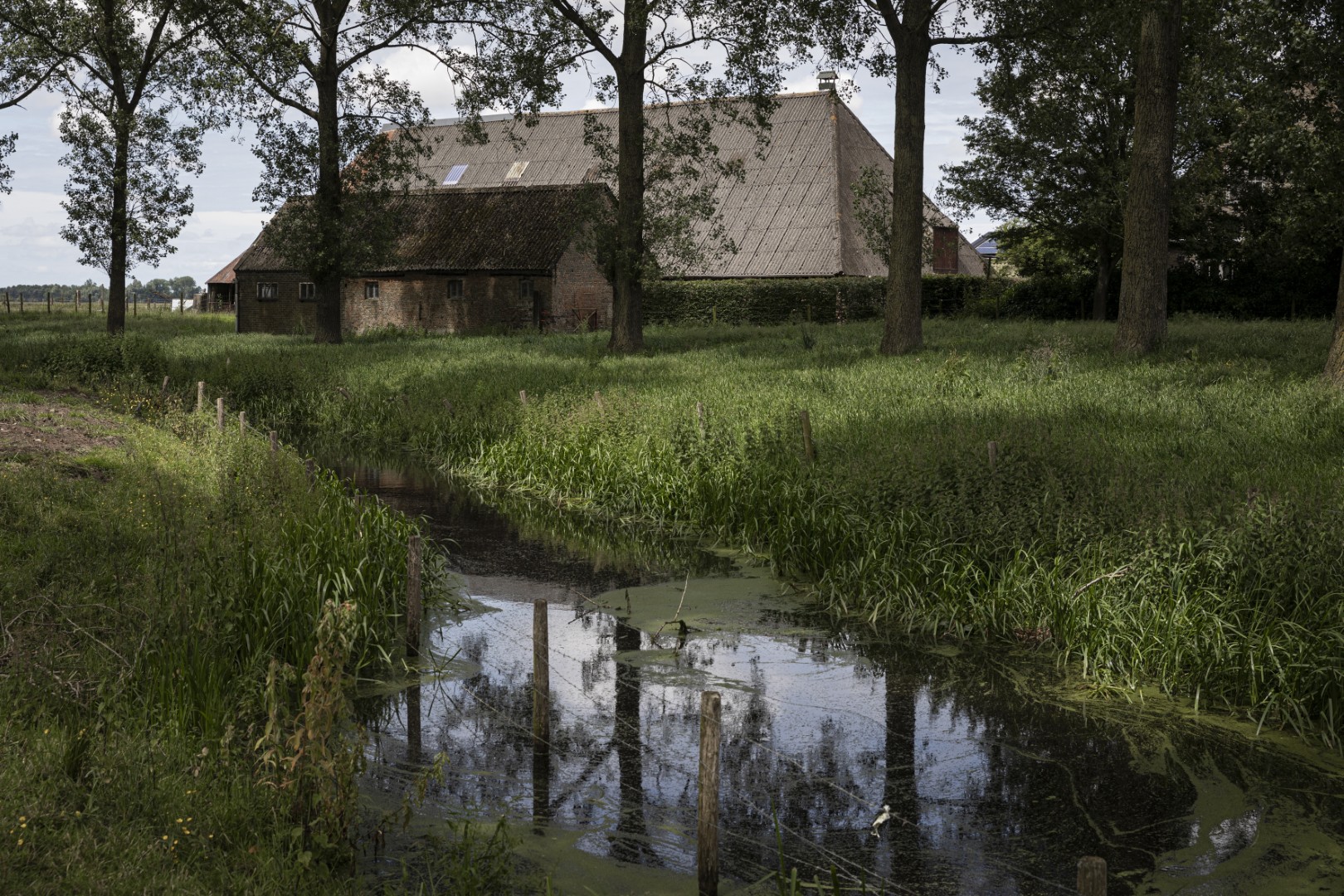 Na de rode, witte en rosé geproefd te hebben, heb ik energie voor een lange wandeling. We gaan de biezen in! De lange bomenrij ten noorden van Ronalds huis verbergt de Eeklose Watergang. Het laddertje over de omheining brengt me in een besloten paradijs. Ik baan me een weg door het hoge gras onder de populieren. Het kronkelende stroompje dat ik volg, is in 1300 gegraven als turfvaart en in 1621 vervormd door een grote overstroming. Waar de koeien grazen, liep een bevaarbaar kanaal. De turf werd in Eeklo gestoken en naar Aardenburg gebracht.