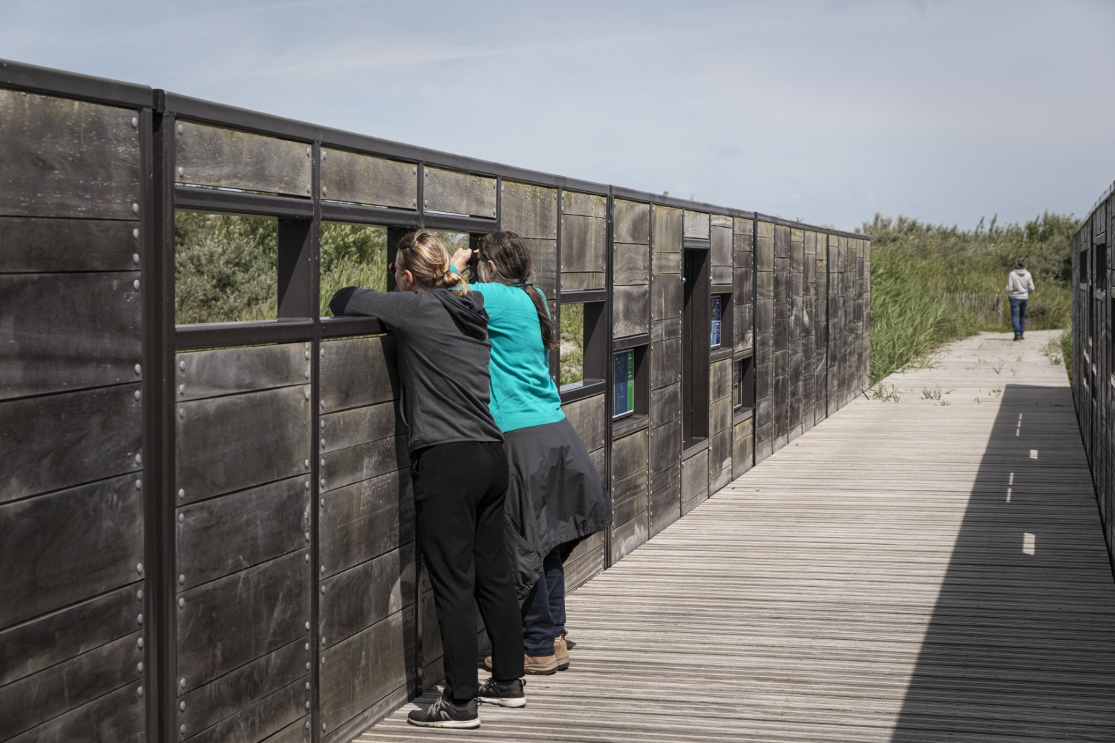 In de centrale waterplas hangen oestermandjes aan lange lijnen. Een waterrad op zonne-energie voert zuurstofrijk water aan. De opstelling test een nieuwe teeltmethode uit. We volgen de 4,5 km lange Zeekraalroute, die door de slikken en schorren leidt. Zo kan je alle fasen in het samenspel tussen en zeewater en land beleven. Onzichtbare leeuweriken jubelen hoog aan de hemel. Steltlopers zoeken op de tast naar voedsel in het slik. Met de verrekijker speuren we naar lepelaars. In het hoge riet verschuilen zich zangvogeltjes. Grondbroeders maken hun nesten op kunstmatige eilandjes in de waterplas. ‘Meeuwen en sternen nestelen er samen’, vertelt Dilia. ‘De zwartkopmeeuw beschermt de stern. Let op, dat is geen kokmeeuw. Die heeft een bruine kop.’