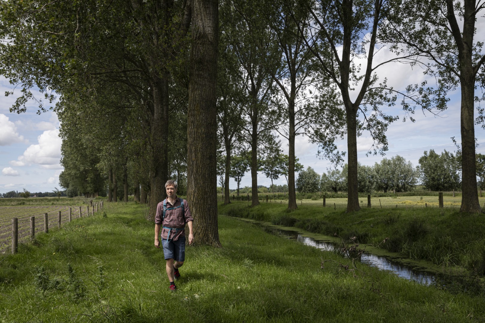 De watergang brengt me naar de Belgische grens. Op de terugweg wandel ik langs Sint-Kruis, zo’n typisch Zeeuws dorpje waar de straten geplaveid zijn met rode klinkers en de huizen disproportioneel grote vensters hebben, alsof ze grote ogen opzetten. Het dorpje ligt naast een met knotwilgen omringde kreek. Ronald had er een frappant weetje over. ‘Op onze zandgrond zijn hun stammen donker. Wat verderop zijn ze bleker. Daar had je vruchtbare kleibodem en grote herenboerderijen. Bij ons bracht de aarde minder op. Wij waren de arme drommels op het zand.’