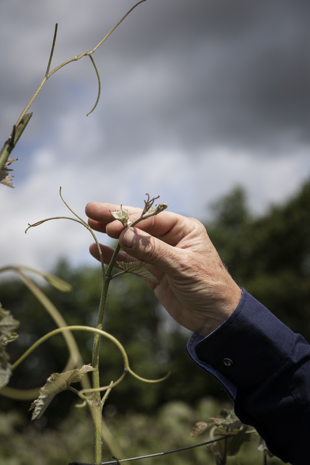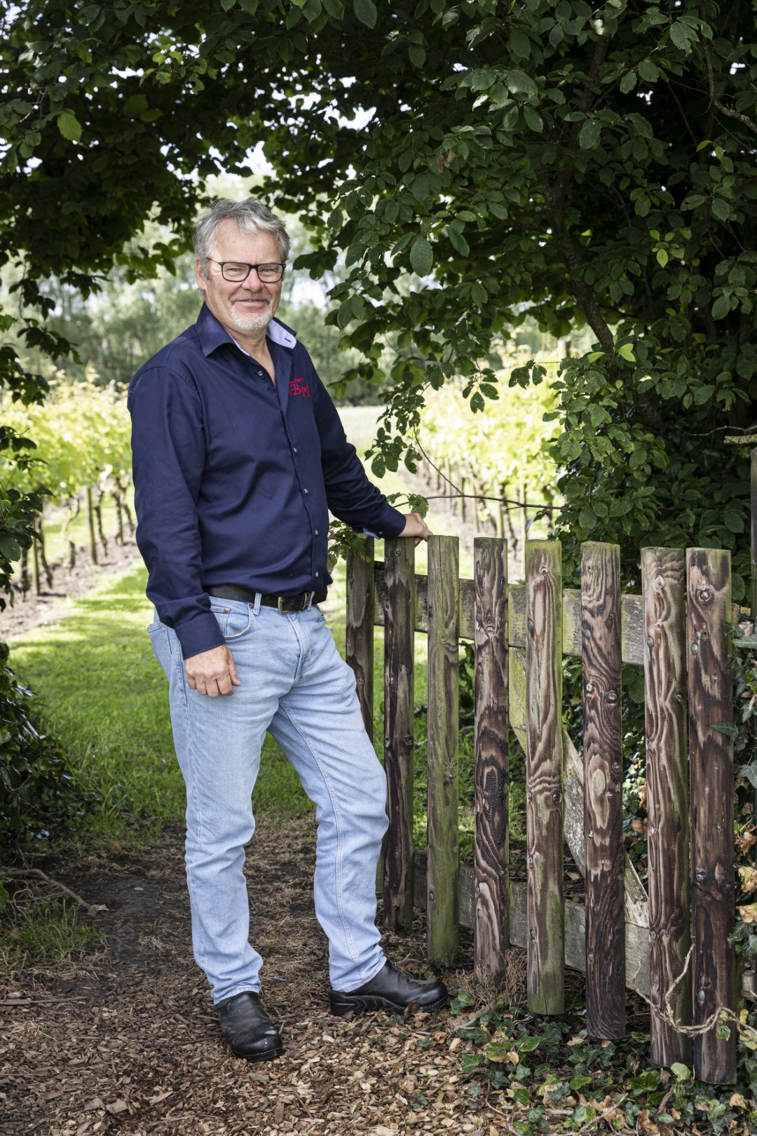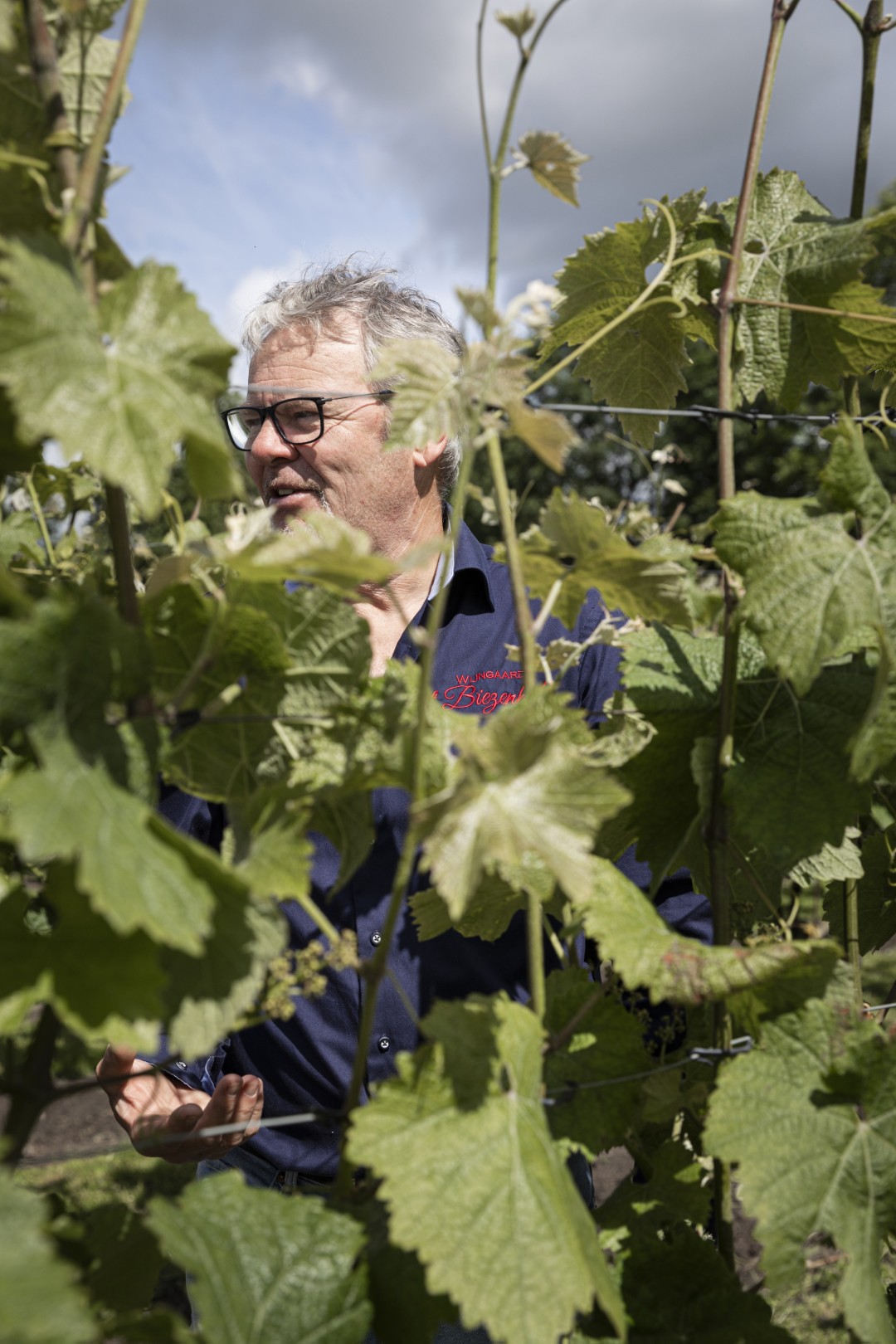 Via een doorgang in de haag leidt Ronald me naar de wijngaard. Zijn grootste vijand is schimmel, vertelt hij. Door de zandgrond en het vochtig klimaat. Dus lopen zijn druivenrijen van noord naar zuid, groeien de druiven wat hoger boven de grond en zijn ze van Duitse, schimmelresistente rassen (Johanniter, Solaris en Monarch). ‘De zon en de wind moeten de wijngaard kunnen drogen. We wieden ook altijd op tijd het onkruid.’