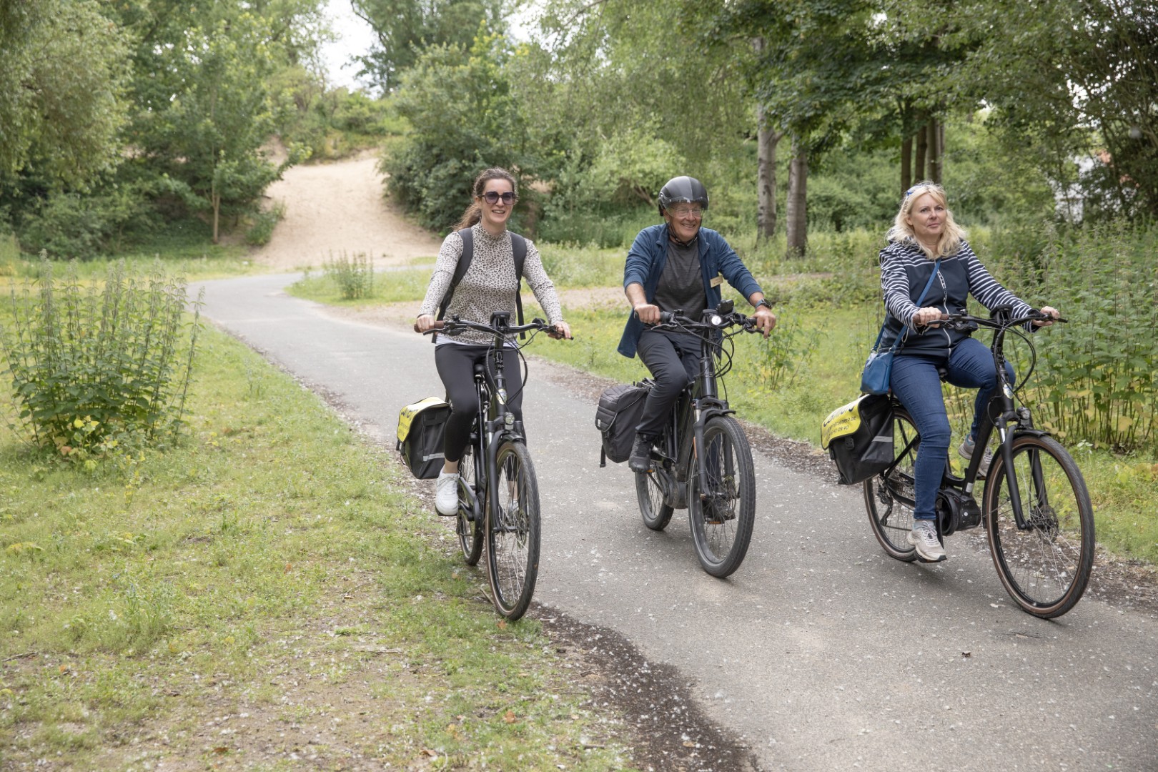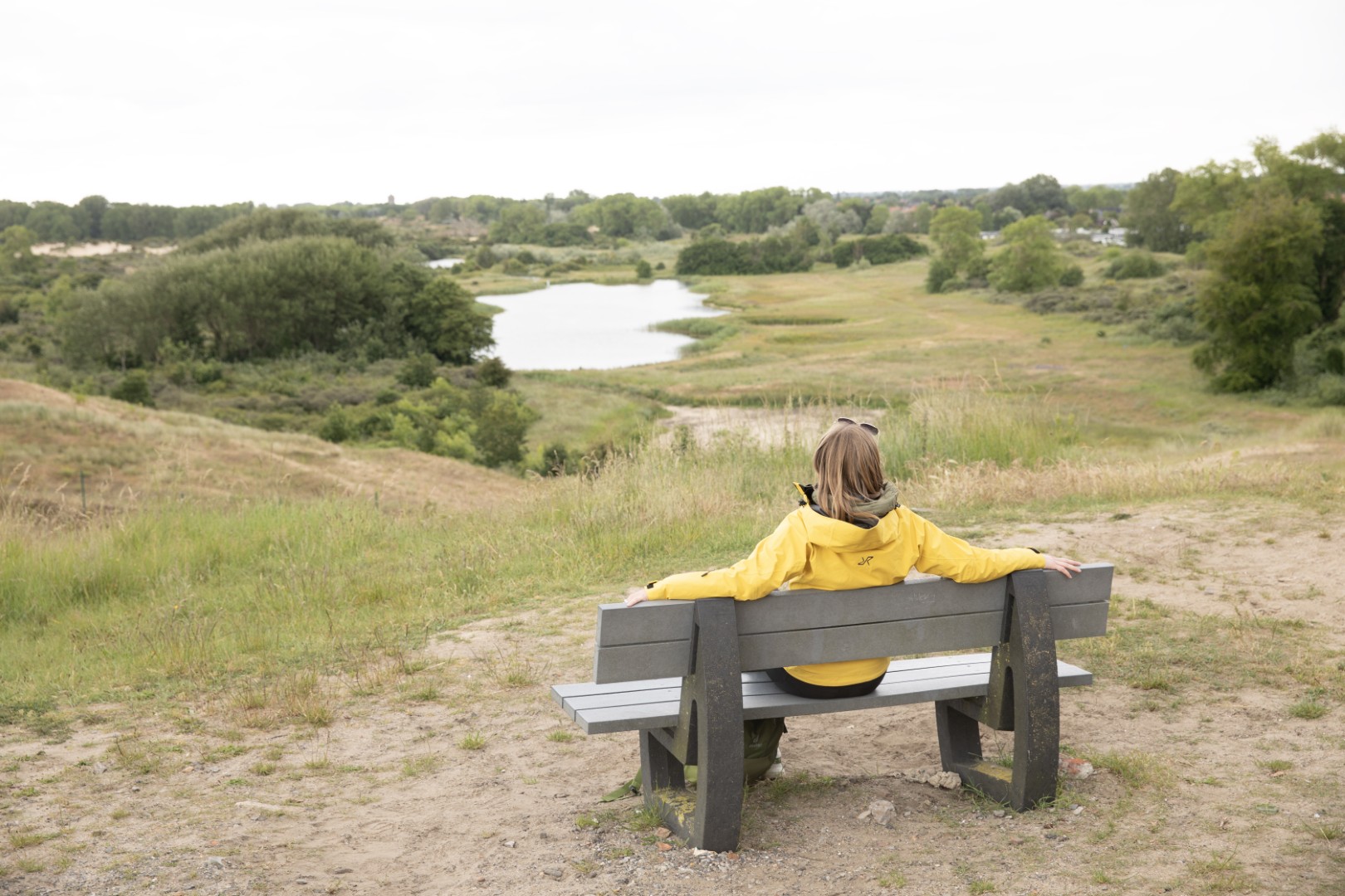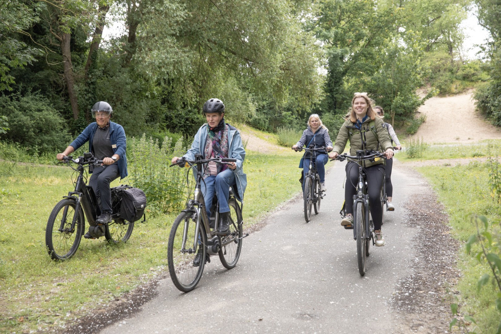 Over een breed pad voor wandelaars en fietsers rijden we dwars door de ongerepte natuur van de Doornpanne, met op het einde een klimmetje want daar ligt het letterlijke én figuurlijke hoogtepunt van de tocht: de Hoge Blekker. Hij ligt in de zon te blinken (of te blekken in het lokale dialect), 33 meter hoog. Wat een mooi panorama! Met de Hoge Blekker achter ons zien we voor ons natuurgebied de Doornpanne in de diepte. Hier rusten we uit op een bankje, voor we onze rijwielen inleveren voor nieuwe wieltjes.