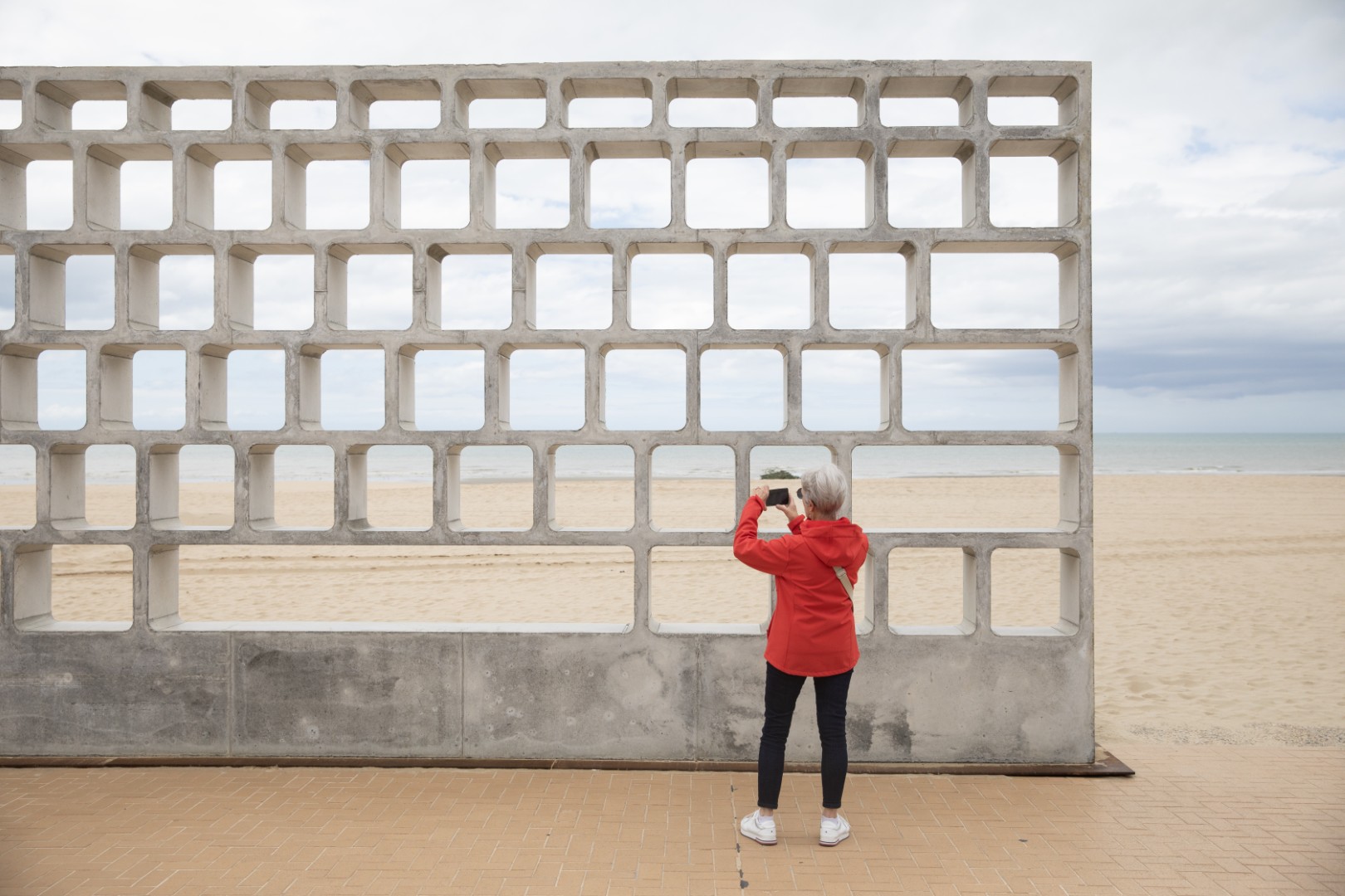 Een van de volgende haltes op de dijk is een reuzengrote rechthoek met venstertjes, dat ik pas na een tijdje herken als een toetsenbordklavier. Dit moderne kunstwerk All the words in the world van Jorge Macchi staat hier sinds de voorbije triënnale Beaufort 2024. De expo zet elke drie jaar een zomer lang moderne kunst langs de hele kustlijn, soms op wat ‘verdwaalde’ plaatsen. Veel kunstwerken blijven ook na de expo staan. Zo zien we op de Zeedijk ook nog een groot rechtopstaand kruis, dat blijkbaar de plattegrond is van de verdwenen kerk van de vroegere Abdij Onze-Lieve-Vrouw Ten Duinen, op een boogscheut van hier. Het kunstwerk werd opgericht voor Beaufort 2003 door het Franse kunstenaarskoppel Anne en Patrick Poirier.