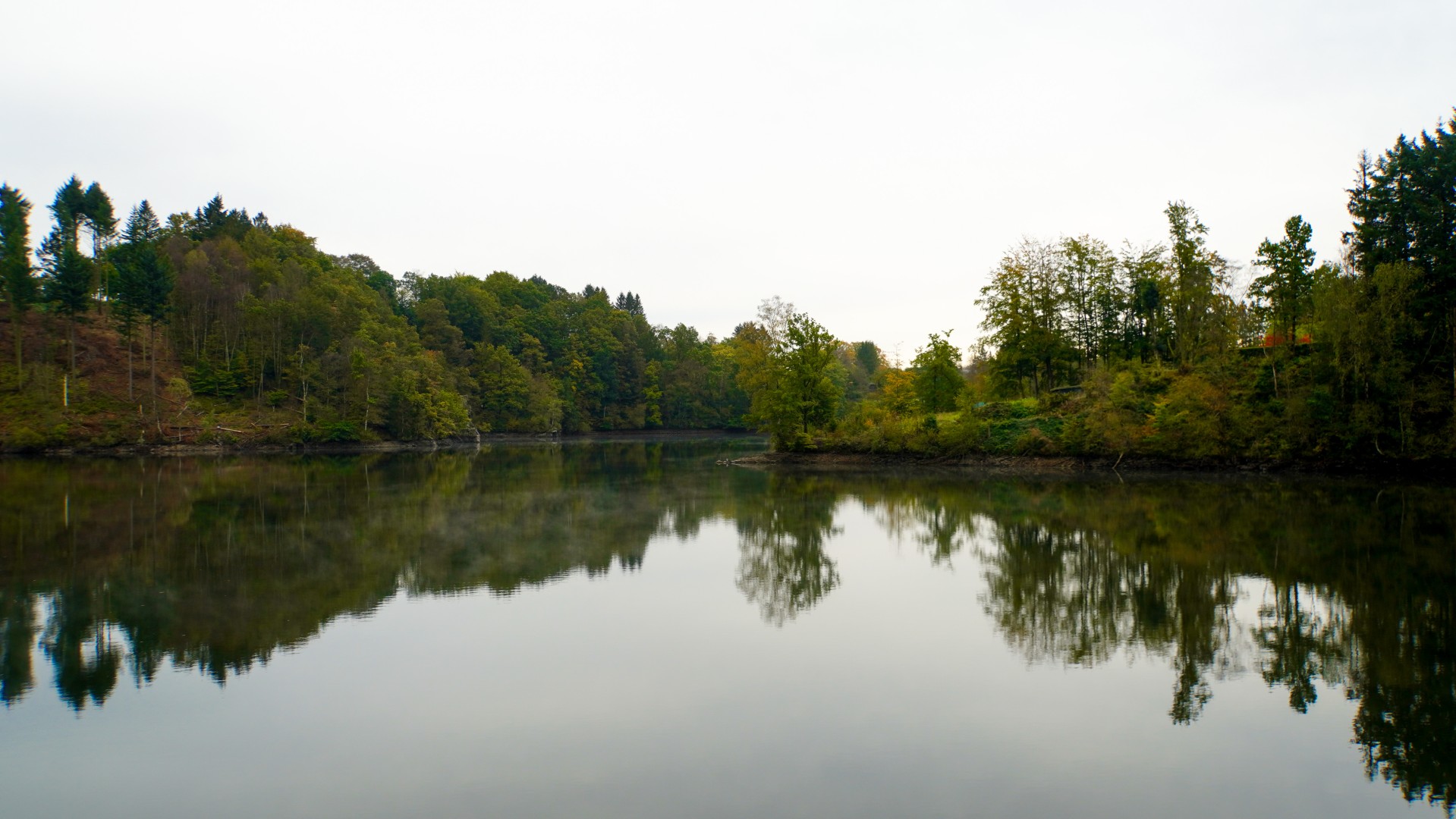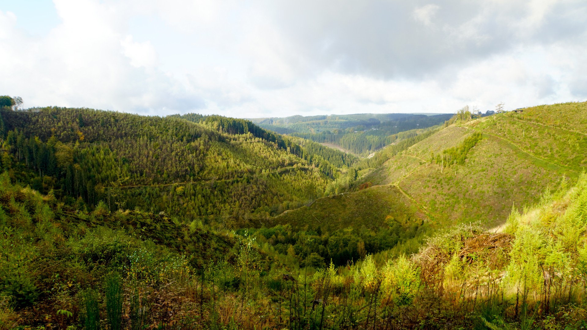 De eerste kilometers voeren me door het Preusbos, waar de herfst zich al laat voelen. Varens kleuren warm oranje, vlinders fladderen door het zonlicht, mezen huppen van tak naar tak, en het licht dwarrelt zachtjes met de bladeren mee naar beneden. Ik voel me een gast in een perfect georkestreerd ecosysteem en laat de stilte op me inwerken. Het pad is uitstekend bewegwijzerd: een voorbode voor zorgeloos ronddwalen, terwijl de Hohnbach-rivier als een metgezel zachtjes naast me meandert.