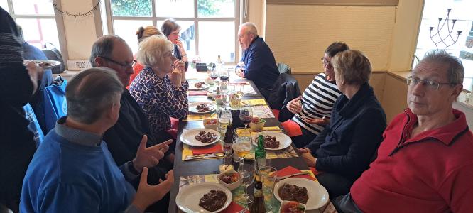 's Middags krijgen we een 2-gangen middagmaal (soep, hoofdgerecht en koffie).