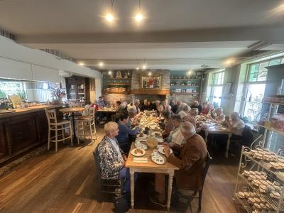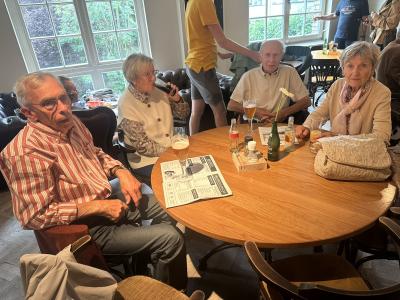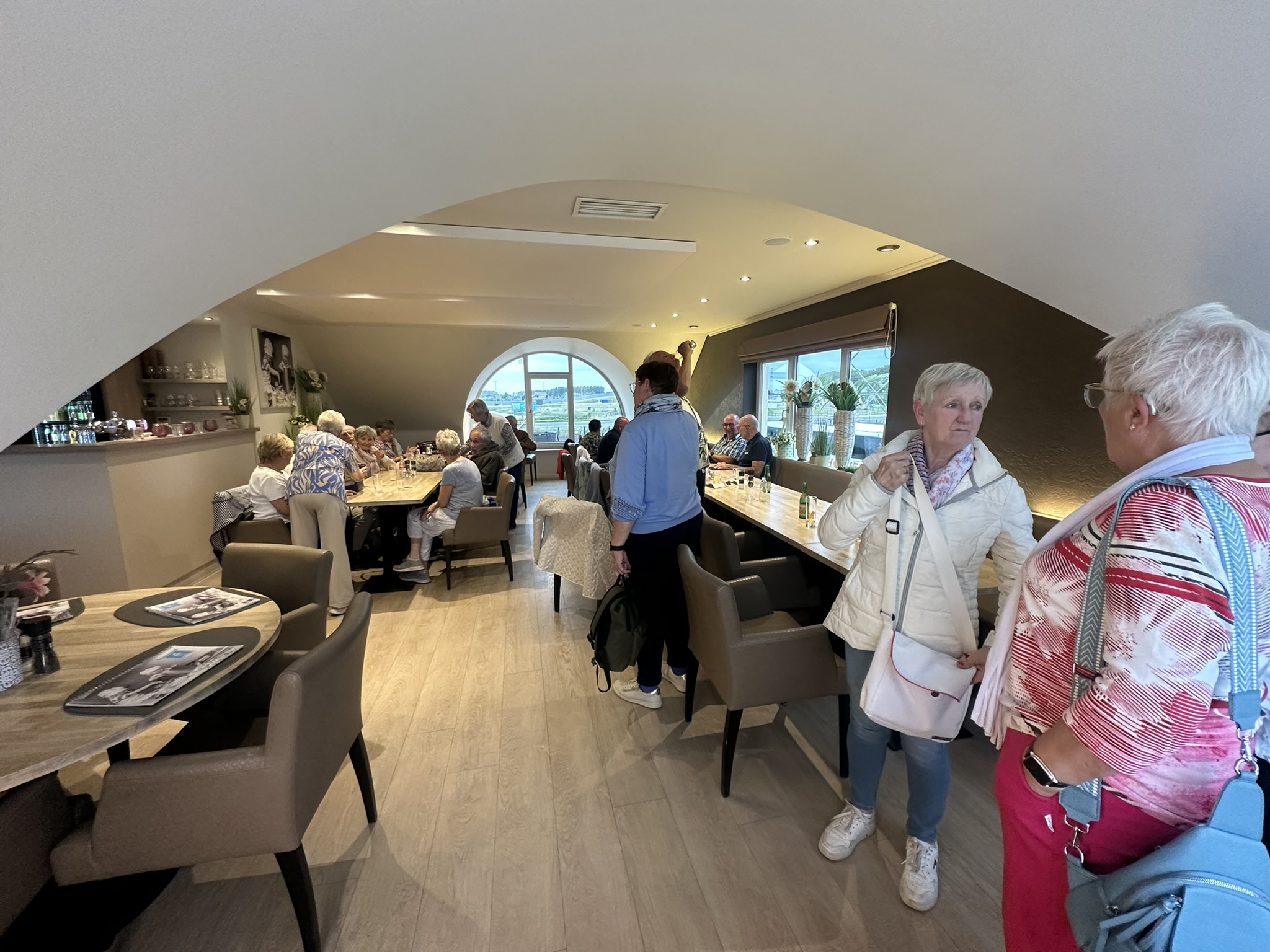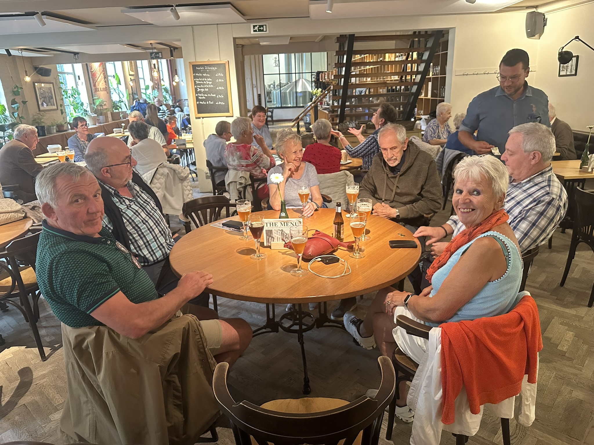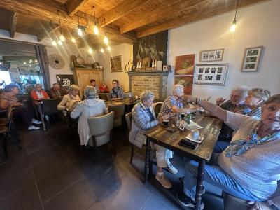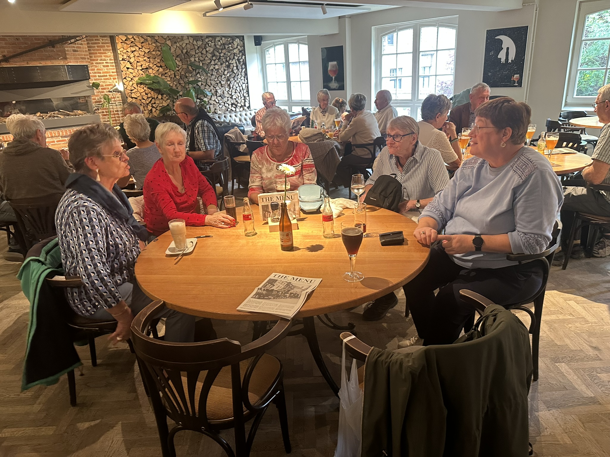 ’s Middags brengt de bus ons naar Oostkerke, waar we genieten van een warme lunch. Op de menu staat vol au vent met sla en frietjes en een dame blanche als dessert.