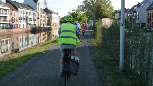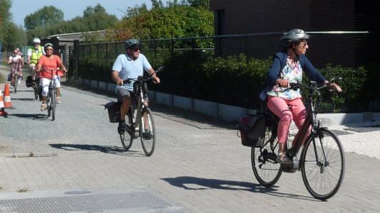 We fietsen onder begeleiding langs rustige landelijke wegen en brede wegels